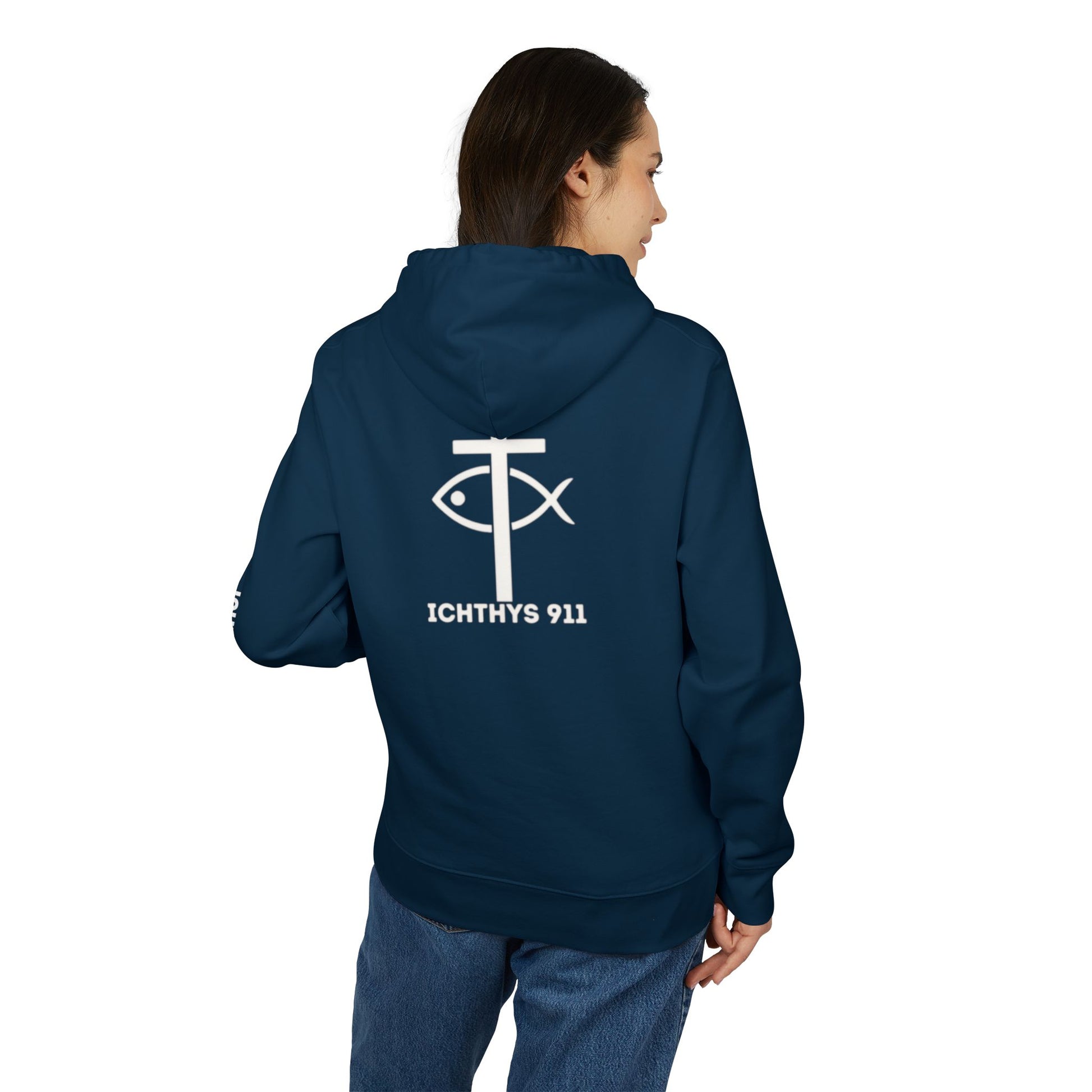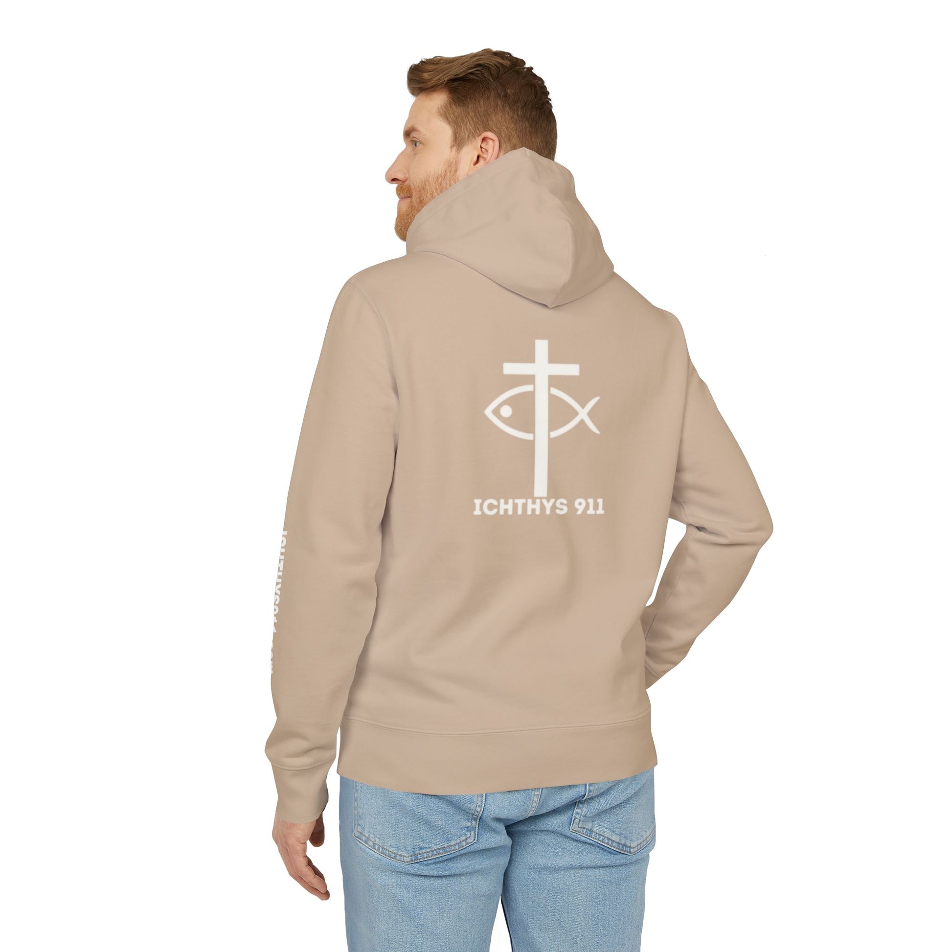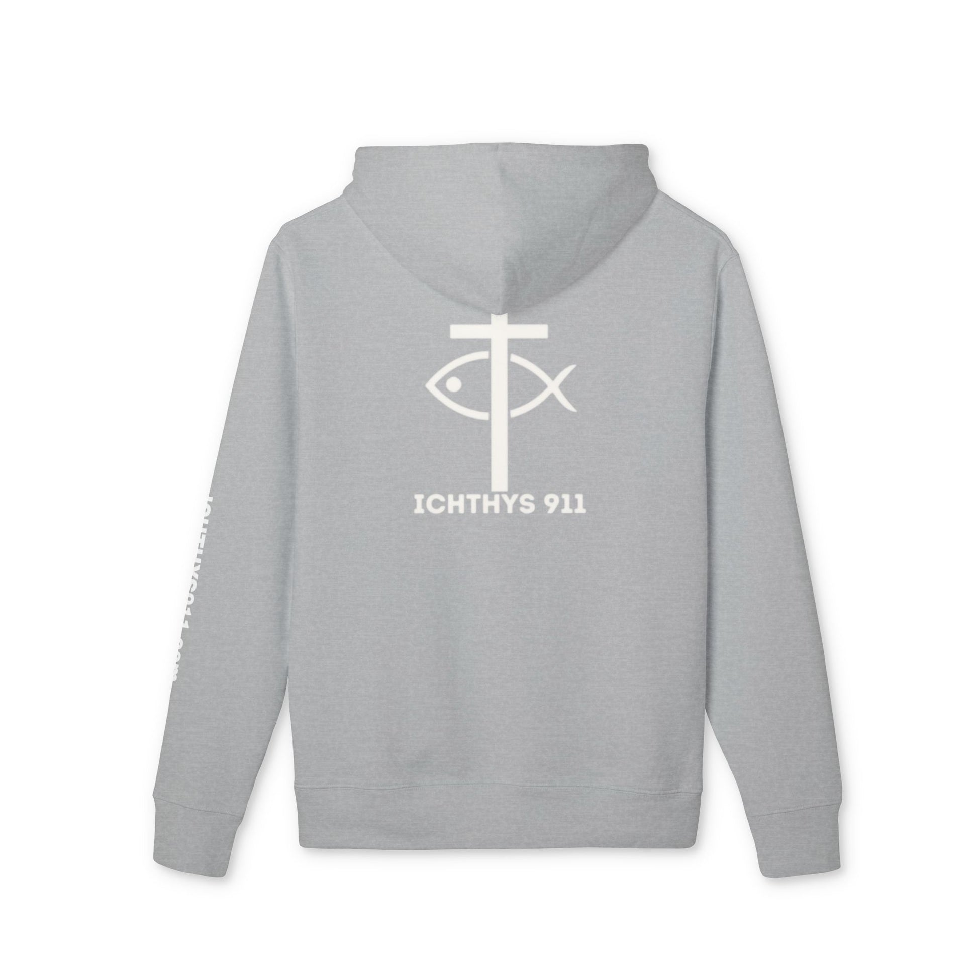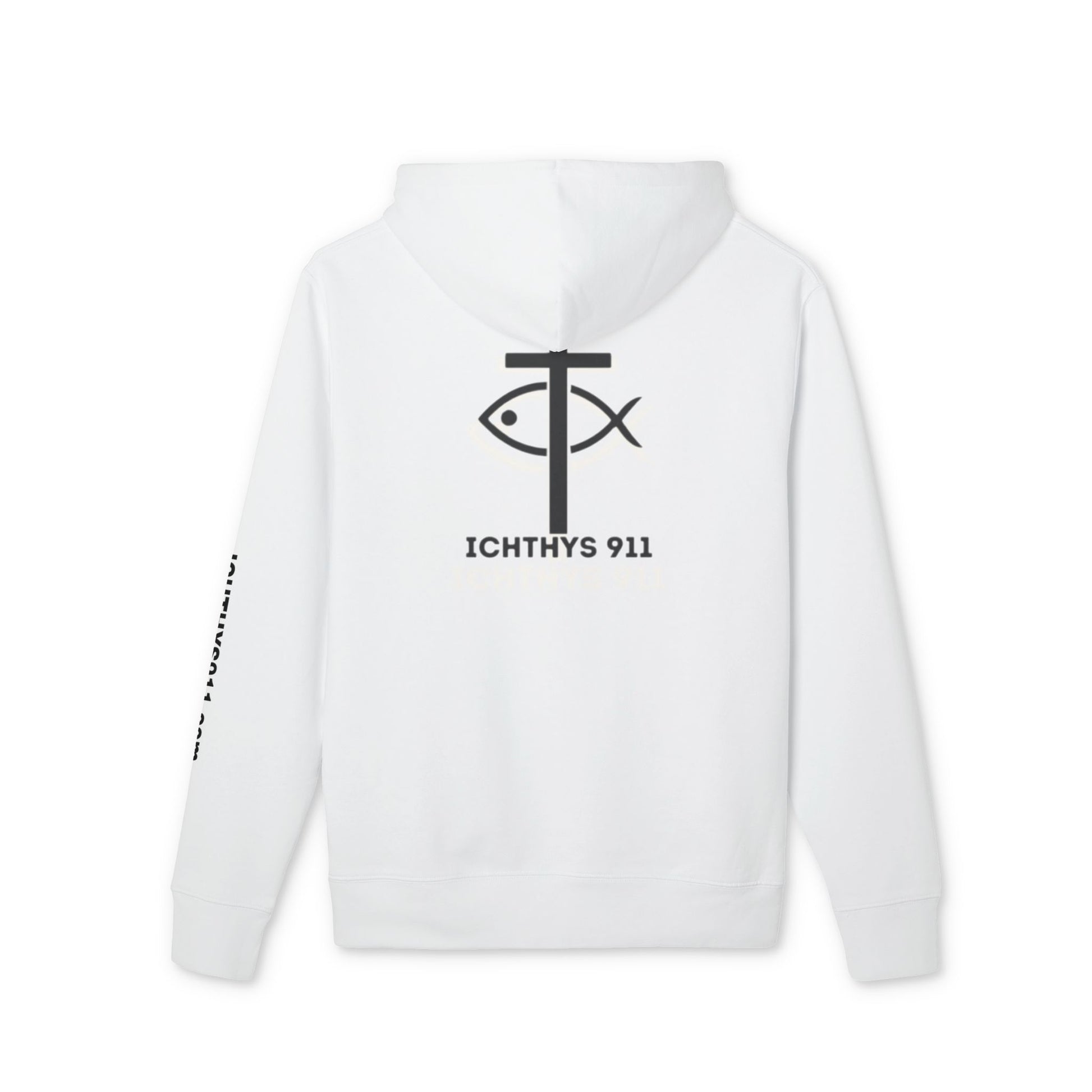 ICHTHYS 911 Hoodie – Unisex Pullover -White Font - Black Font on White - Heavy Fabric - ICHTHYS 911 Logo on Front & Back - 100% Organic