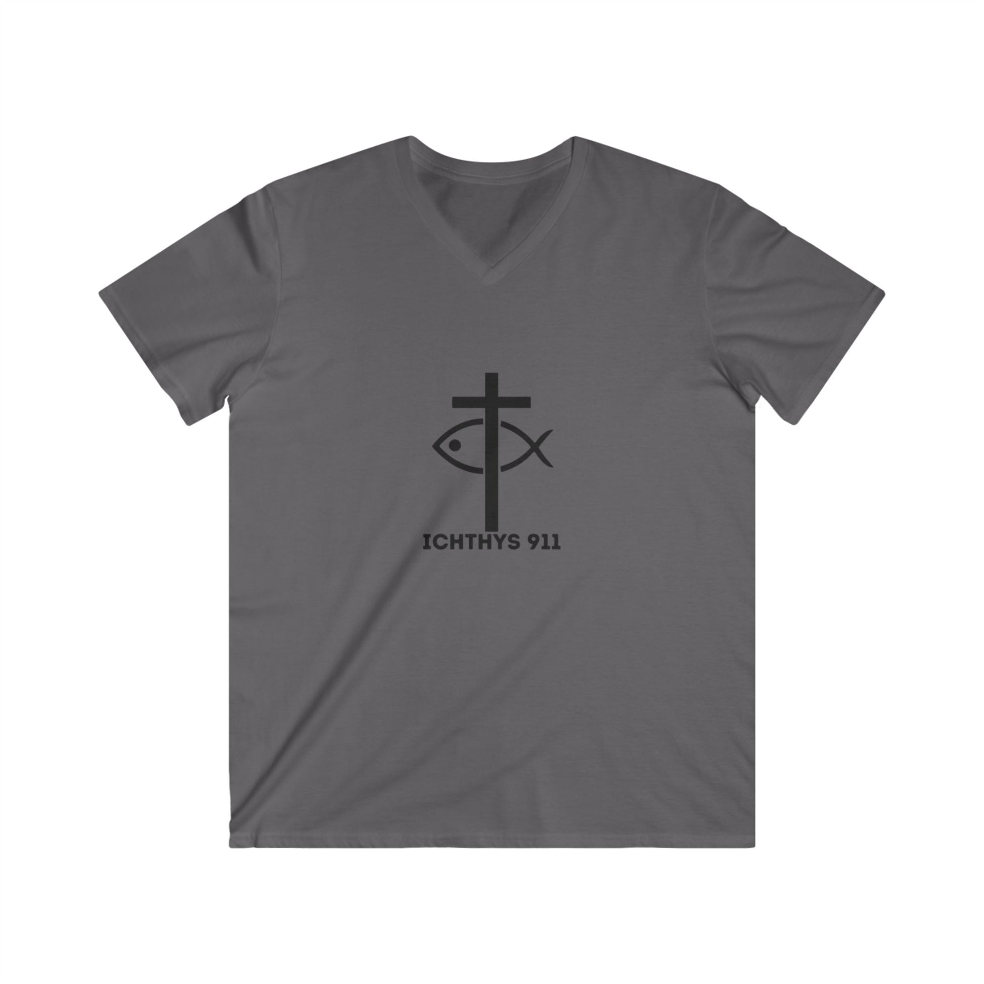 Introducing a stylish Men’s Fitted V-Neck Short Sleeve Tee, perfect for those who embrace faith and enjoy comfortable, everyday wear. This tee showcases a unique design featuring the ICHTHYS 911 Logo, blending contemporary style with spiritual expression. Made from soft, breathable fabric, it ensures all-day comfort and a flattering fit, making it a staple in any modern wardrobe. Whether you're attending a casual gathering, church service, or just lounging at home, this tee seamlessly fits into your lifestyle. It’s an ideal gift for fathers, brothers, or friends who appreciate thoughtful, faith-inspired apparel. Perfect for holidays, religious gatherings, or everyday wear, this tee invites conversations about faith and personal beliefs. Be bold in your walk. Be known by your faith. Represent the movement.with a powerful message on the back (or front) and your choice of the ICHTHYS 911 logo on the opposite side — it's a conversation starter, a statement of faith, and a bold reminder that you were chosen for more.