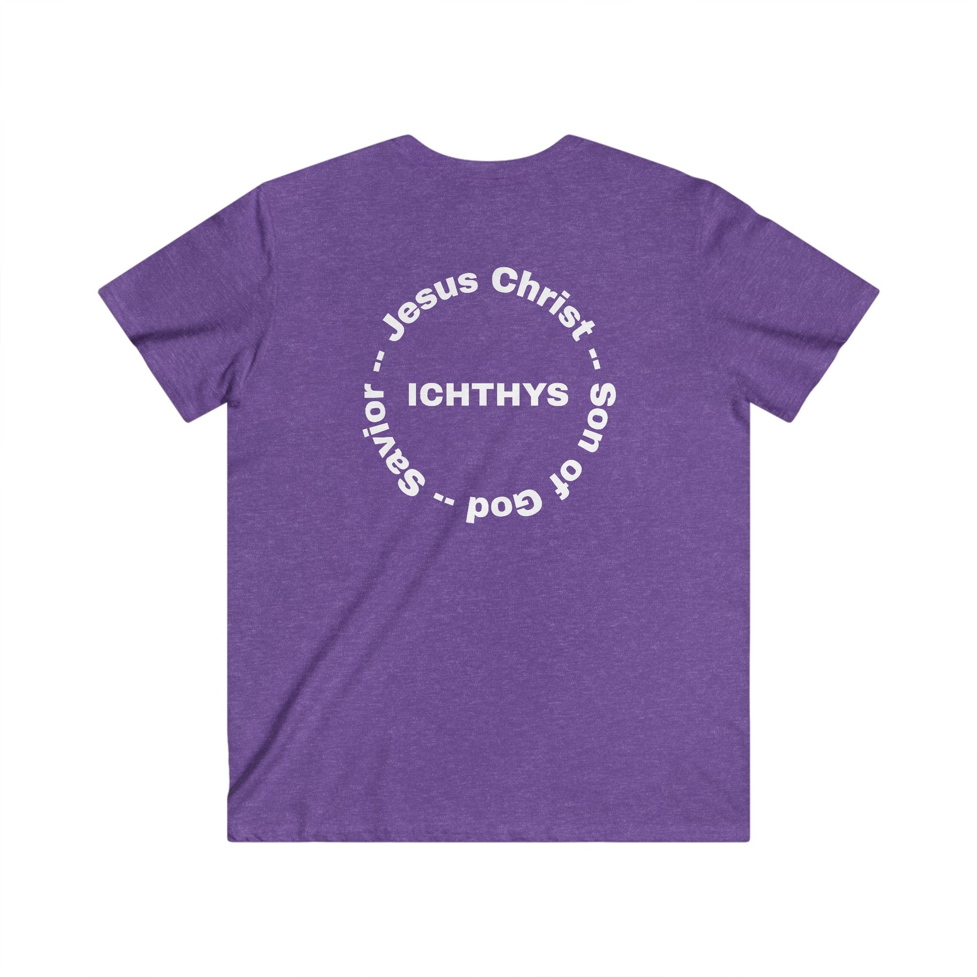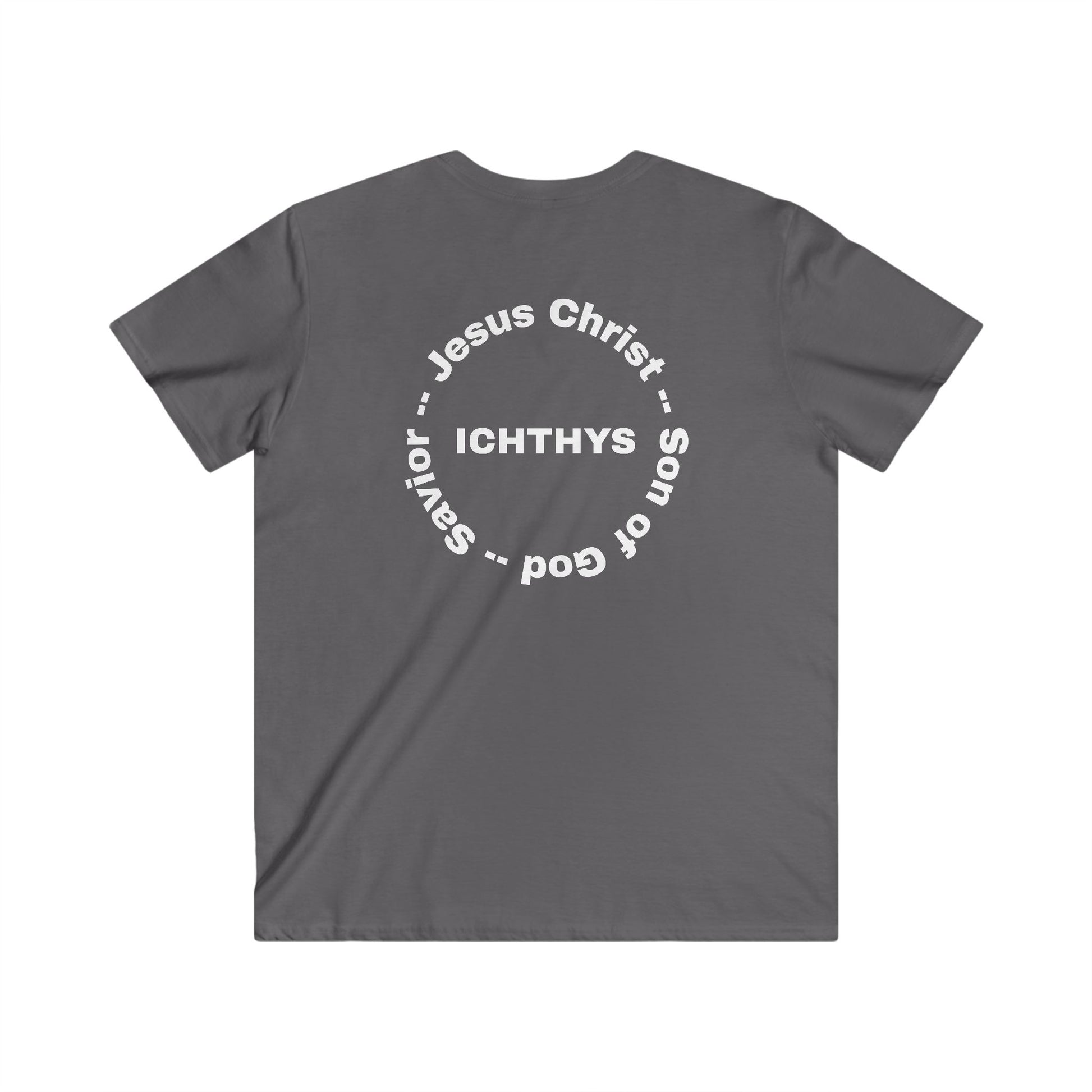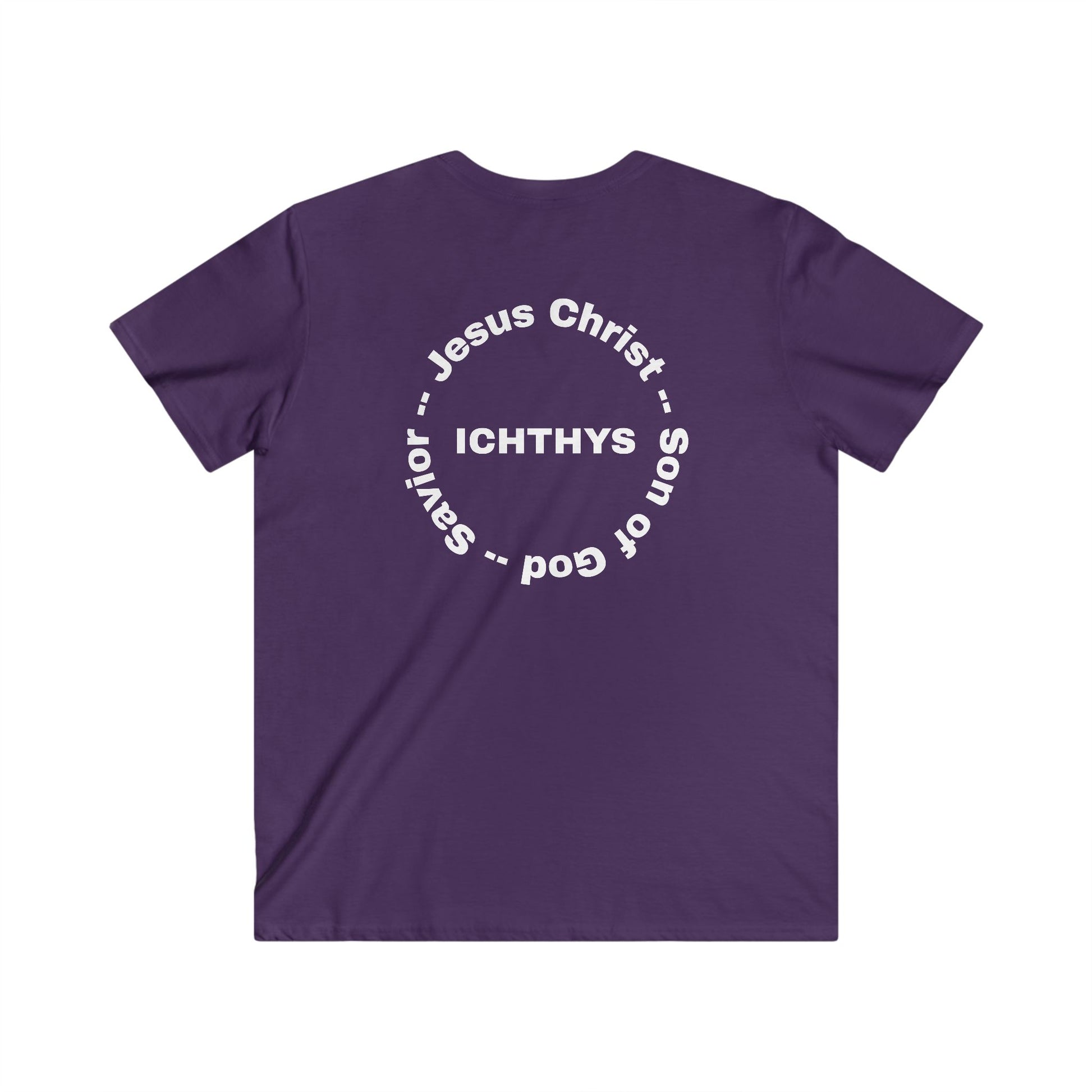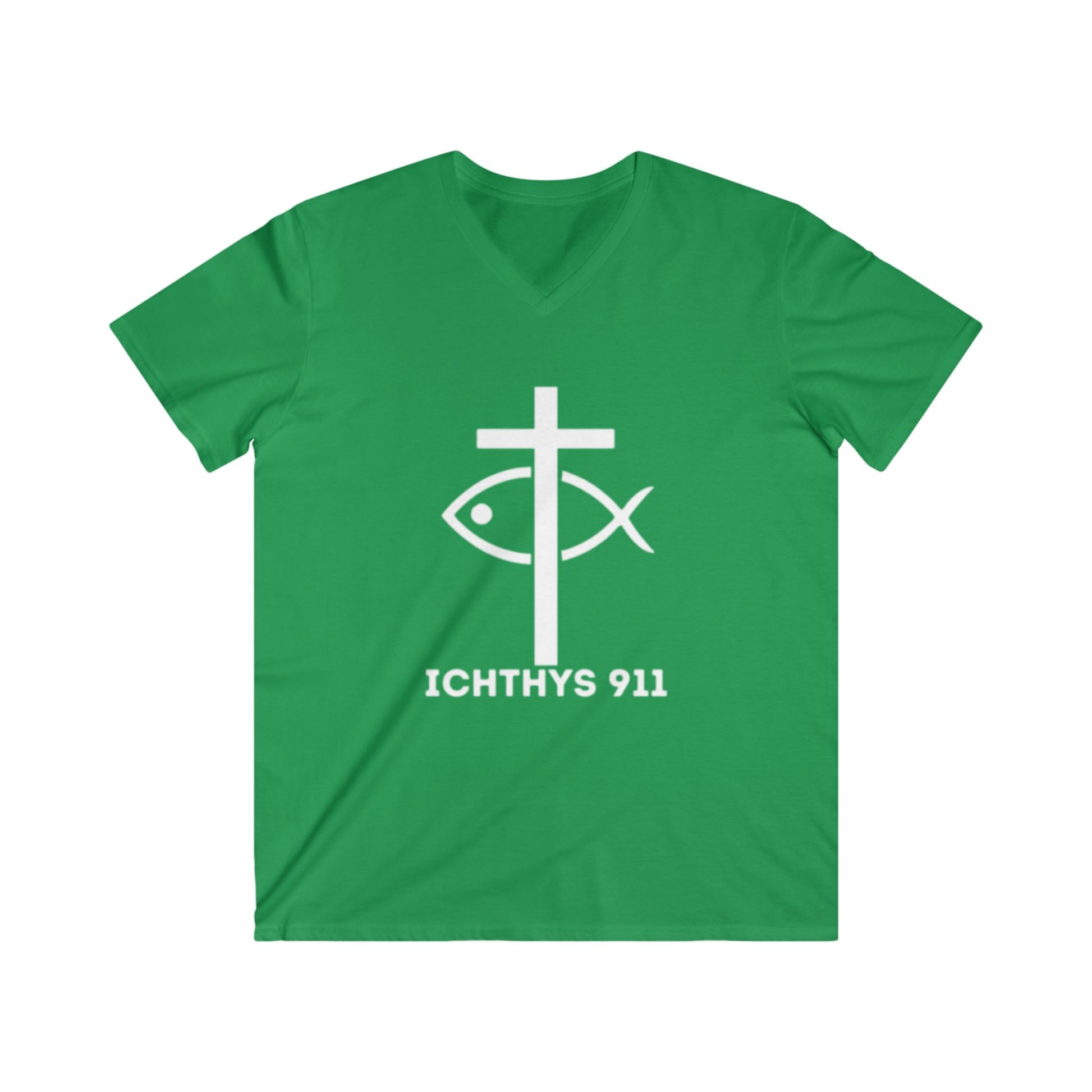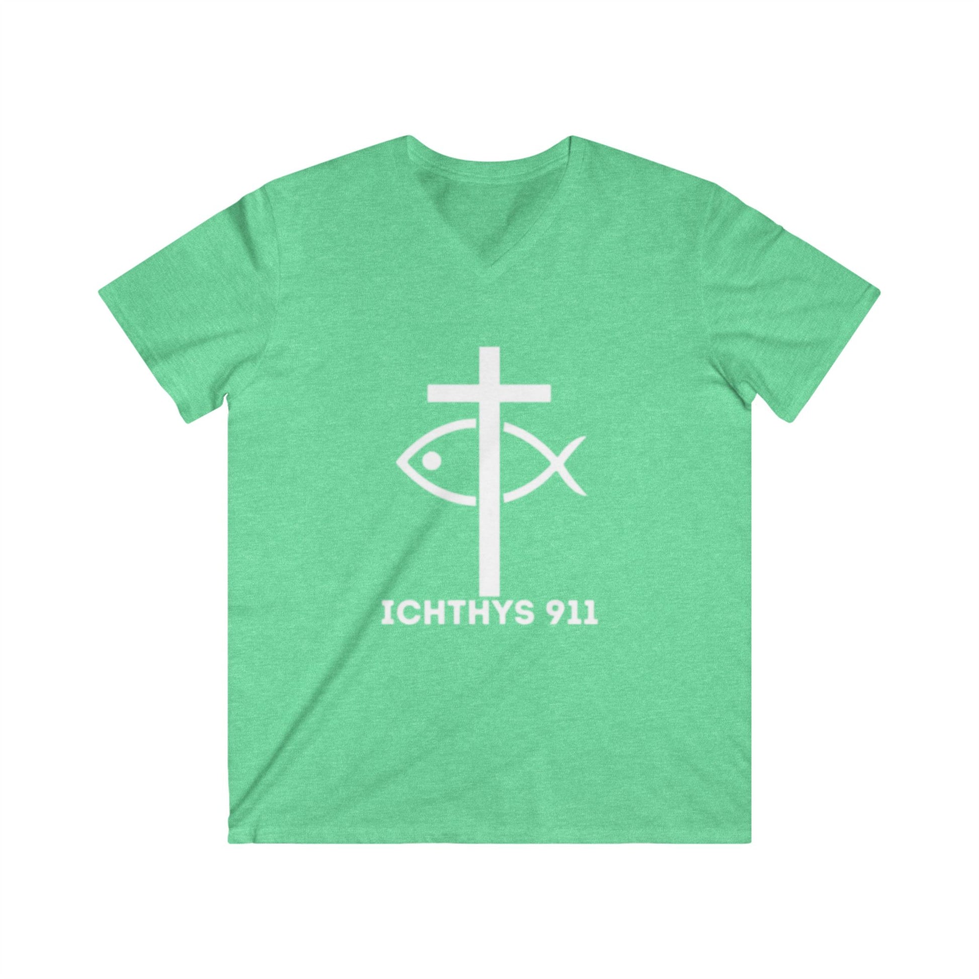 ICHTHYS 911 - Jesus Christ - Son of God - Savior Collection - Men's Fitted V-Neck Short Sleeve T - Shirt - Faith-Inspired - Christian Faith - White Font