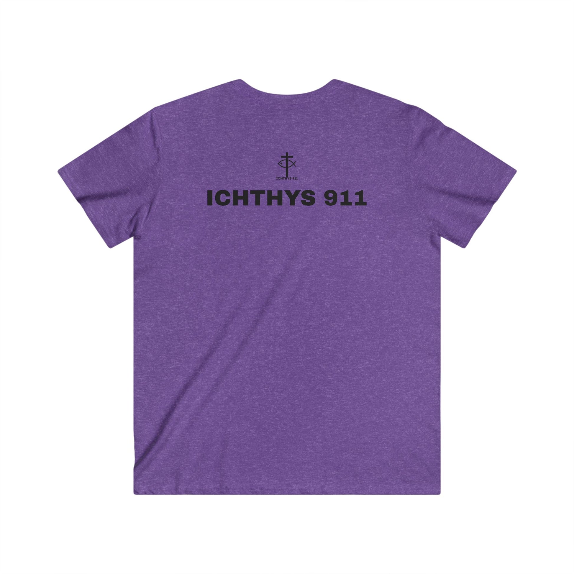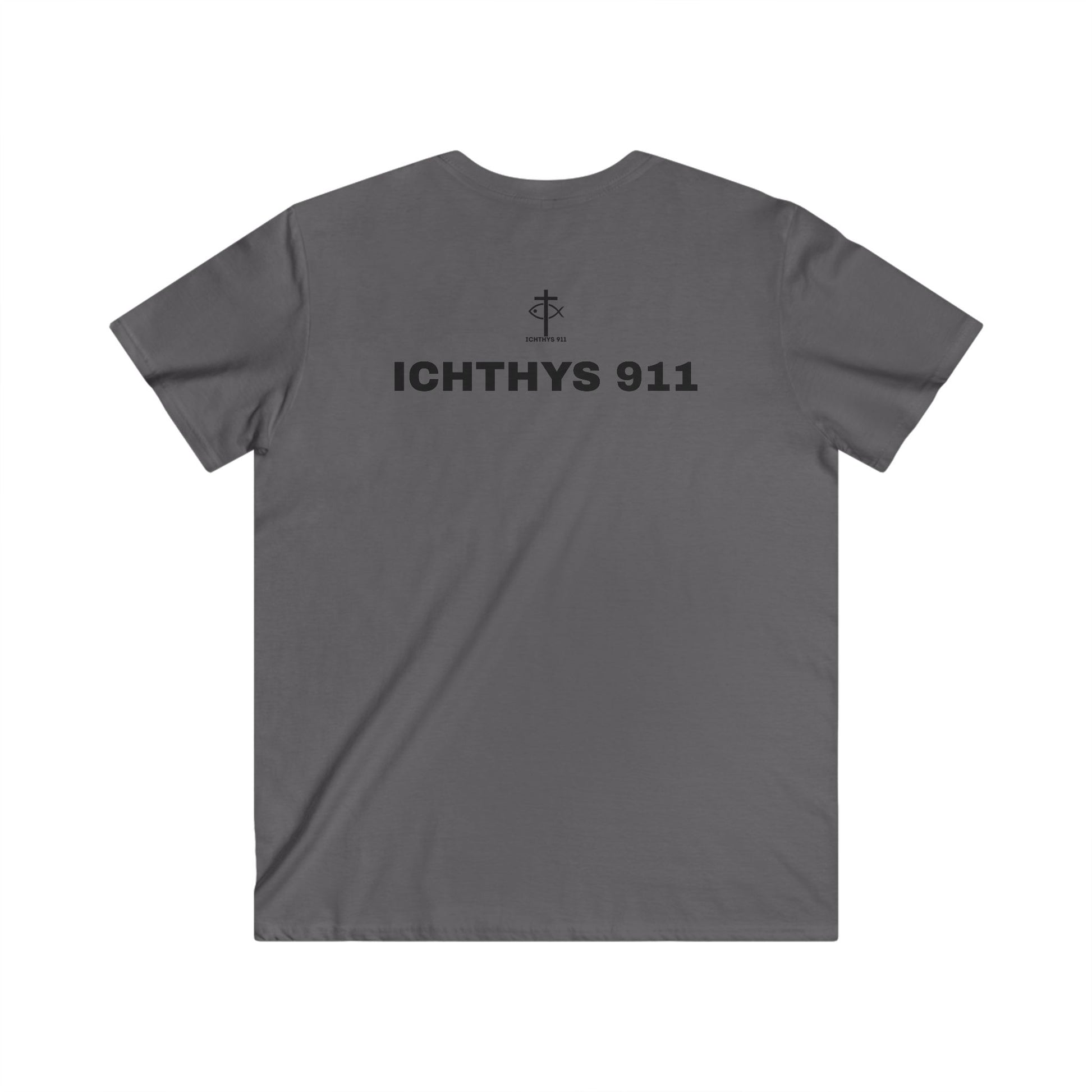 ICHTHYS 911 -Black Font - "Authentic Collection" Mens Fitted V-Neck Short Sleeve T - Shirt - Faith-Inspired featuring Christian Faith