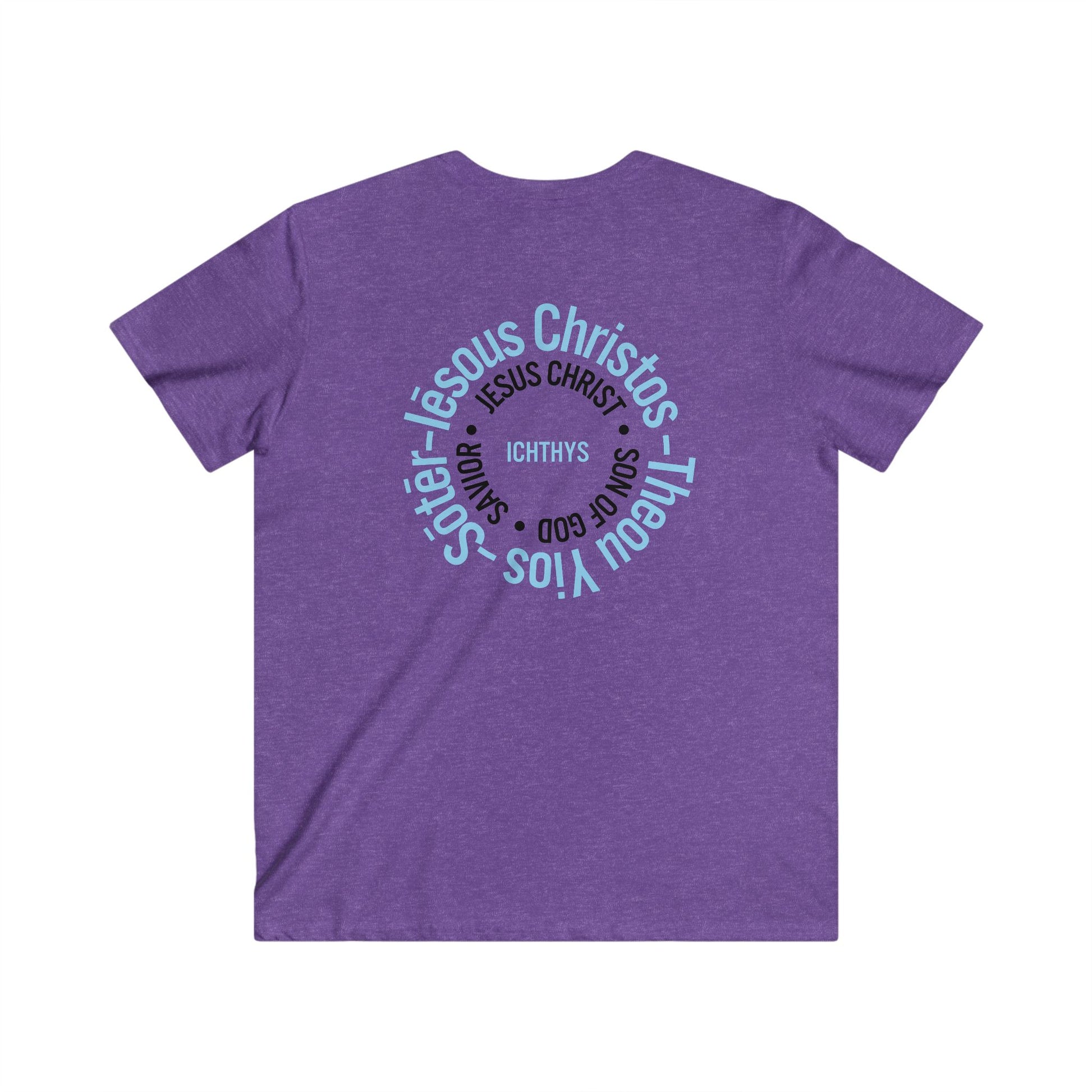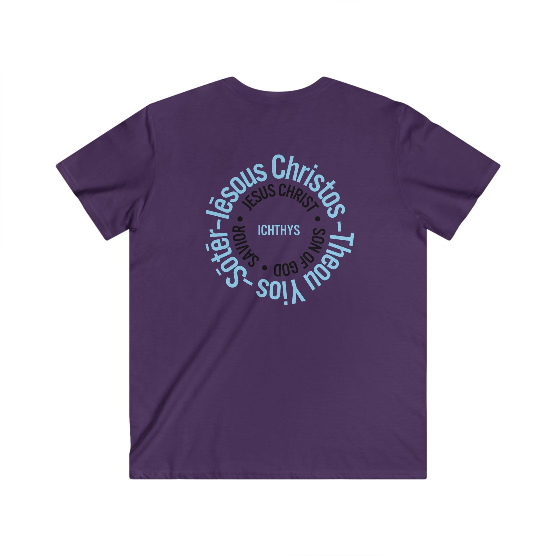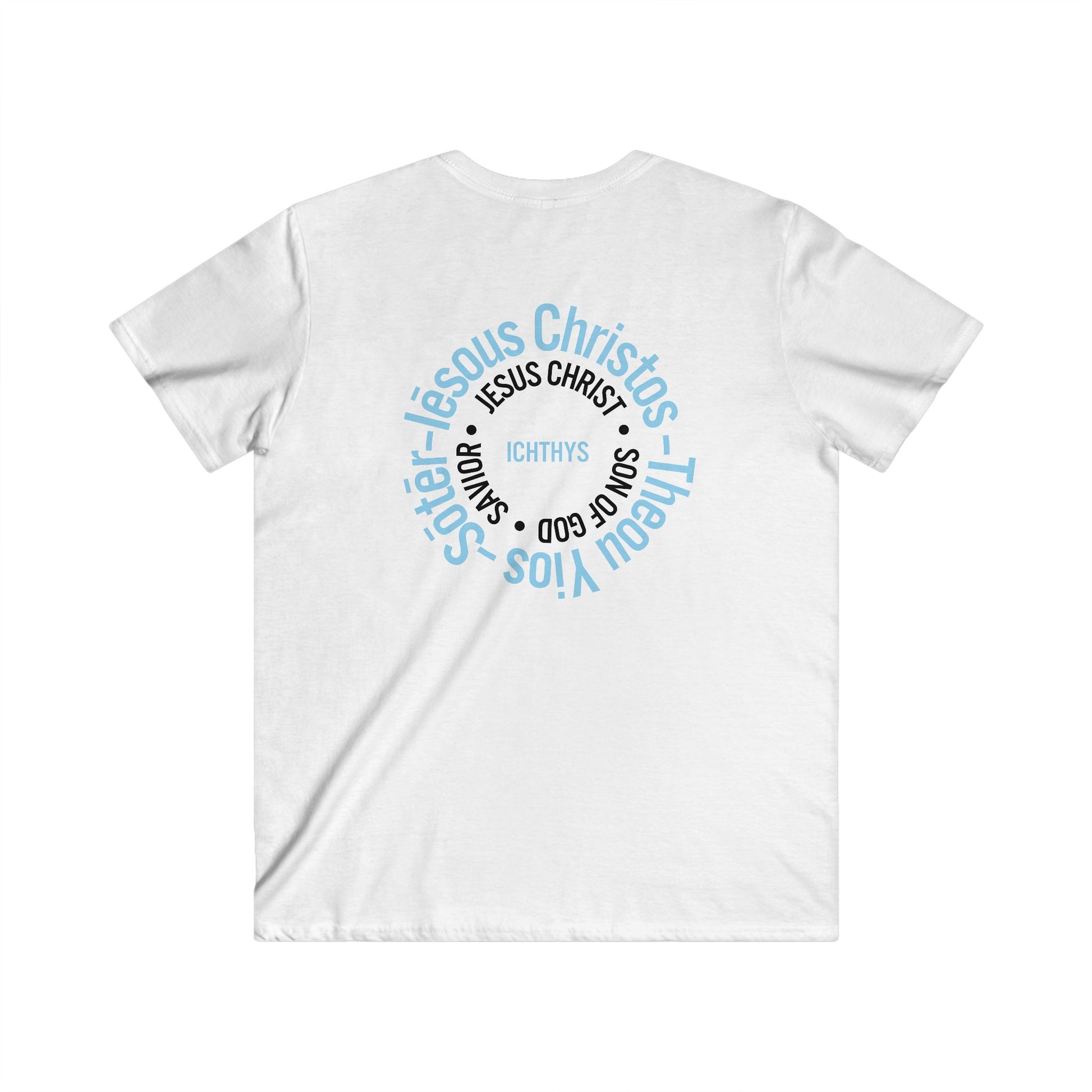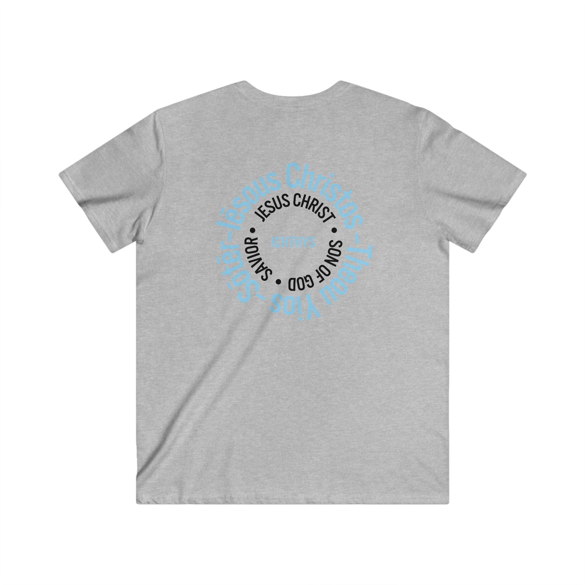 Iēsous Christos, Theou Yios, Sōtēr - Collection - Black Font - Men's Fitted V-Neck Short Sleeve T - Shirt - Faith-Inspired - Christian Faith ICHTHYS 911 Design