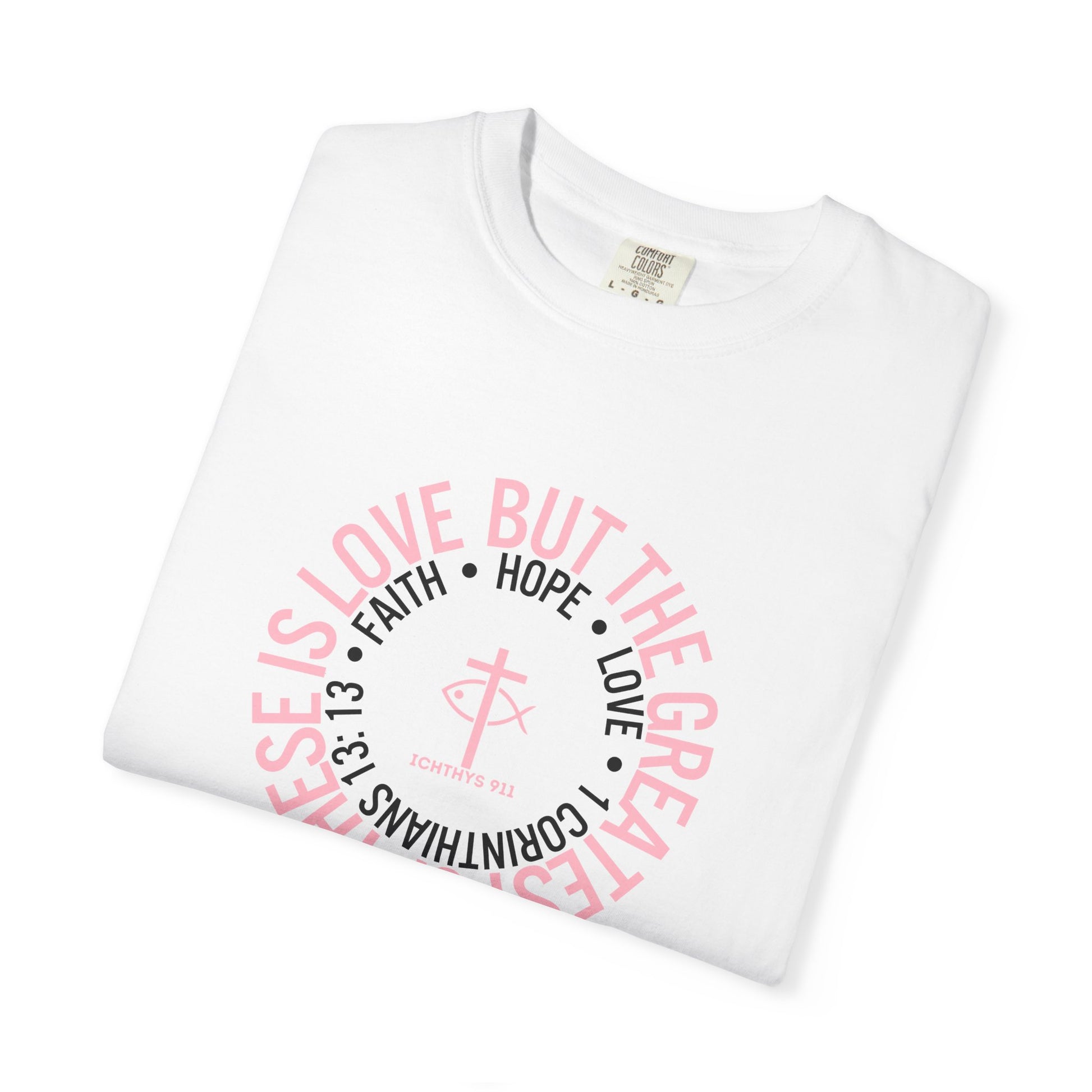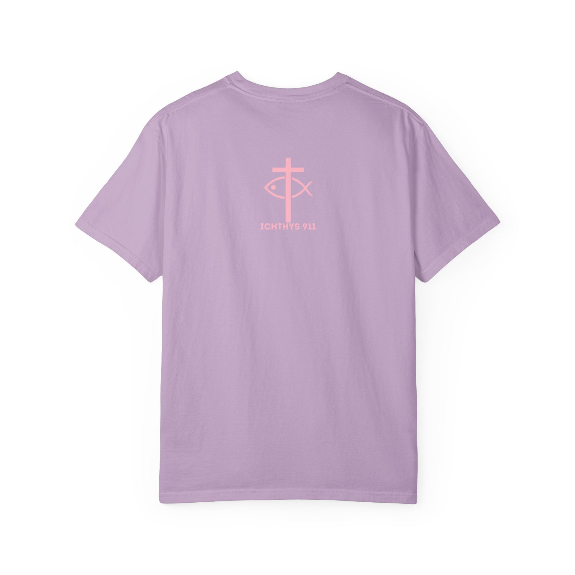 ICHTHYS 911 Pink Font "Faith, Hope, & Love Reverse" - Unisex Garment Dyed T-Shirt - 100# US Cotton - Men T-Shirt - Women Tee - Christian T- Shirt -Faith-Inspired Shirt - Christian Fashion - Wear Your Faith