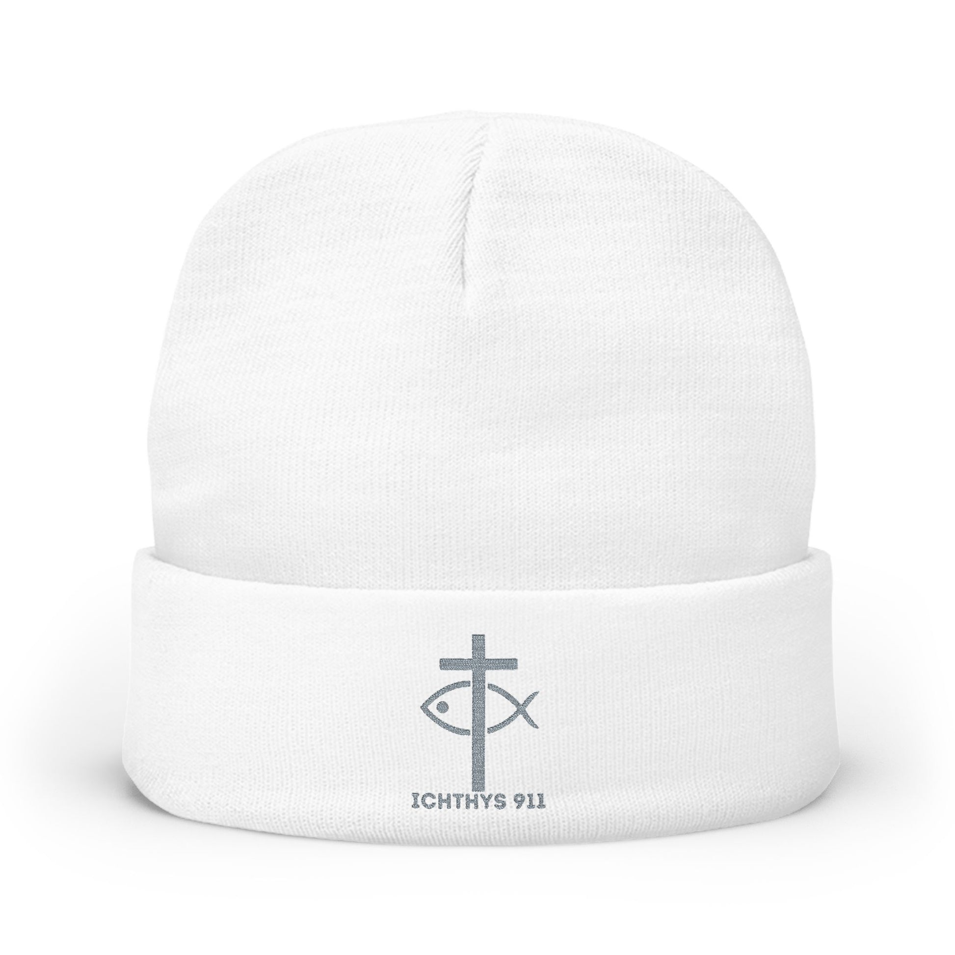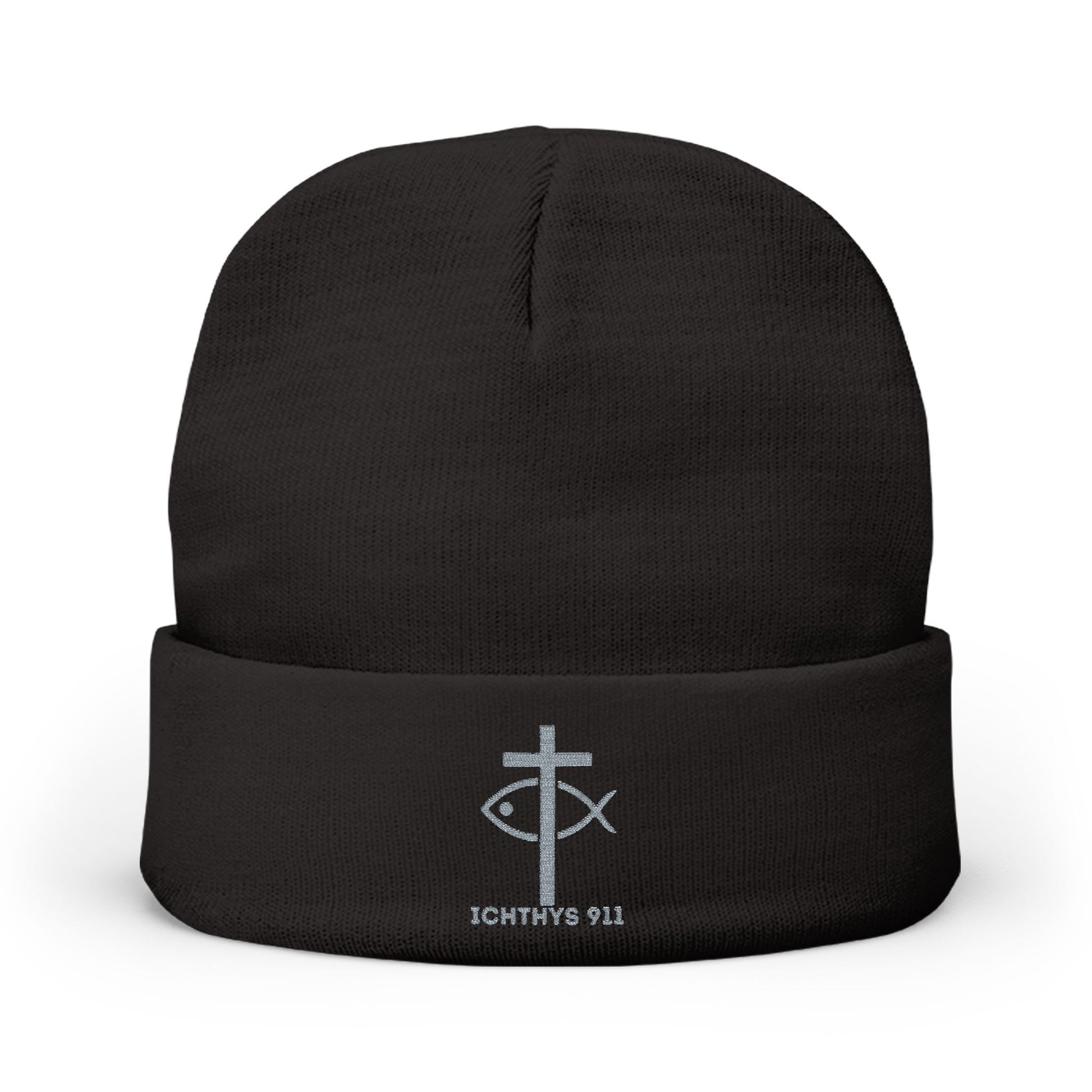 Chic and Cozy Knit Beanie with Custom Embroidery - Warm Winter Hat - Christian - Faith Based - ICHTHYS 911 Design