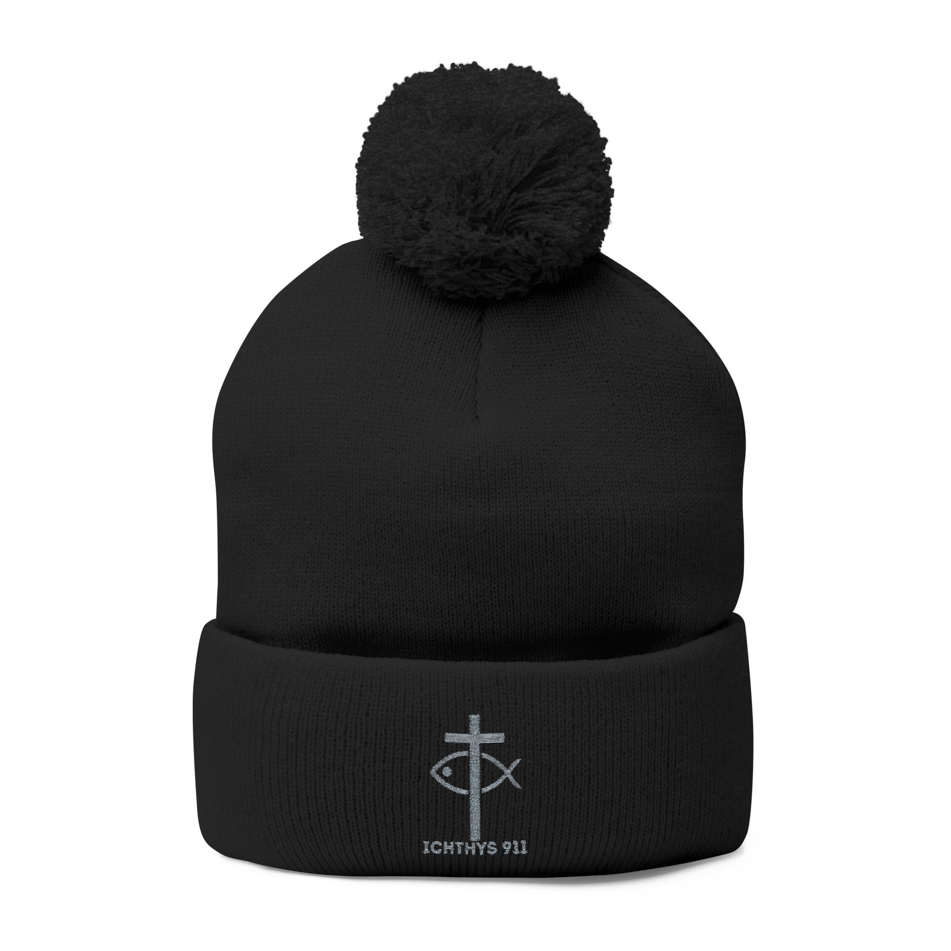 Cozy Pom-Pom Knit Cap | Winter Accessory with Embroidery - Christian Faith Wear - ICHTHYS 911 Design