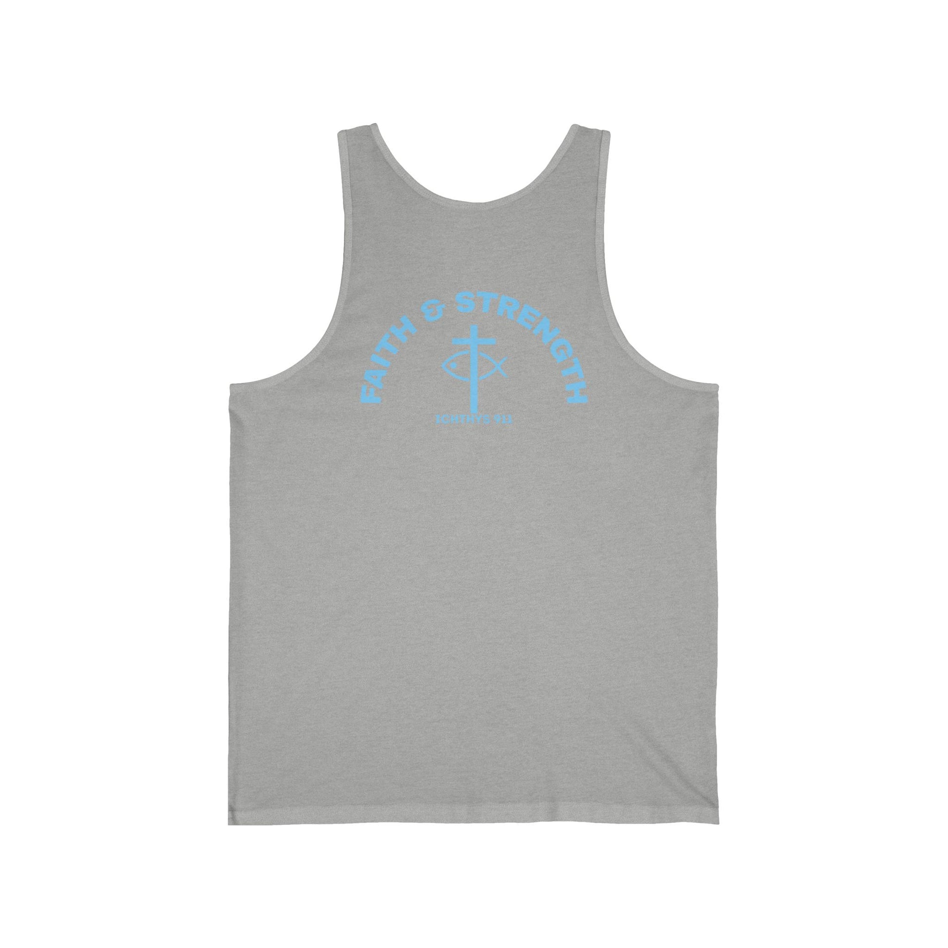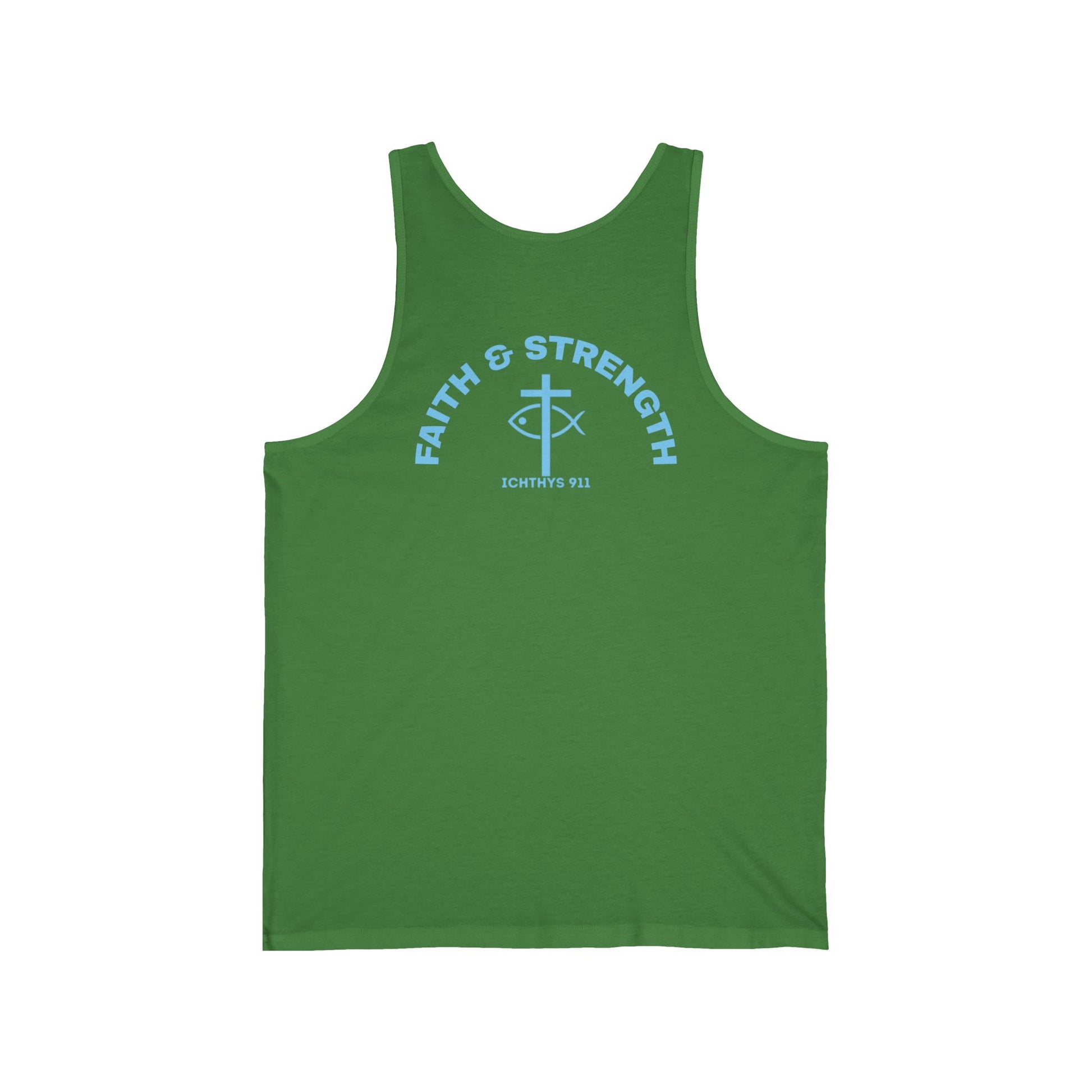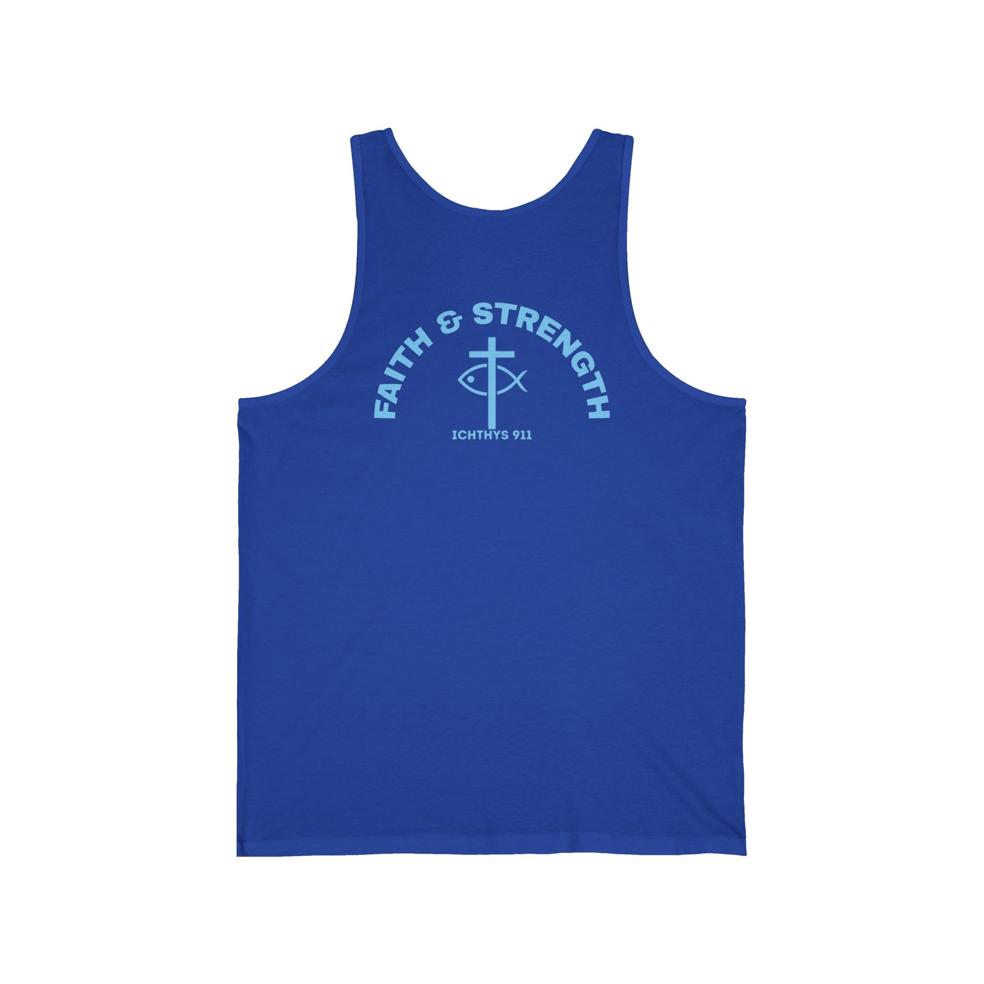 ICHTHYS 911 Blue Font "Faith & Strength" Extra Light - Unisex - Men Tank - Women Tank - Jersey Tank - Casual Christian Symbol Graphic Tank Top