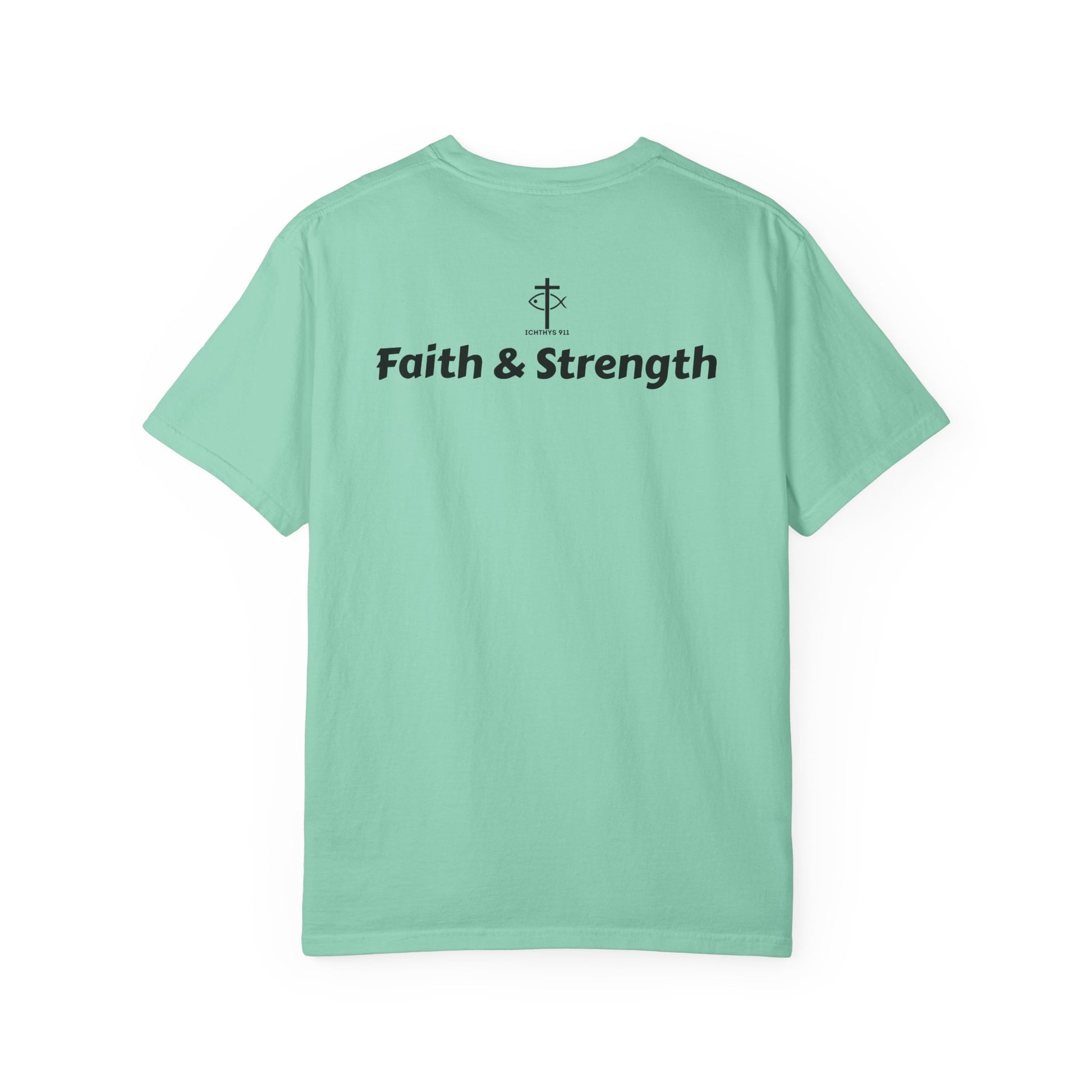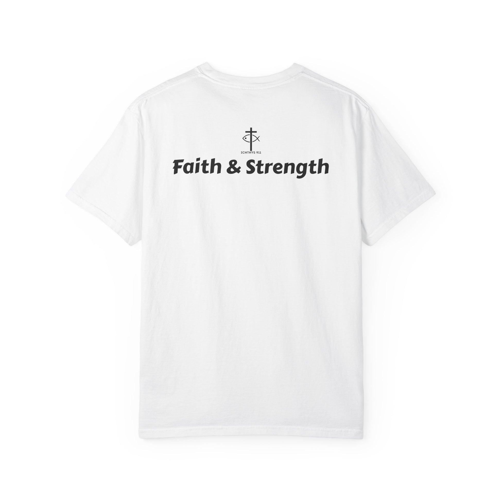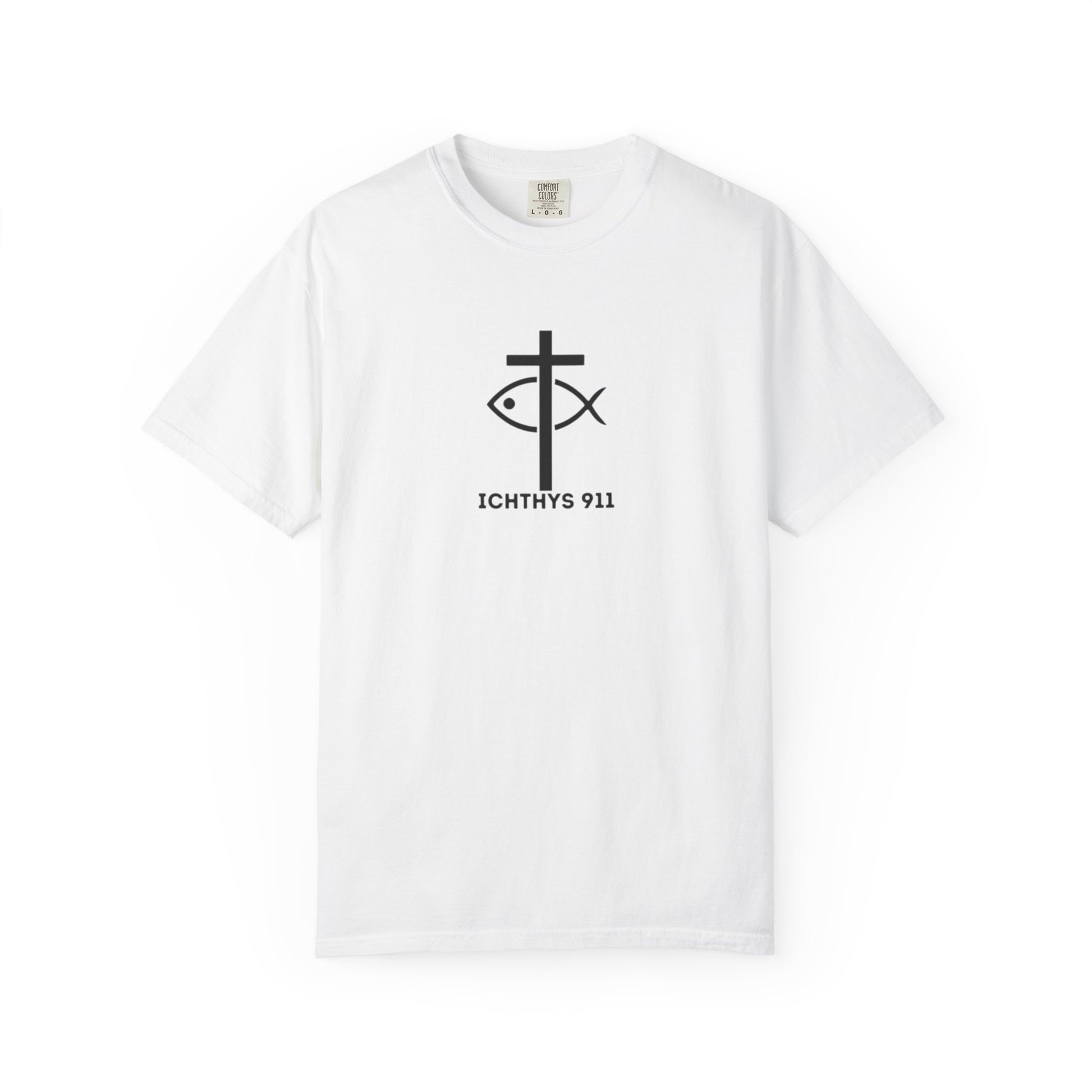 ICHTHYS 911 - Black Font - "Faith & Strength" - Unisex Garment - Dyed T-Shirt - Inspirational Graphic T-Shirt for Everyday Motivation - 100% US cotton - Men T-Shirt - Women T-Shirt