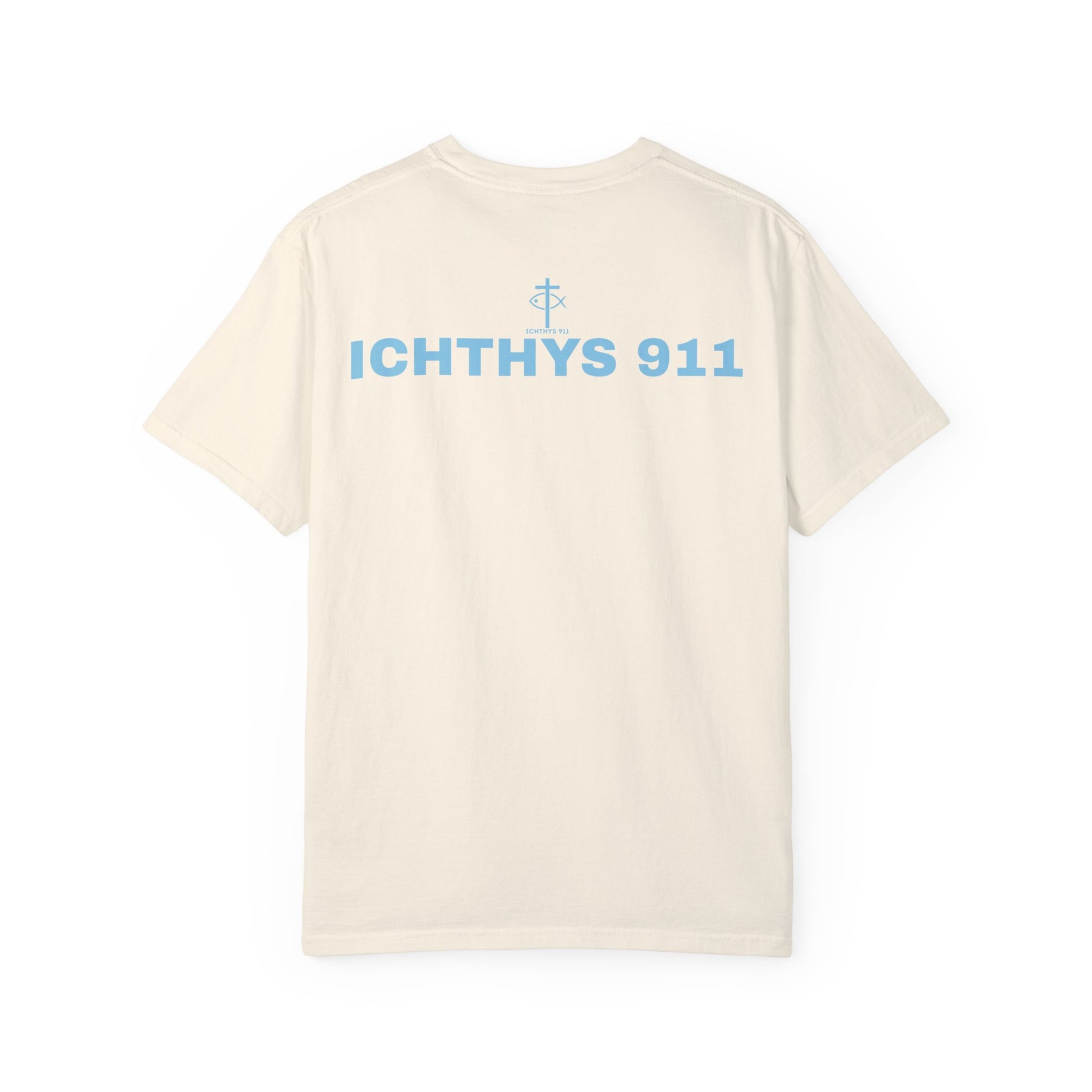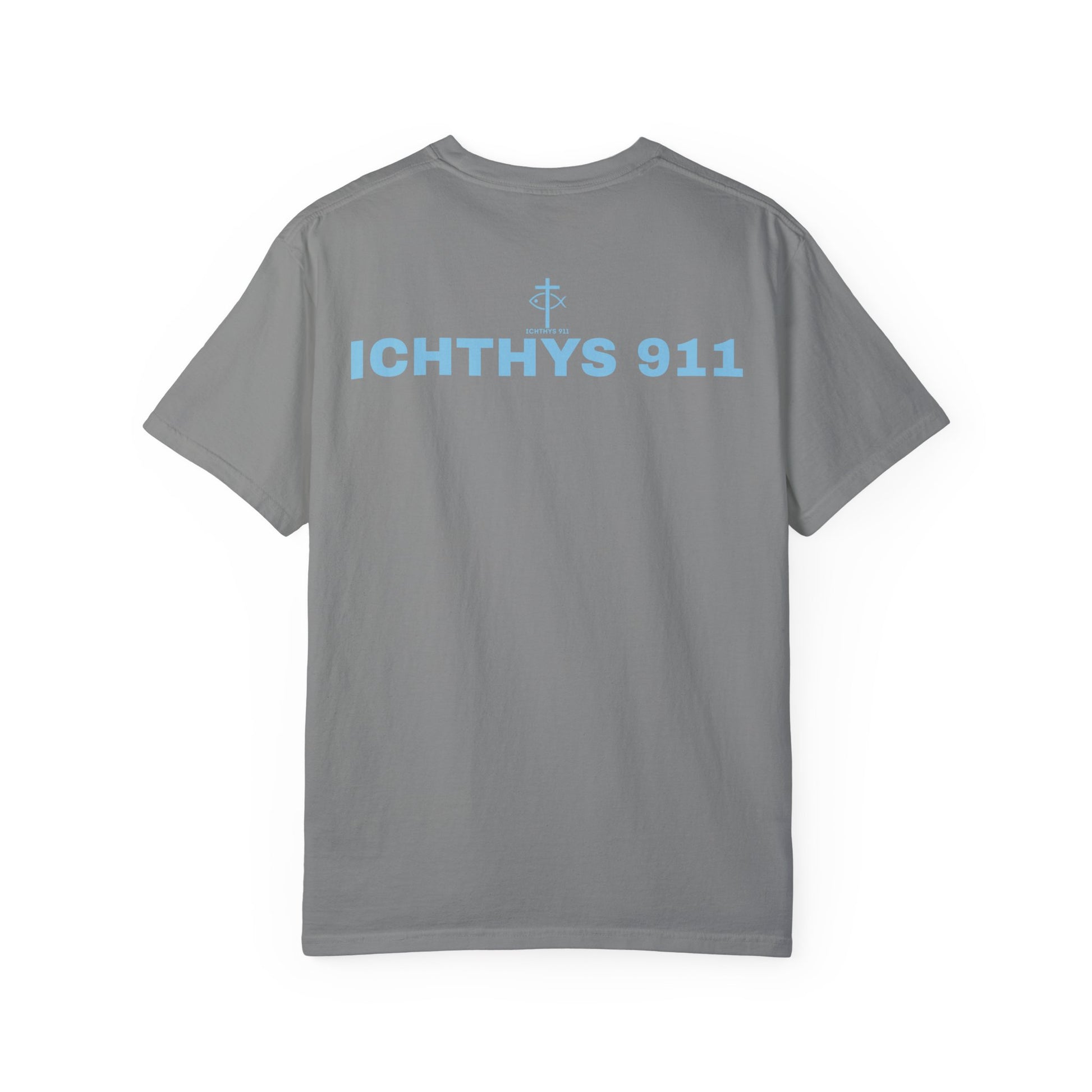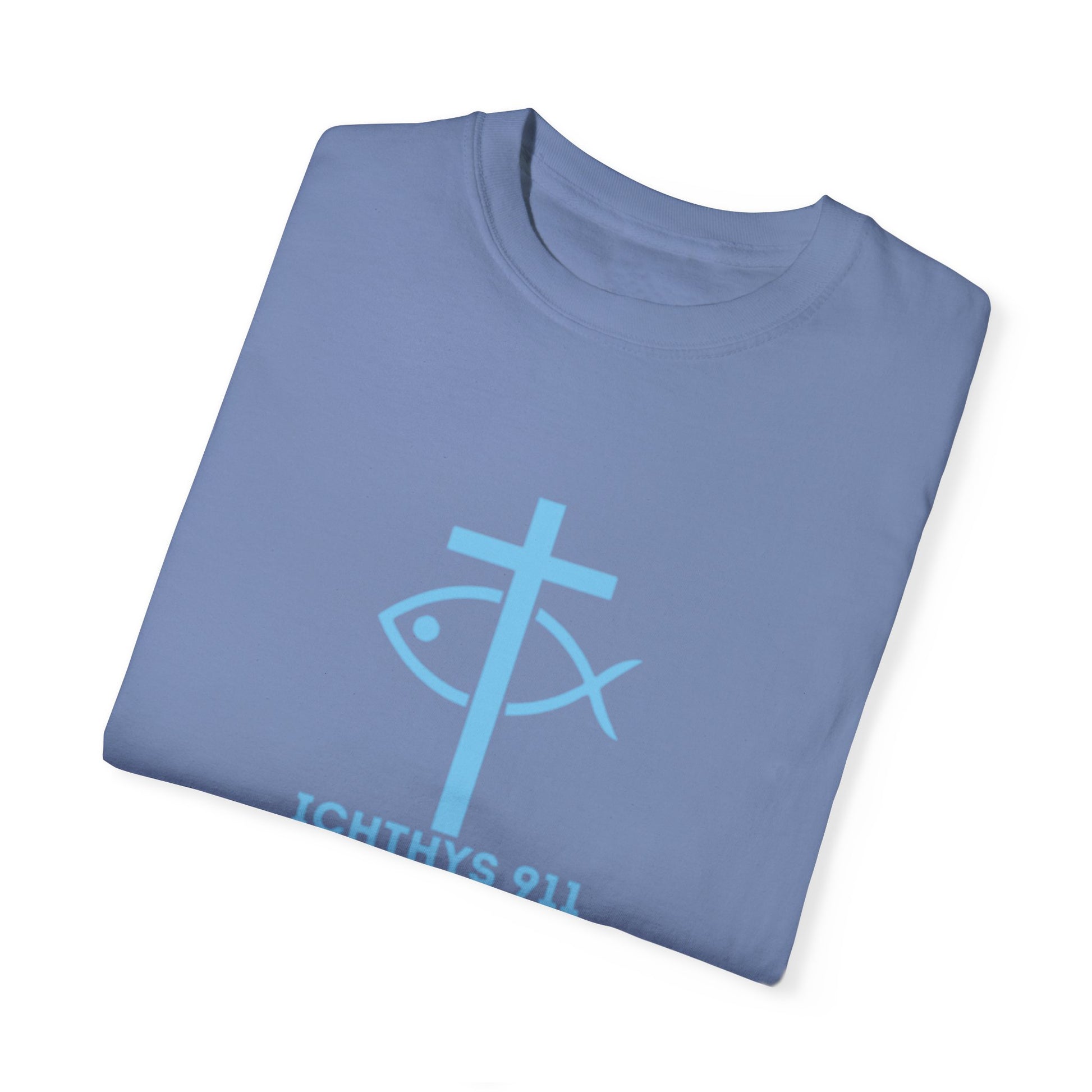 ICHTHYS 911 - Authentic - Christian Streetwear T-Shirt – Jesus Gym & Faith Fashion, Unisex Garment-Dyed T-Shirt Blue Font