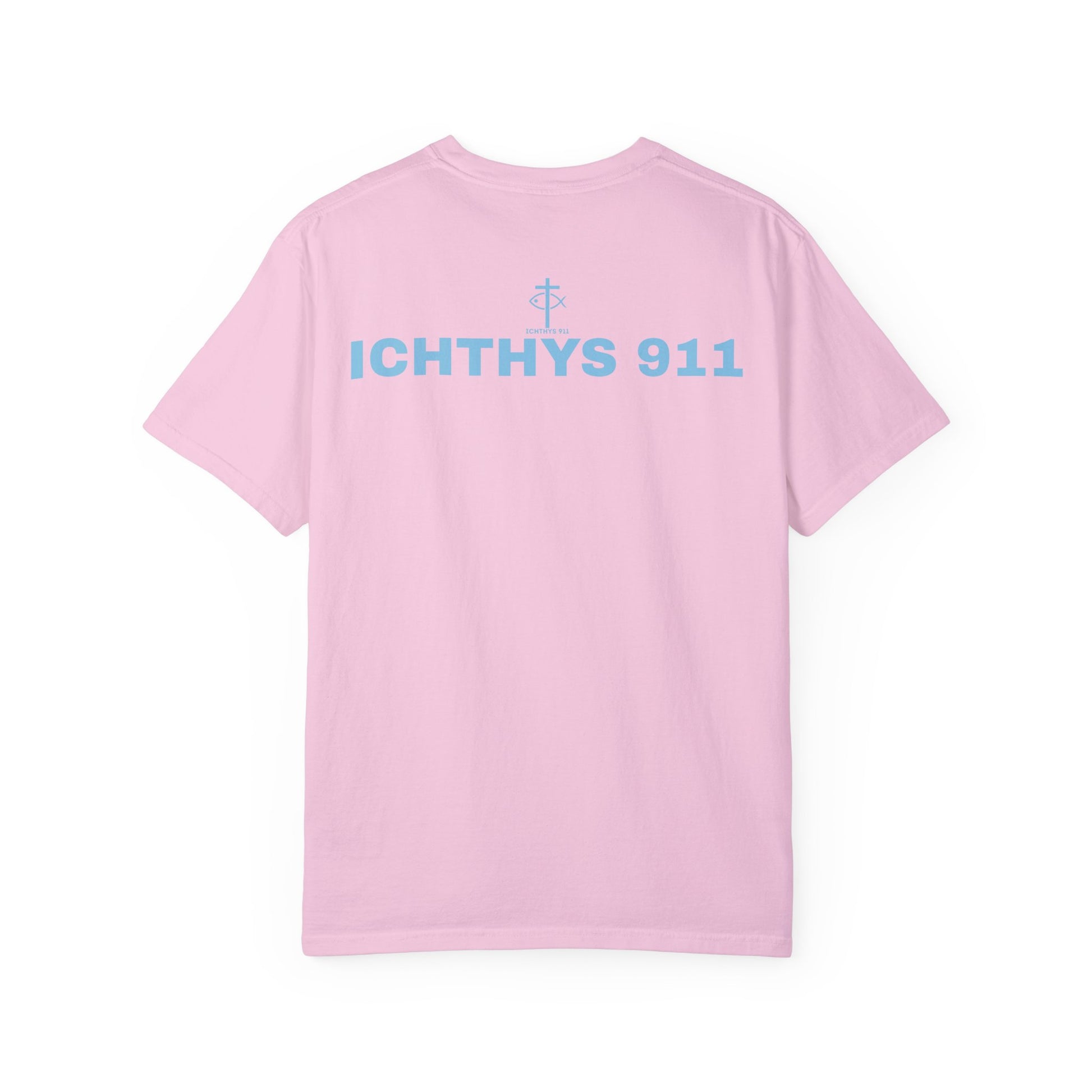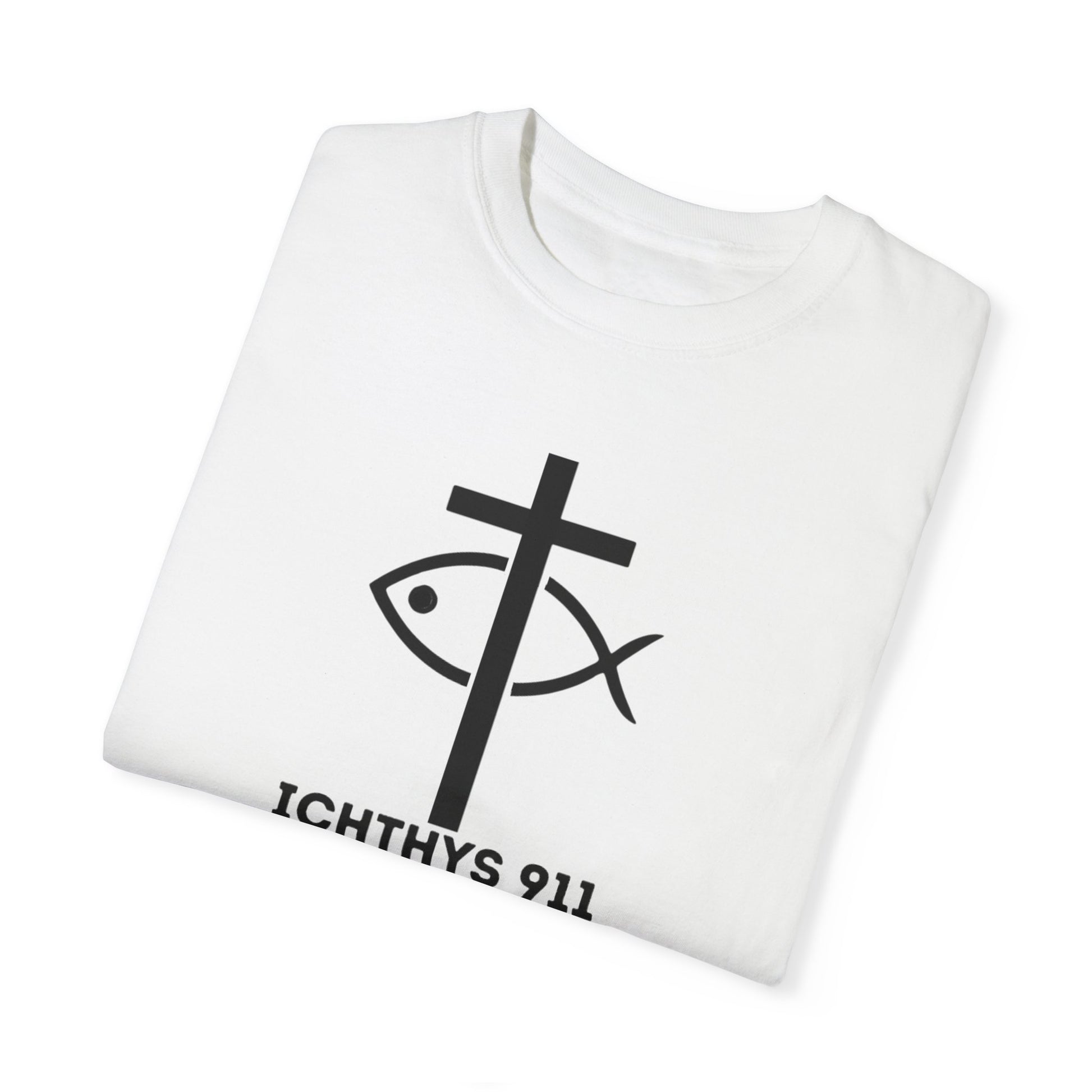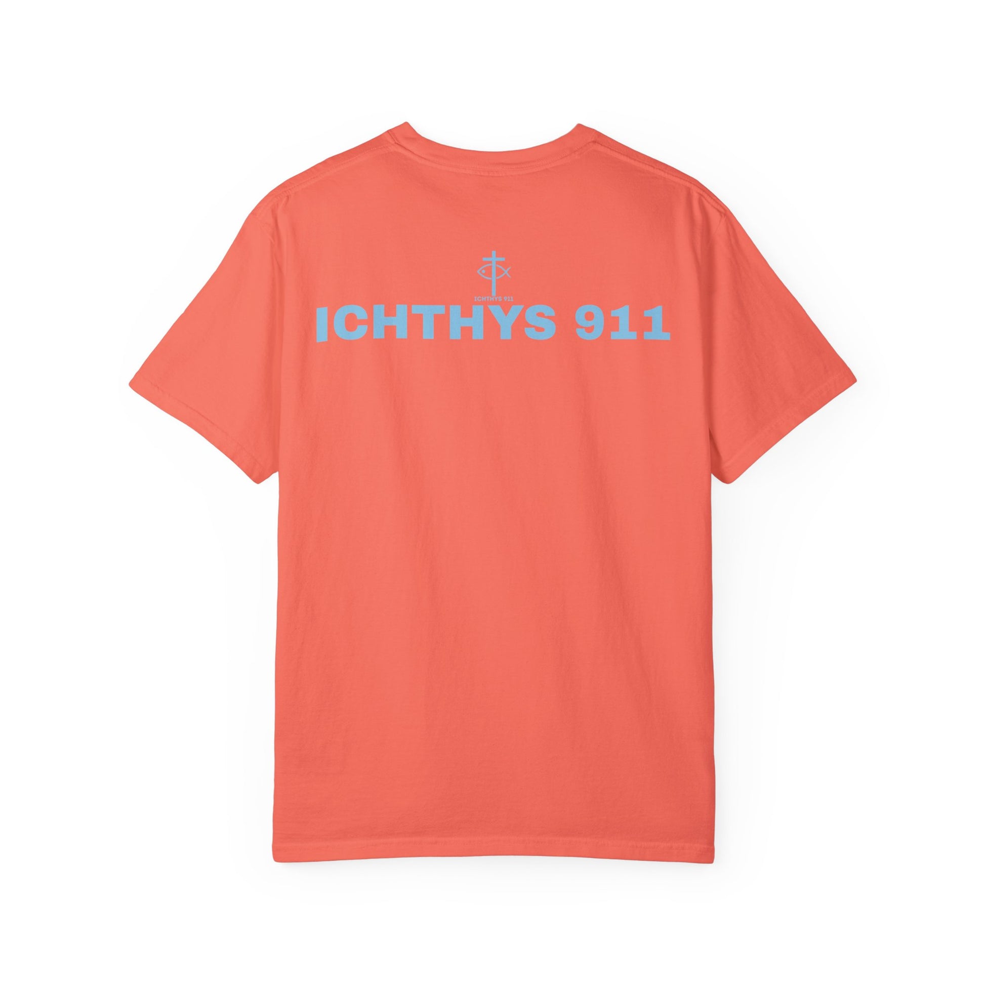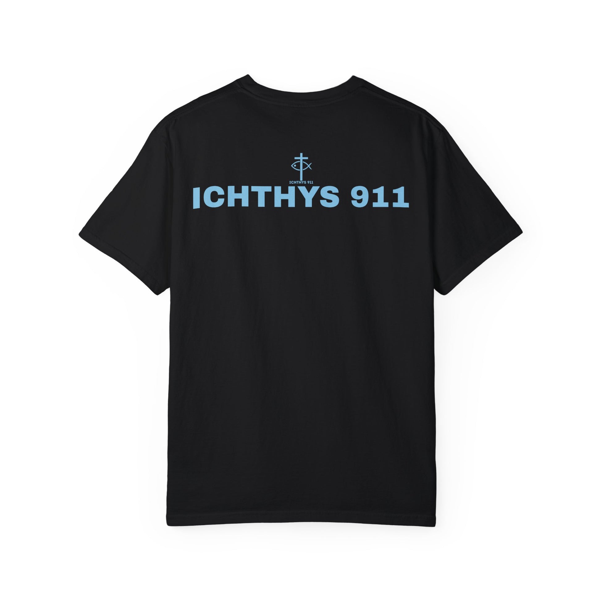 ICHTHYS 911 - Authentic - Christian Streetwear T-Shirt – Jesus Gym & Faith Fashion, Unisex Garment-Dyed T-Shirt Blue Font