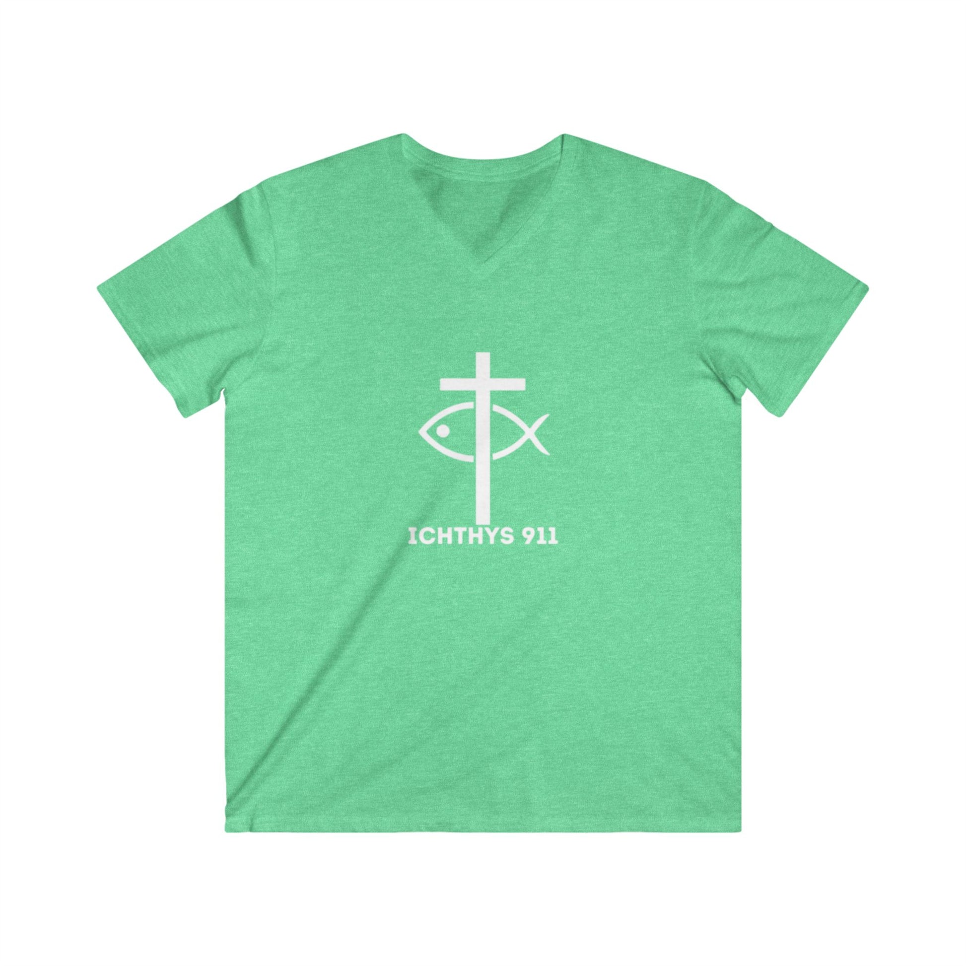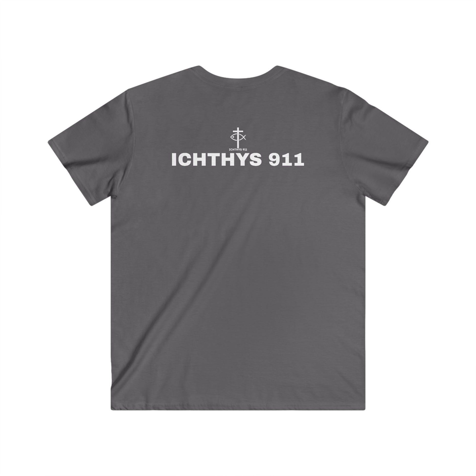 ICHTHYS 911 - White Font "Authentic Collection" - Men's Fitted V-Neck Short Sleeve T - Shirt - Faith-Inspired - Christian Faith - Faith Fashion - Christian T-Shirt