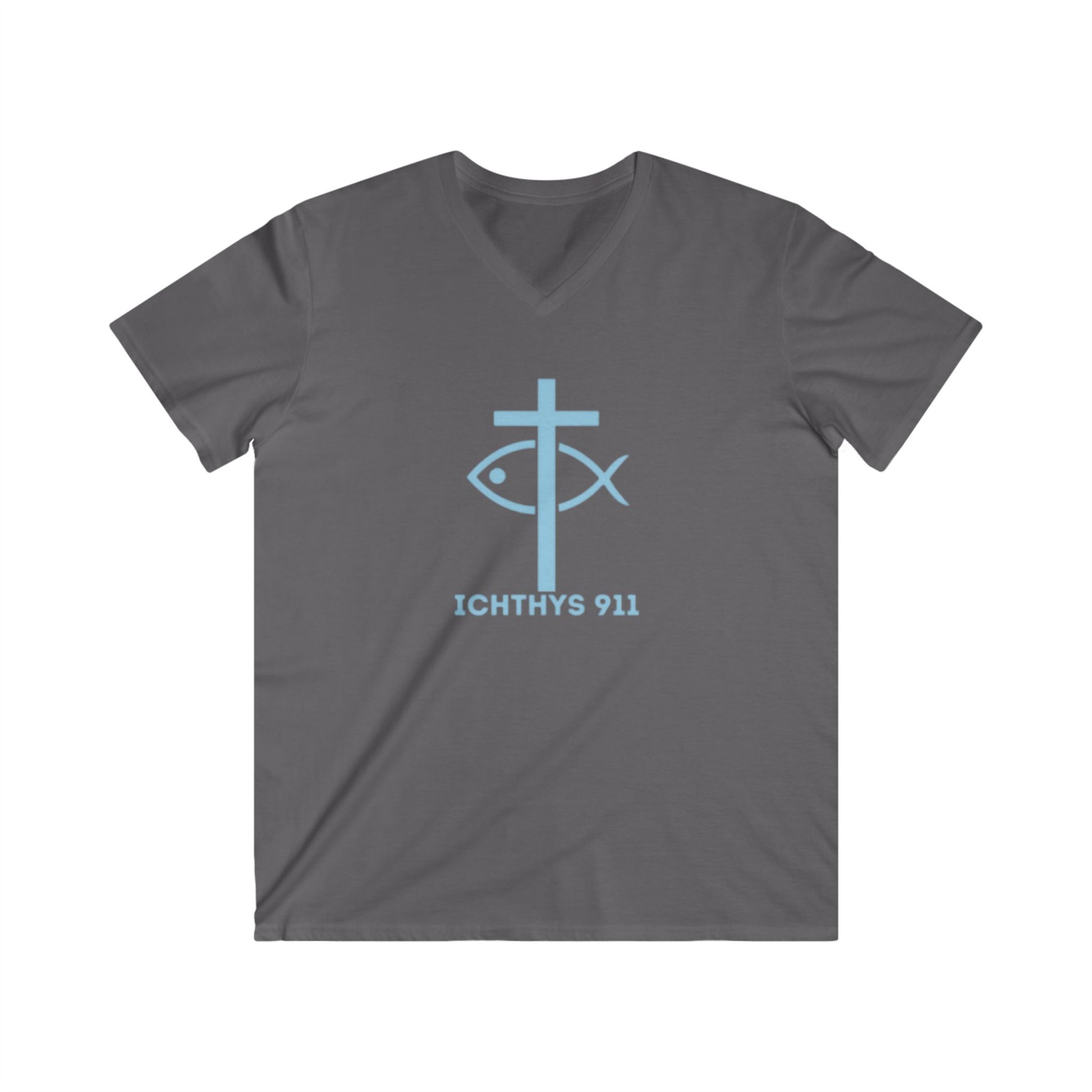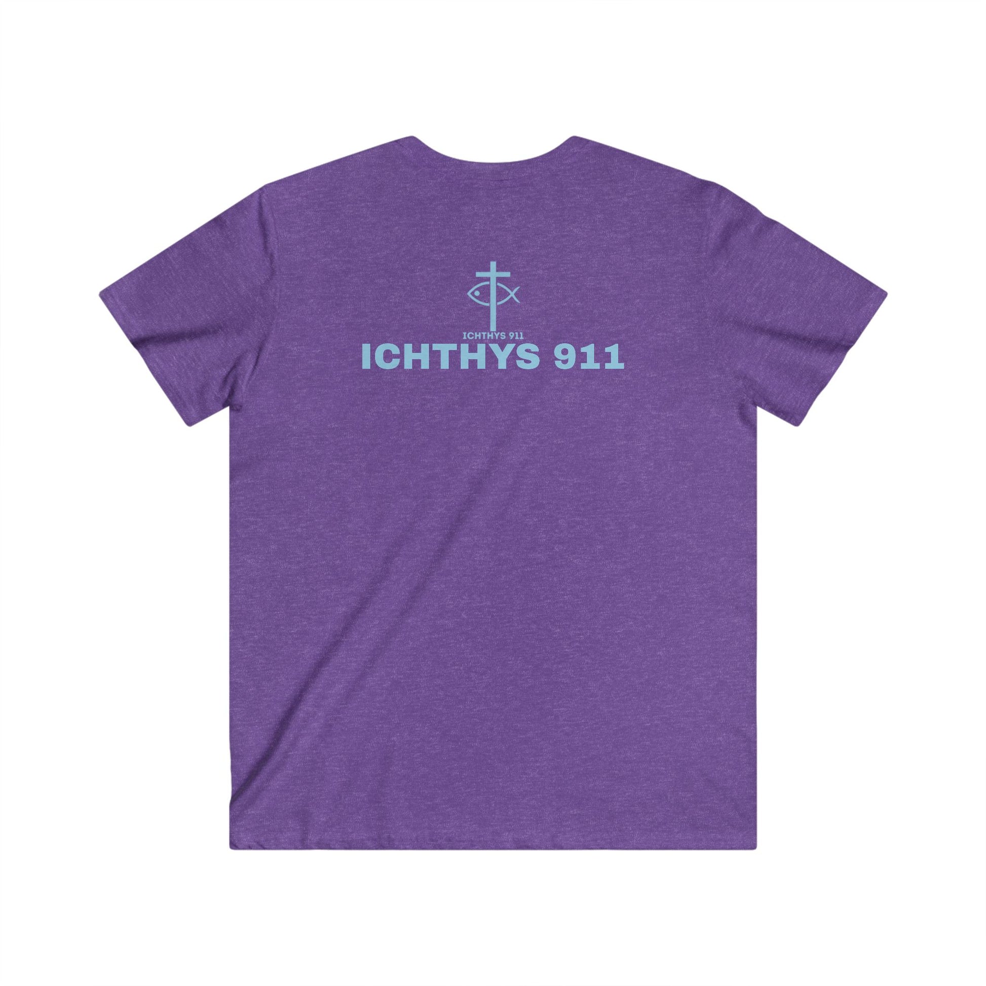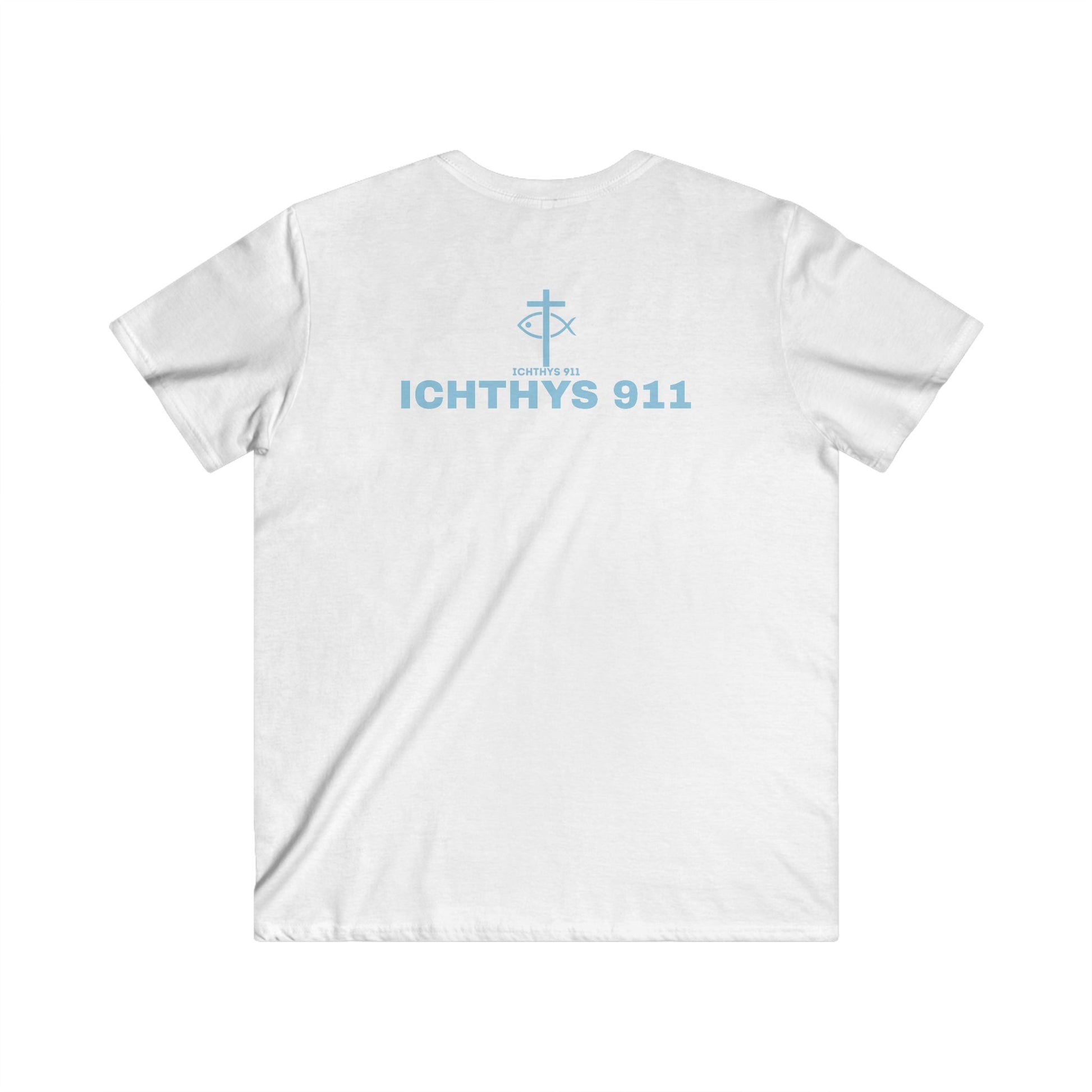 ICHTHYS 911 - Blue Font "Authentic" Collection - Men's Fitted V-Neck Short Sleeve T - Shirt - W/O IC 911 on Back - Faith-Inspired - Christian Faith -