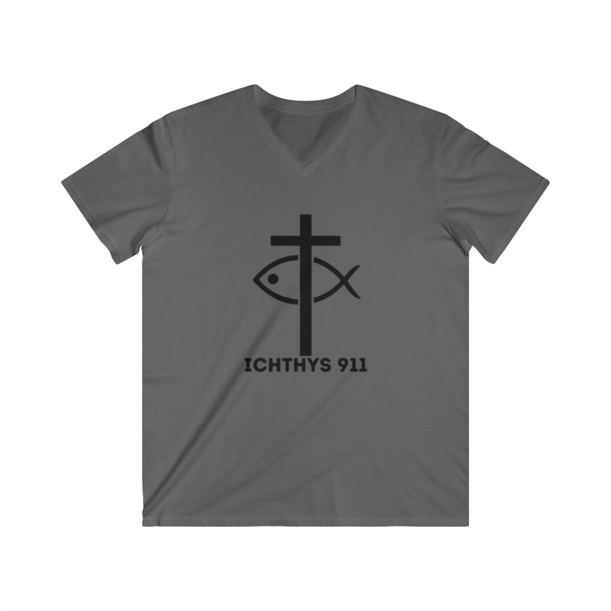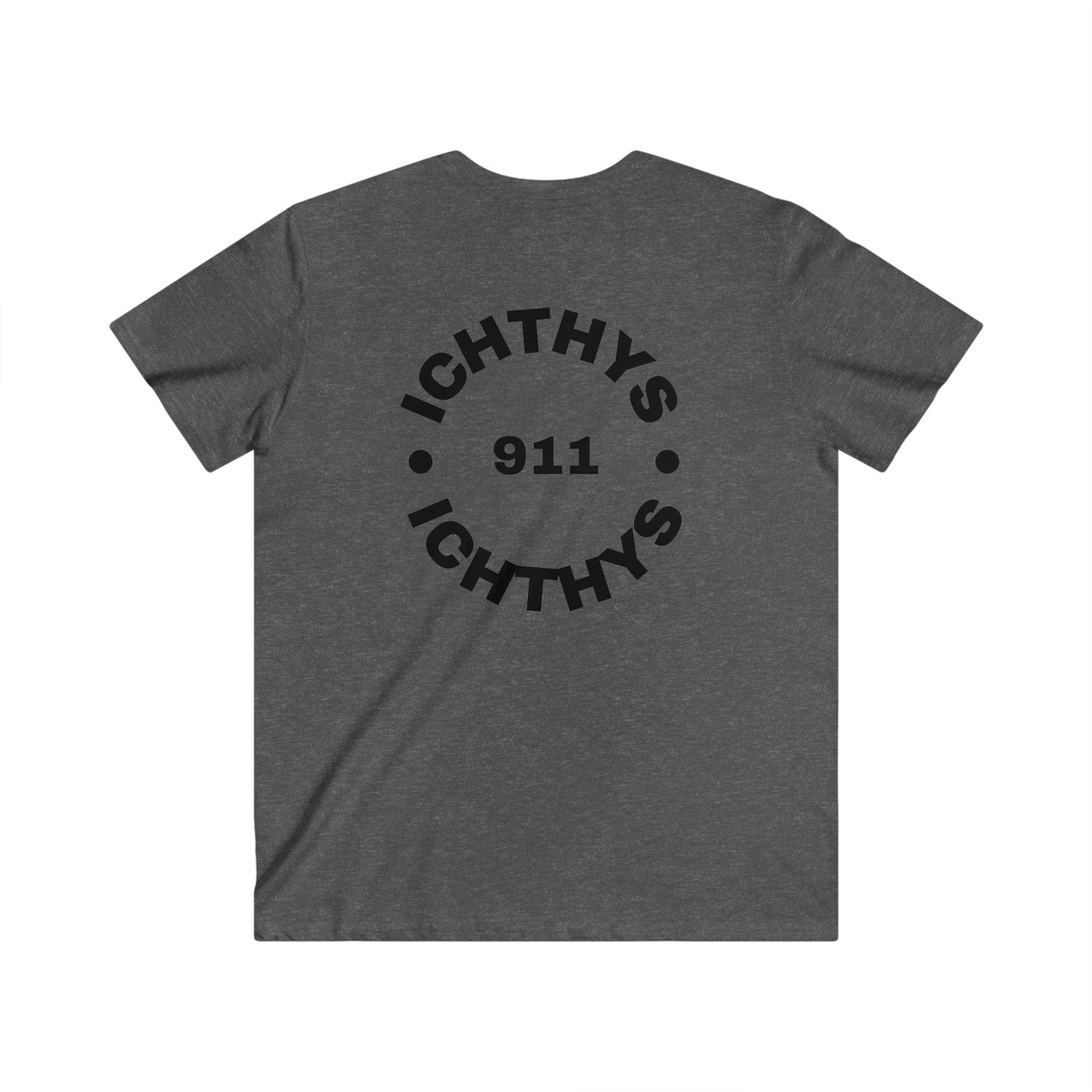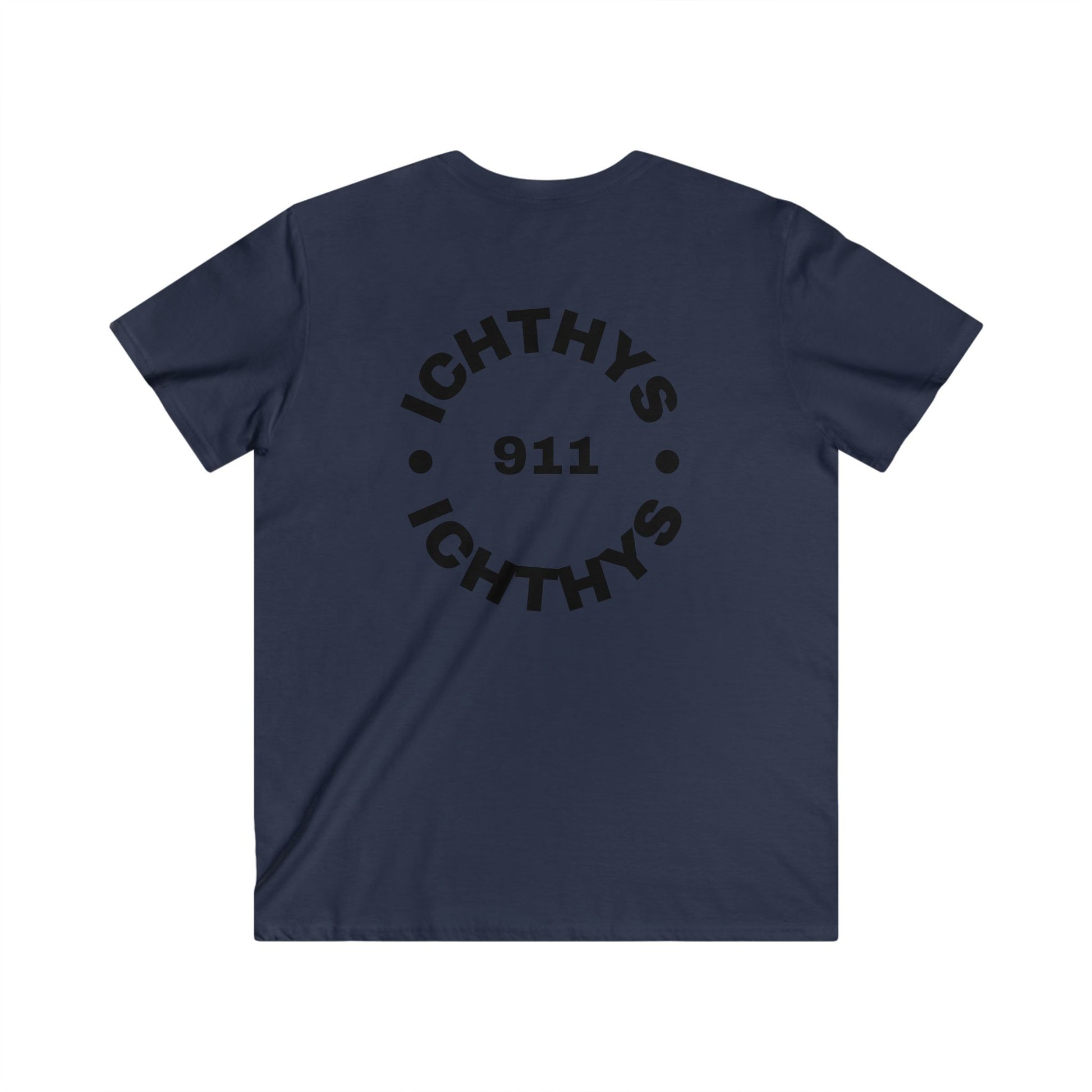ICHTHYS 911 - Authentic Round Collection - Men's Fitted V-Neck Short Sleeve T - Shirt - Faith-Inspired - Christian Faith - Black Font