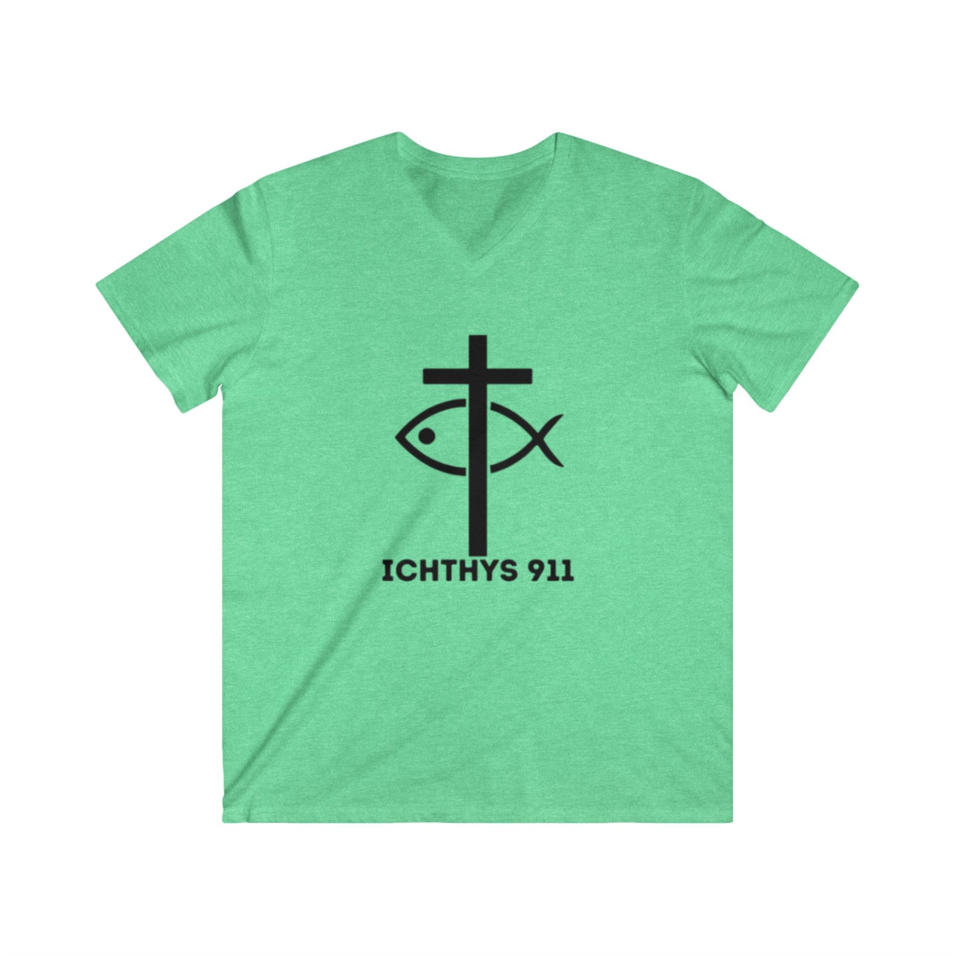 Introducing a stylish Men’s Fitted V-Neck Short Sleeve Tee, perfect for those who embrace faith and enjoy comfortable, everyday wear. This tee showcases a unique design featuring the ICHTHYS 911 Logo, blending contemporary style with spiritual expression. Made from soft, breathable fabric, it ensures all-day comfort and a flattering fit, making it a staple in any modern wardrobe. Whether you're attending a casual gathering, church service, or just lounging at home, this tee seamlessly fits into your lifestyle. It’s an ideal gift for fathers, brothers, or friends who appreciate thoughtful, faith-inspired apparel. Perfect for holidays, religious gatherings, or everyday wear, this tee invites conversations about faith and personal beliefs.
