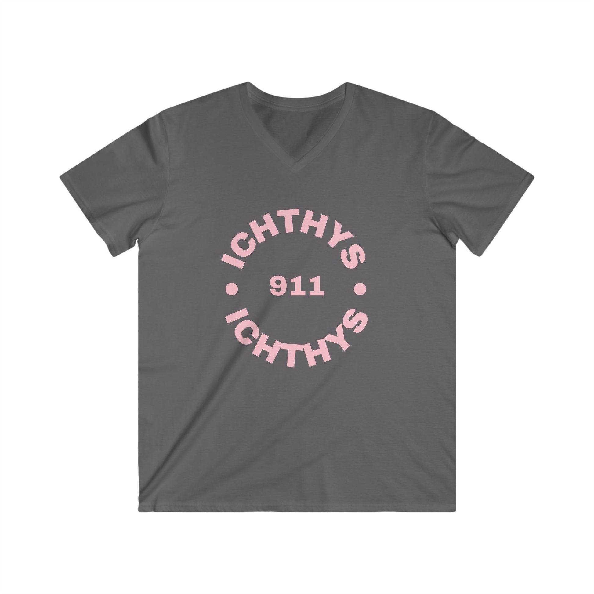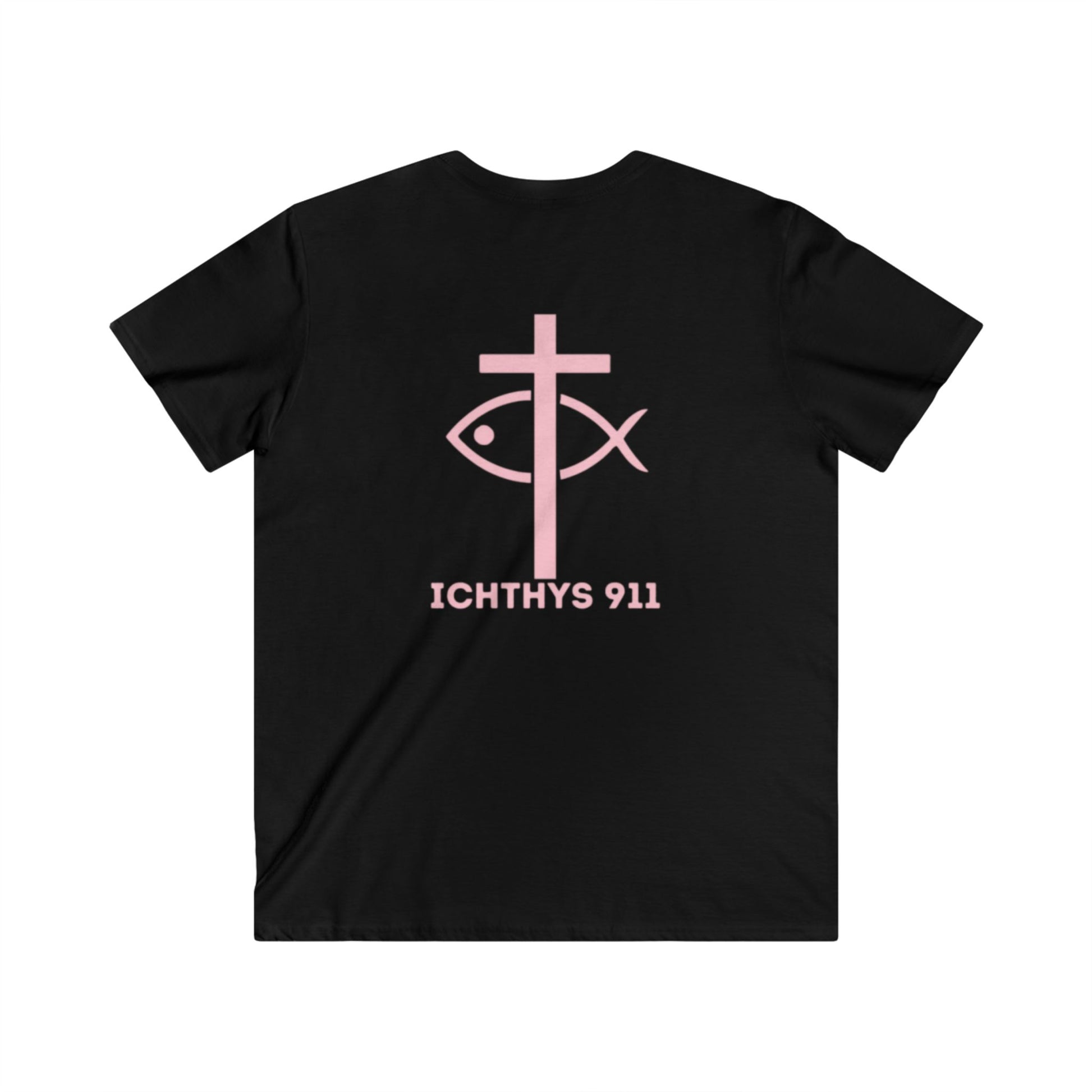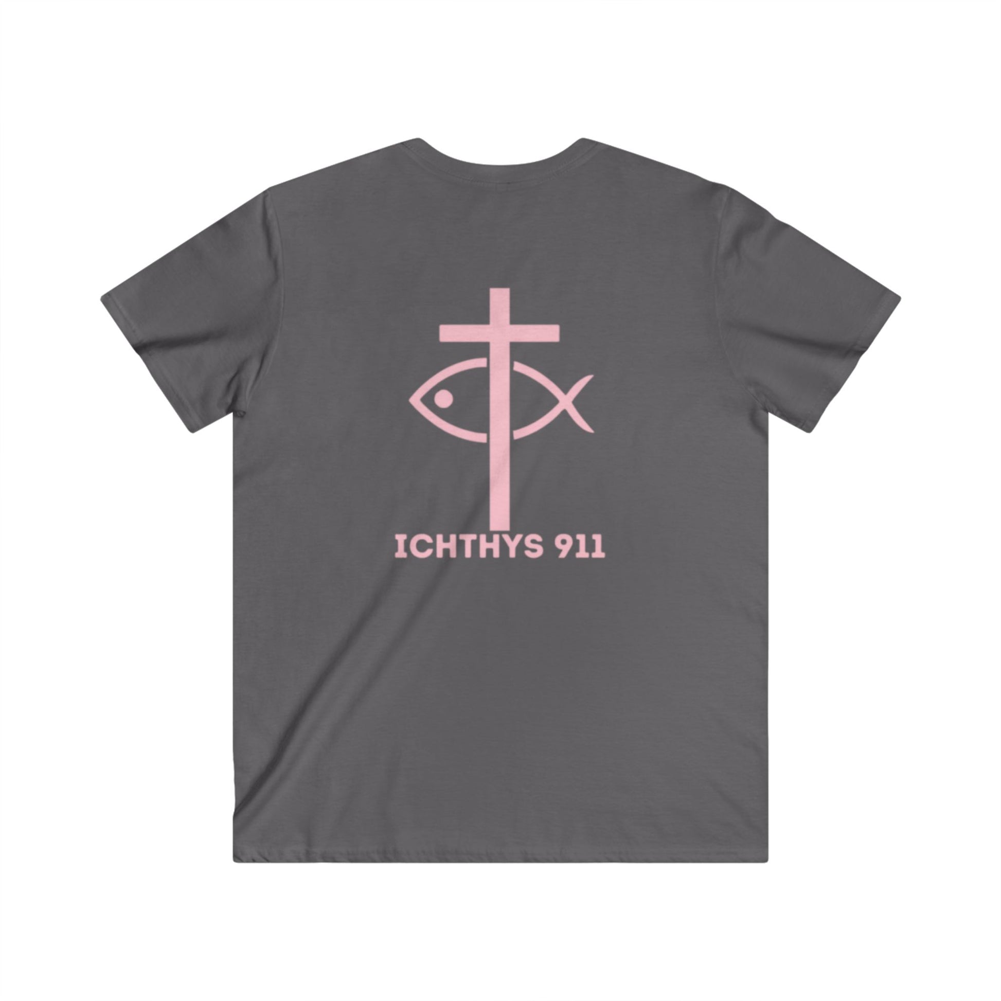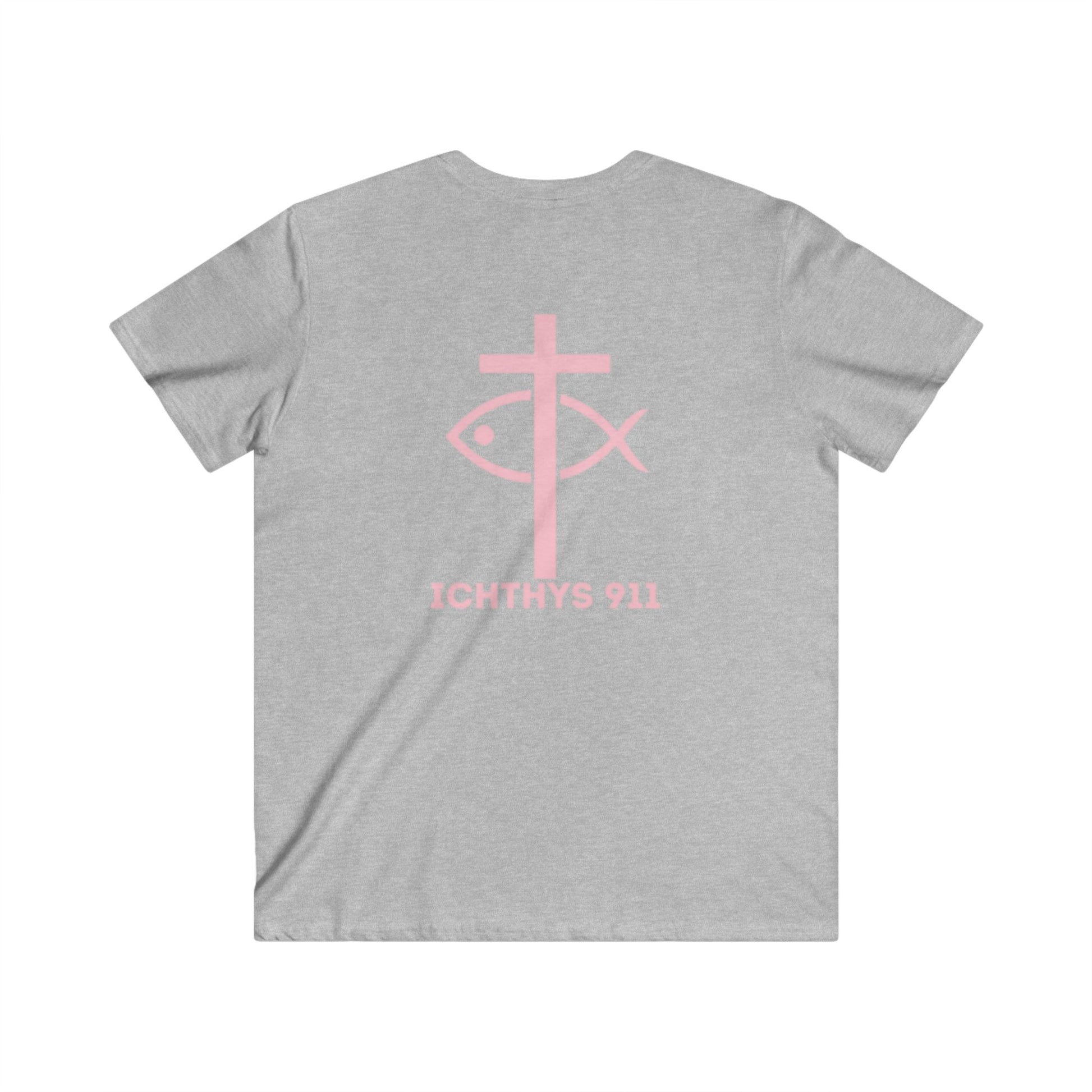 ICHTHYS 911 - Authentic Round Collection - Men's Fitted V-Neck Short Sleeve T - Shirt - Faith-Inspired - Christian Faith - Pink Font