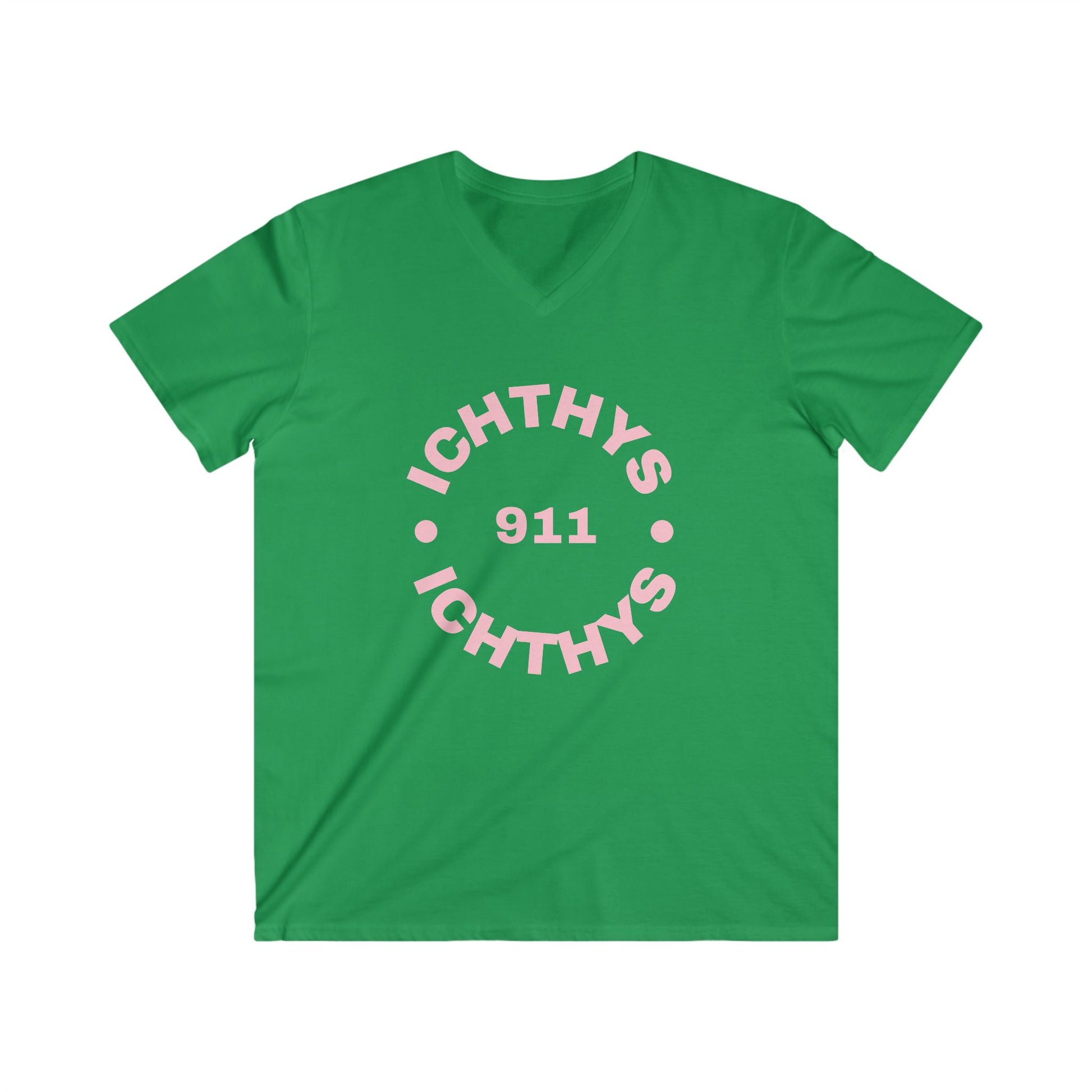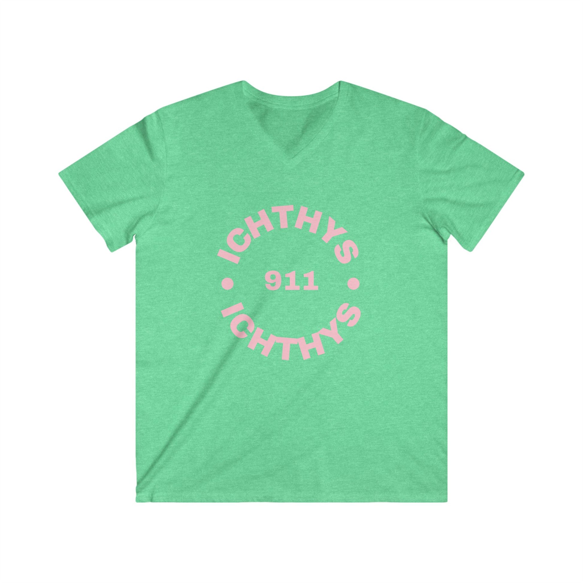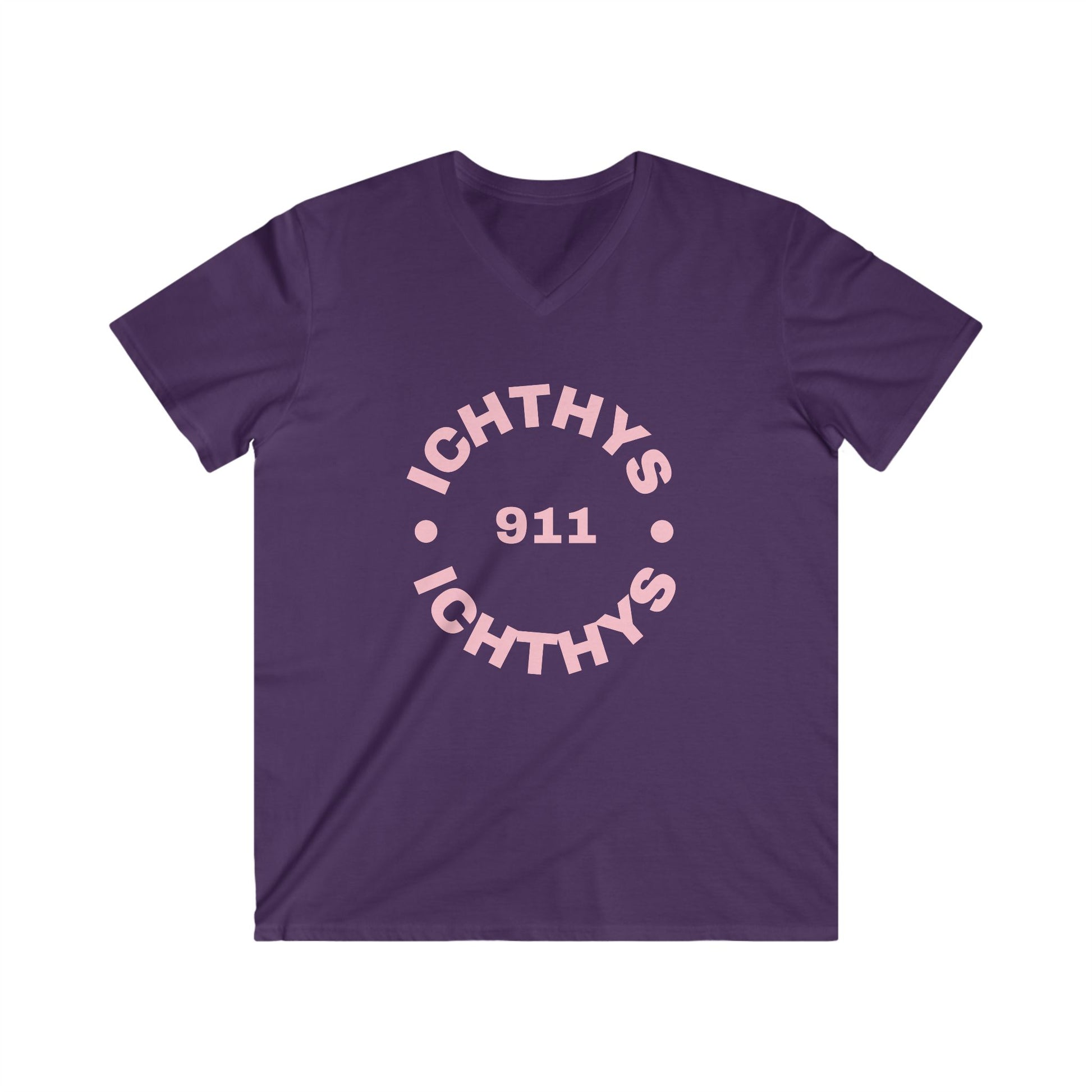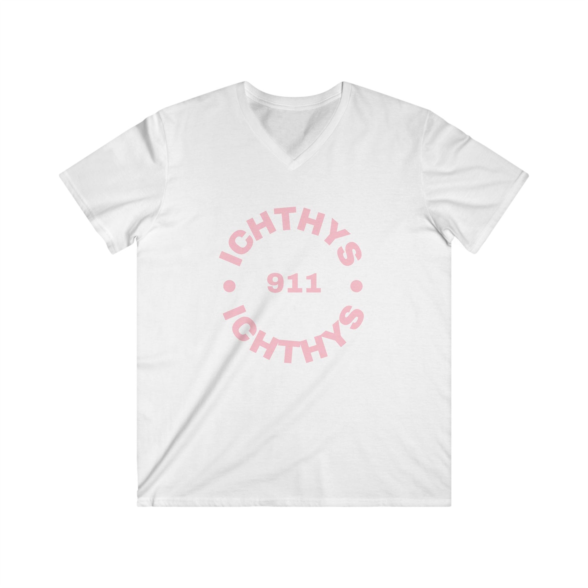 ICHTHYS 911 - Authentic Round Collection - Men's Fitted V-Neck Short Sleeve T - Shirt - Faith-Inspired - Christian Faith - Pink Font