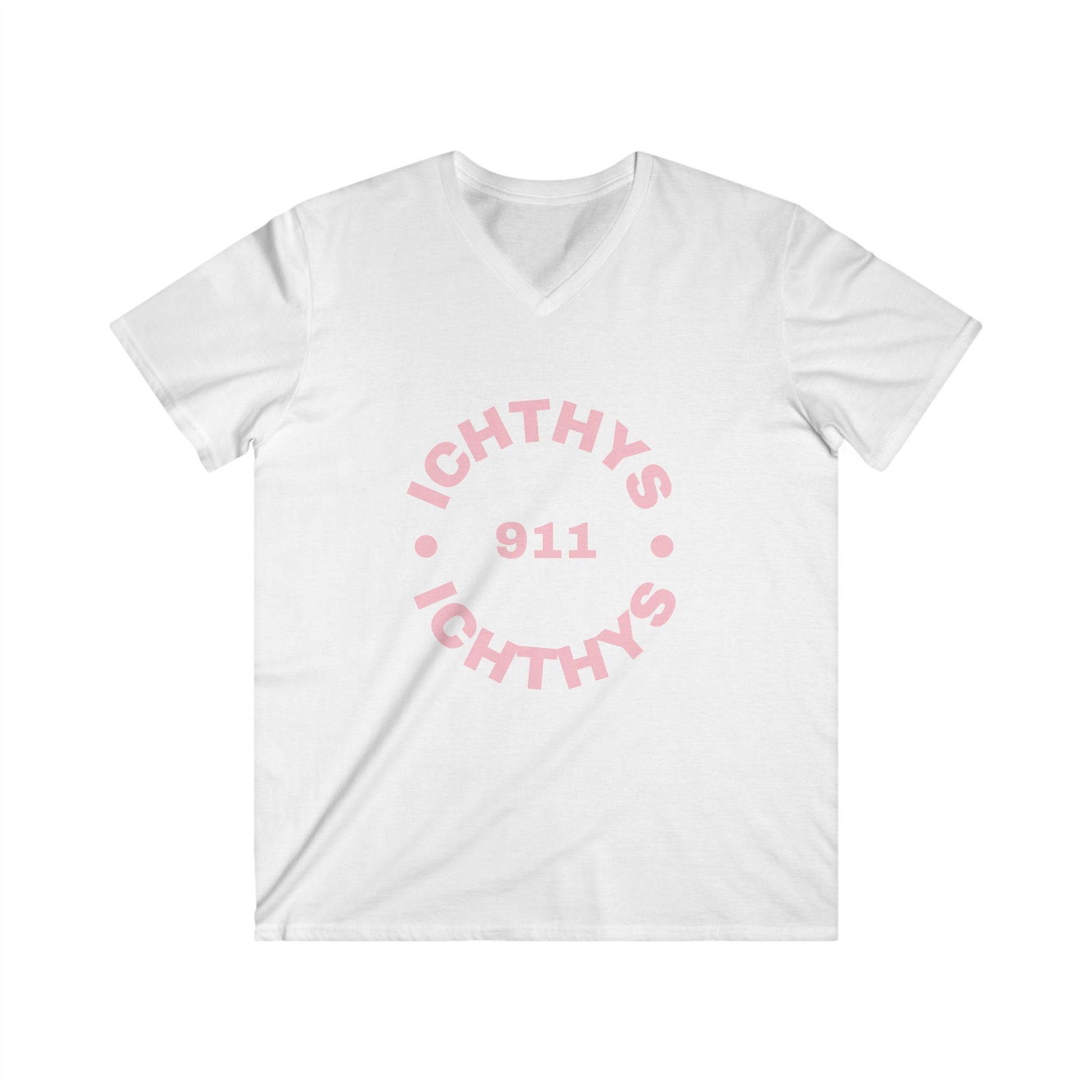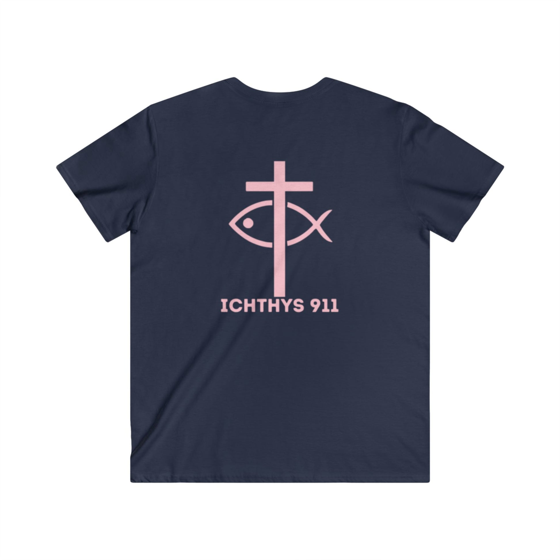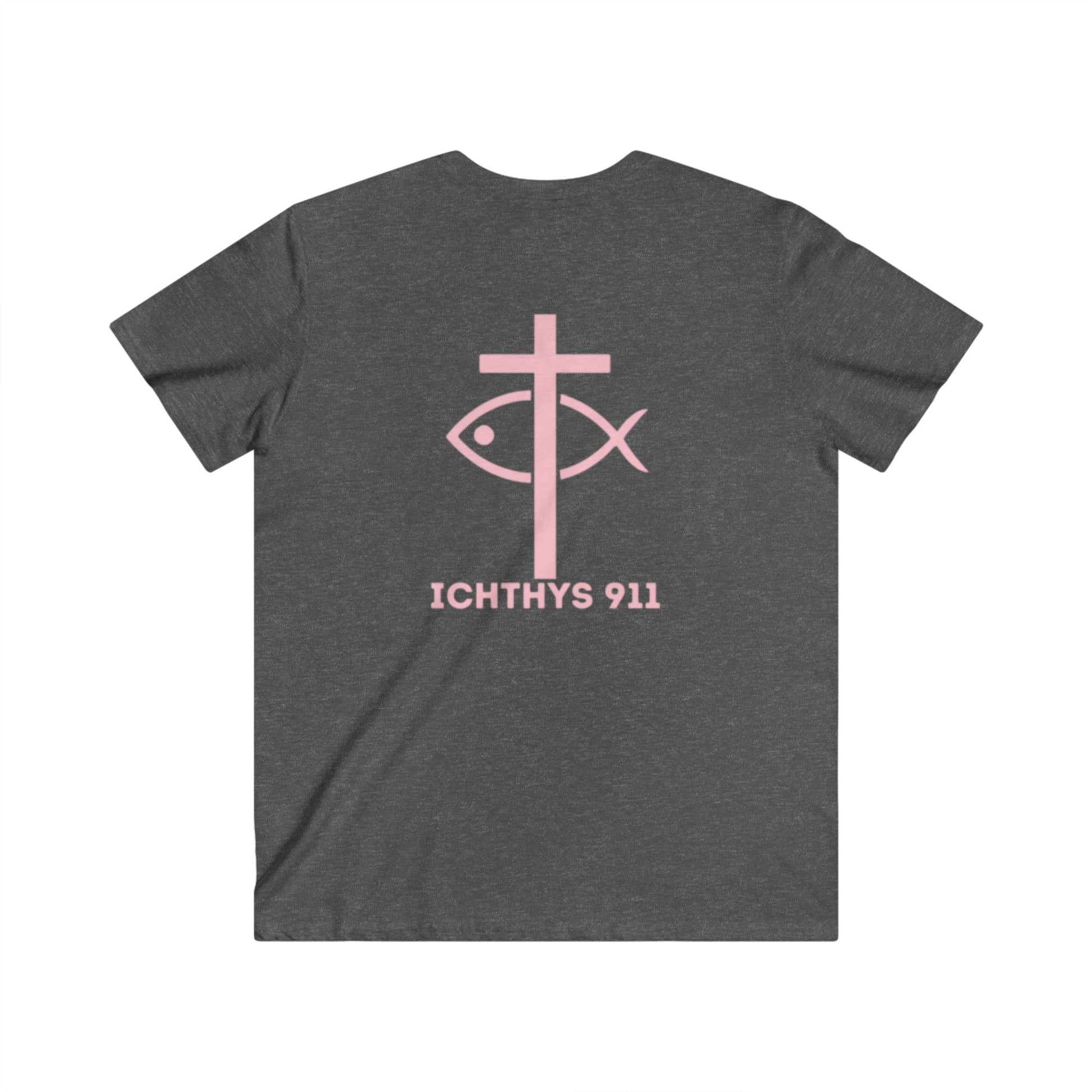 ICHTHYS 911 - Authentic Round Collection - Reverse - Men's Fitted V-Neck Short Sleeve T - Shirt - Faith-Inspired - Christian Faith - Pink Font