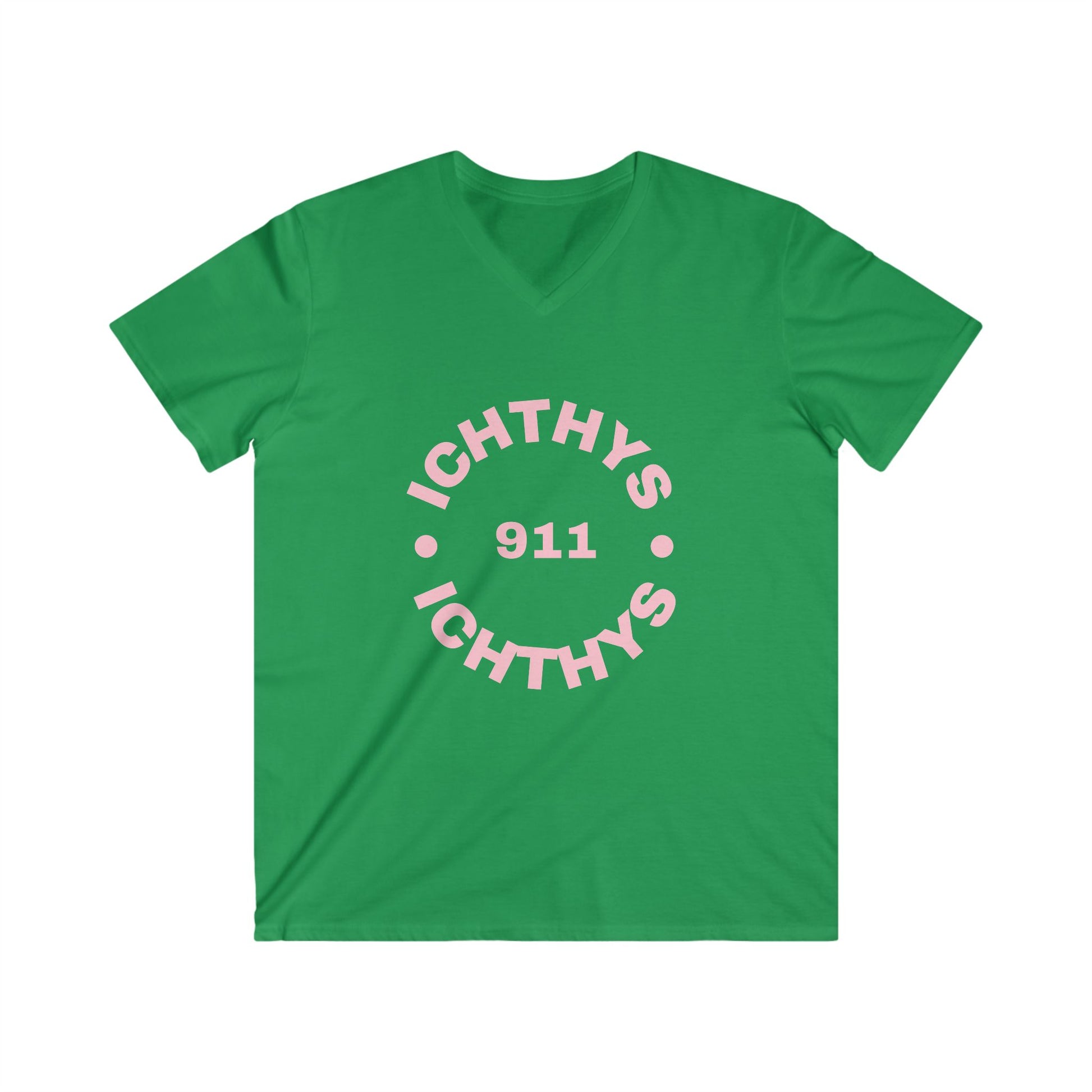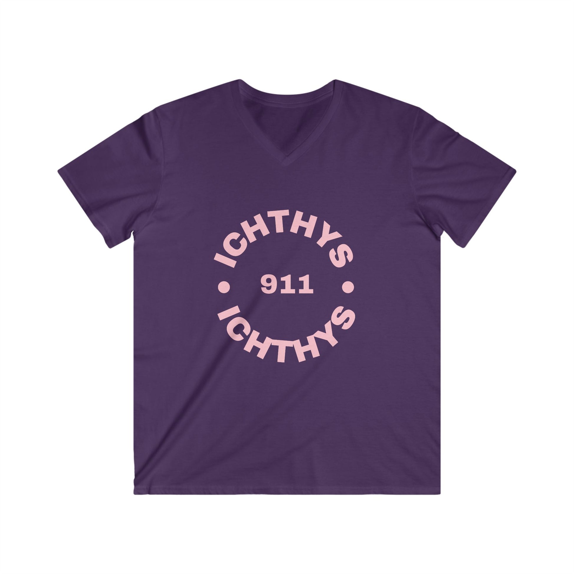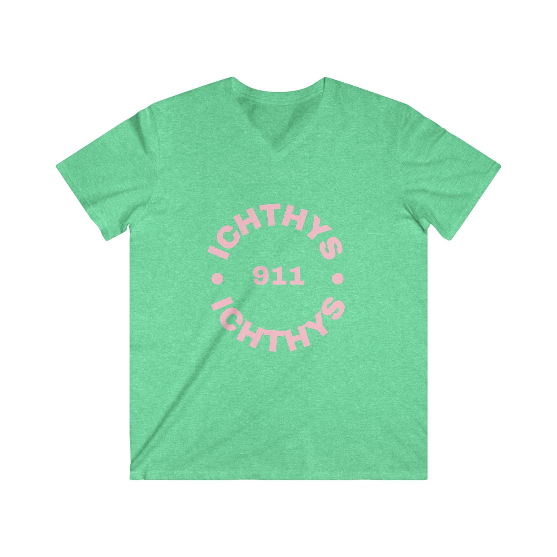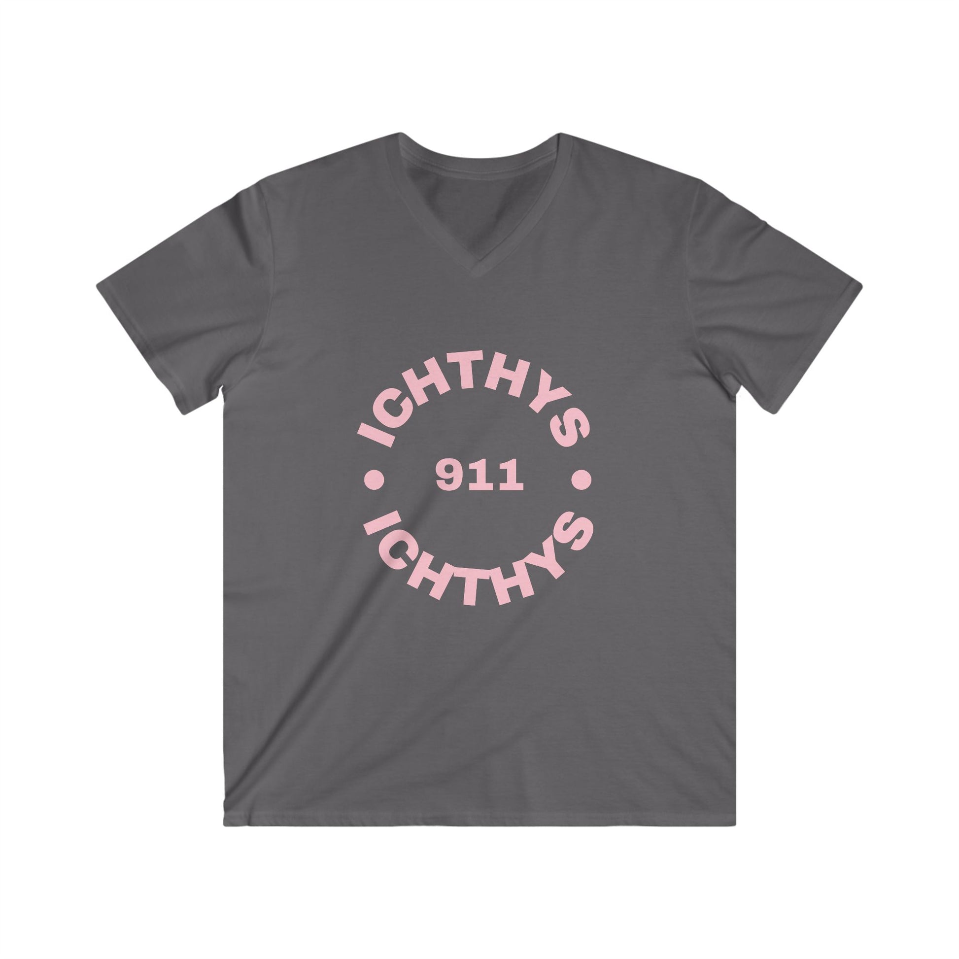 ICHTHYS 911 - Authentic Round Collection - Reverse - Men's Fitted V-Neck Short Sleeve T - Shirt - Faith-Inspired - Christian Faith - Pink Font