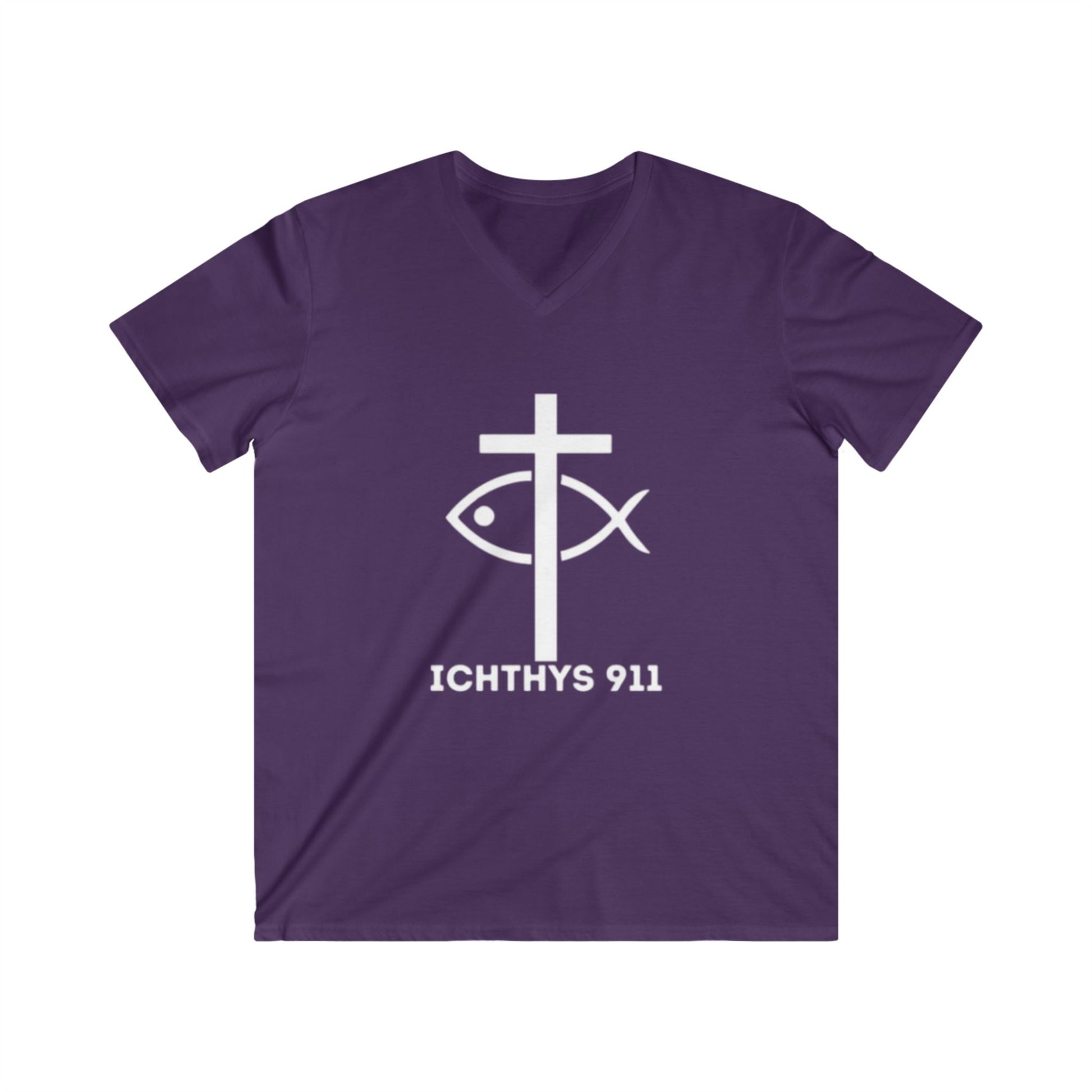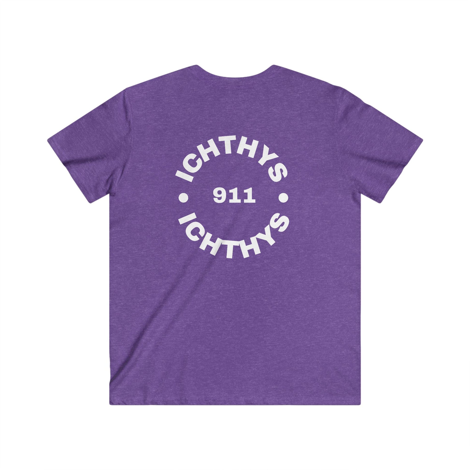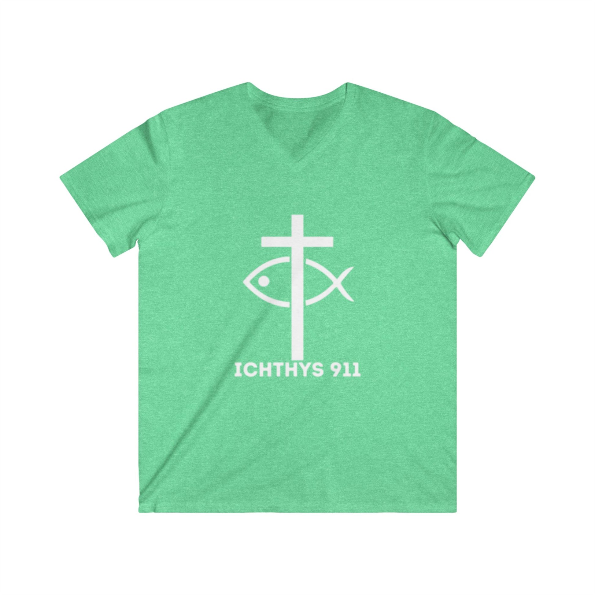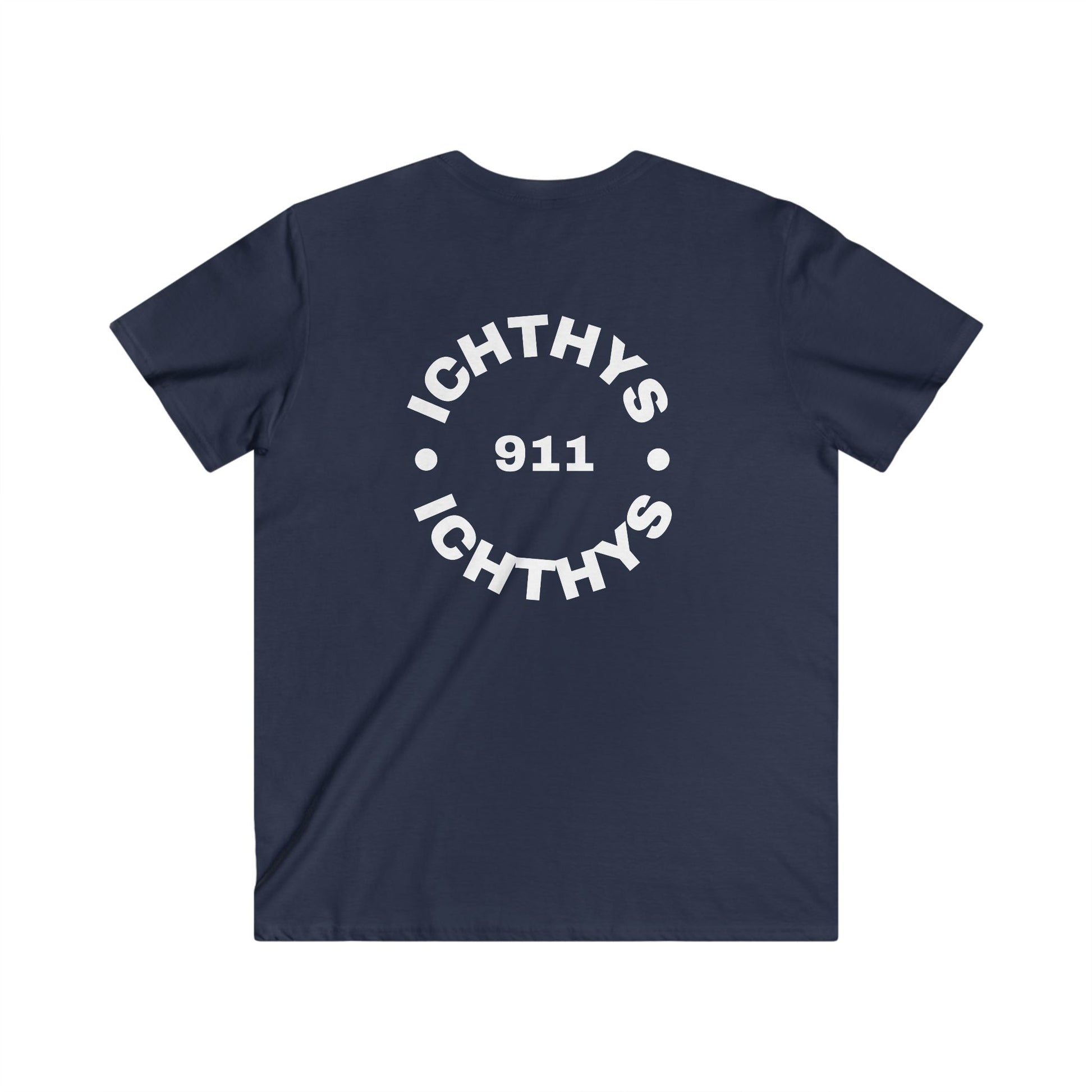 ICHTHYS 911 - Authentic Round Collection - Men's Fitted V-Neck Short Sleeve T - Shirt - Faith-Inspired - Christian Faith - White Font