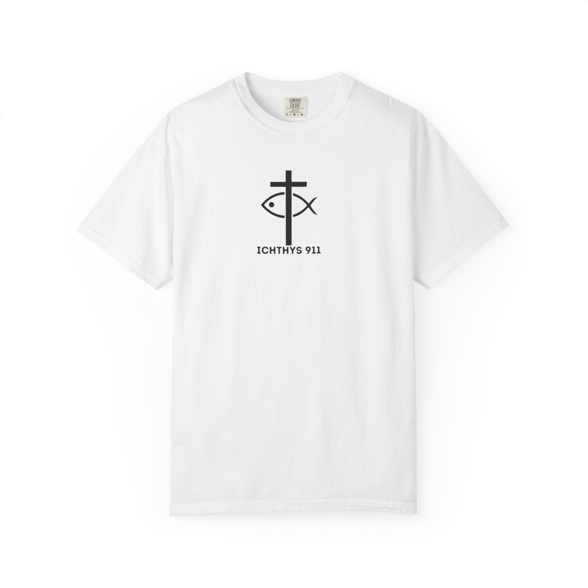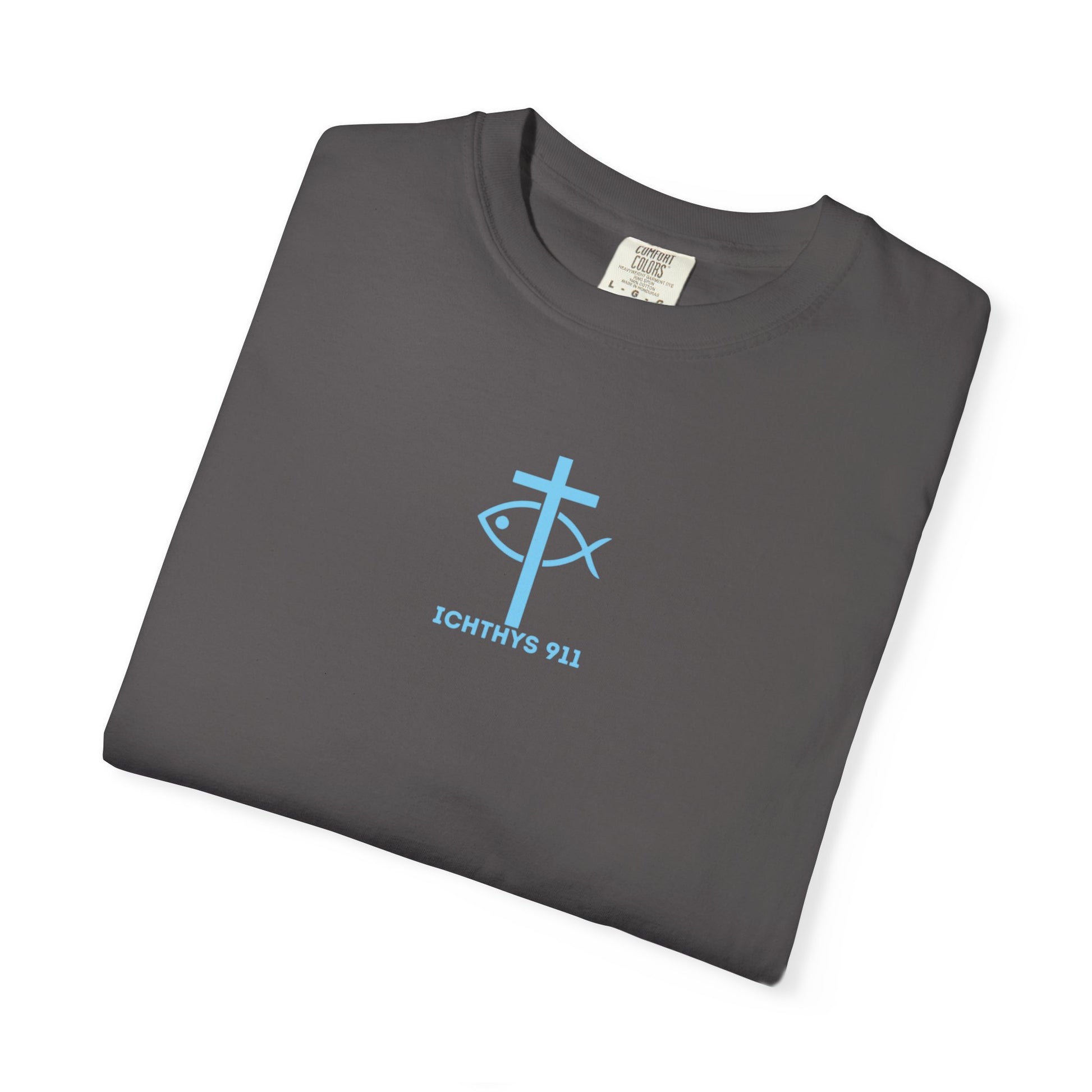 ICHTHYS 911 - "ICHTHYS Round" Blue Font - Christian Streetwear T-Shirt – Unisex Garment-Dyed T-Shirt - Men T-Shirt - Women T-Shirt - Jesus Gym & Faith Fashion,