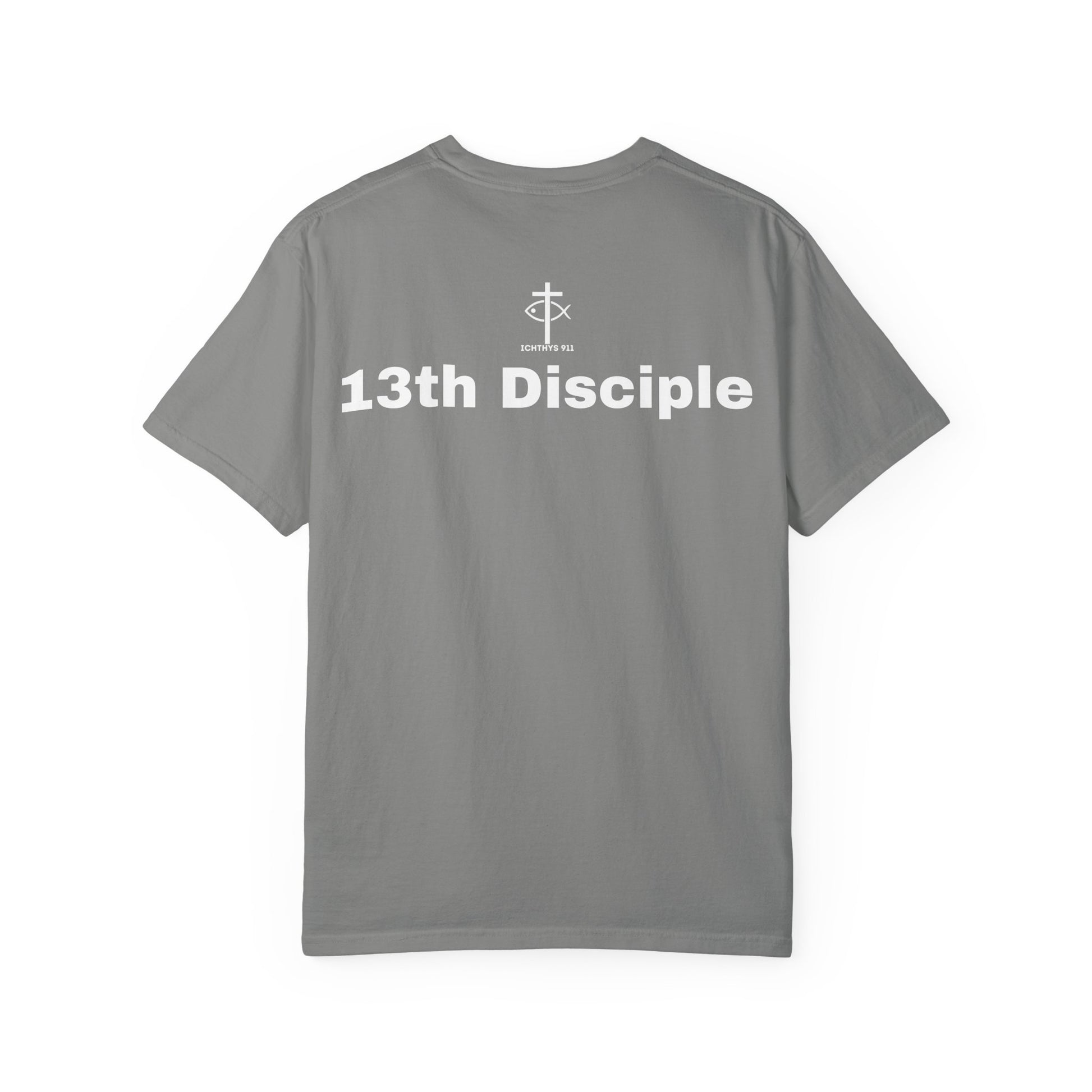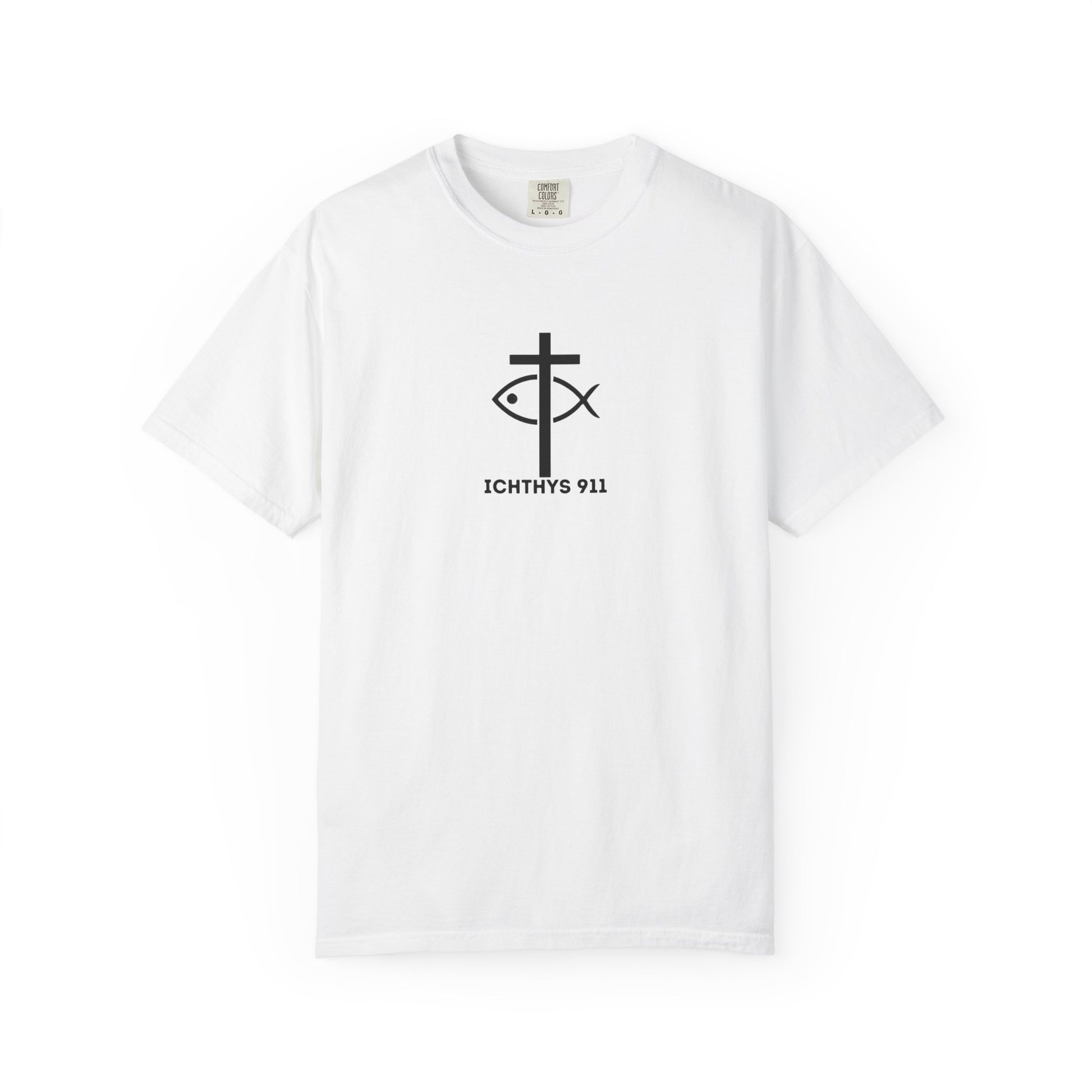 ICHTHYS 911 - 13th Disciple Collection - Christian Streetwear T-Shirt / Sweatshirt – Jesus Gym & Faith Fashion, Unisex Garment-Dyed T-Shirt White Font