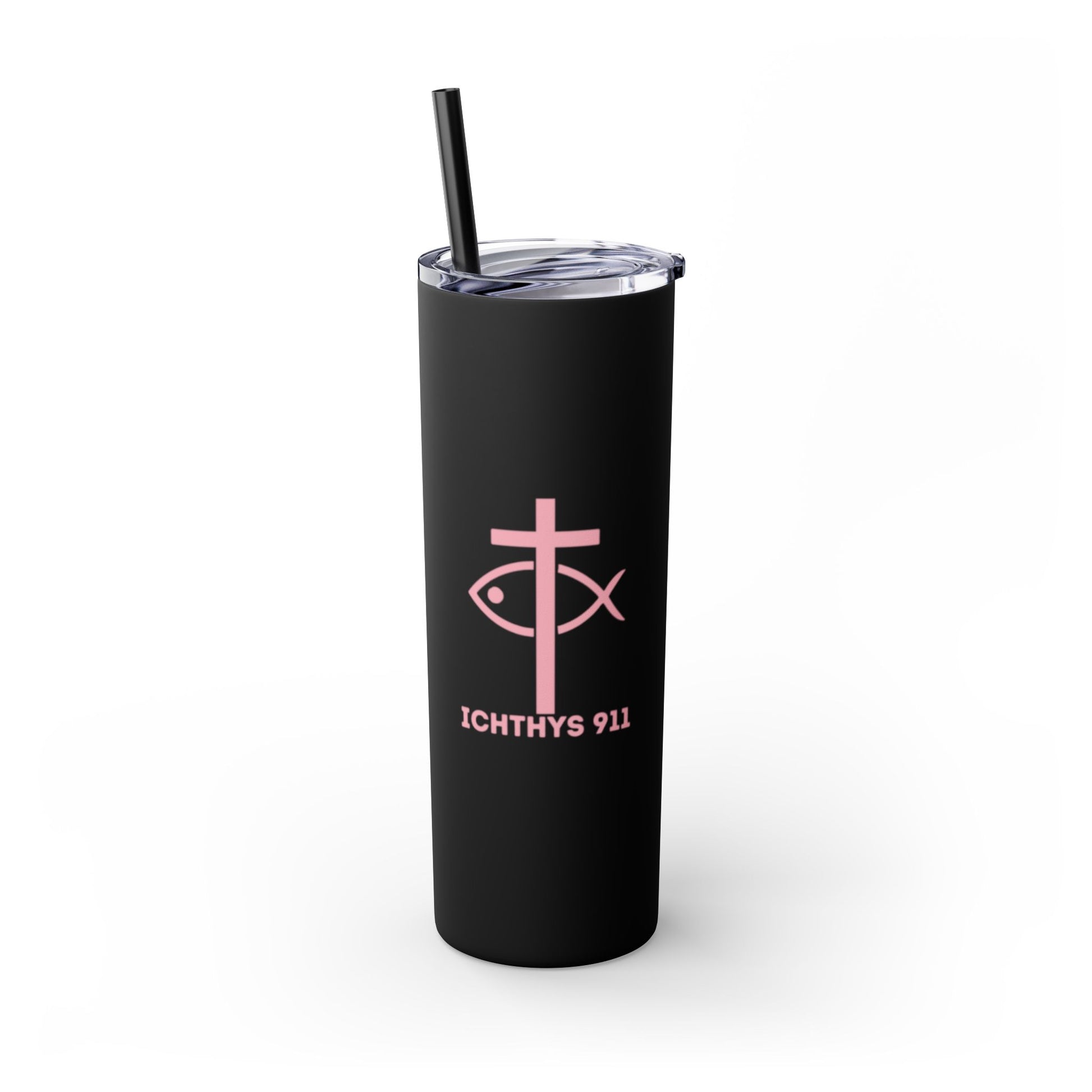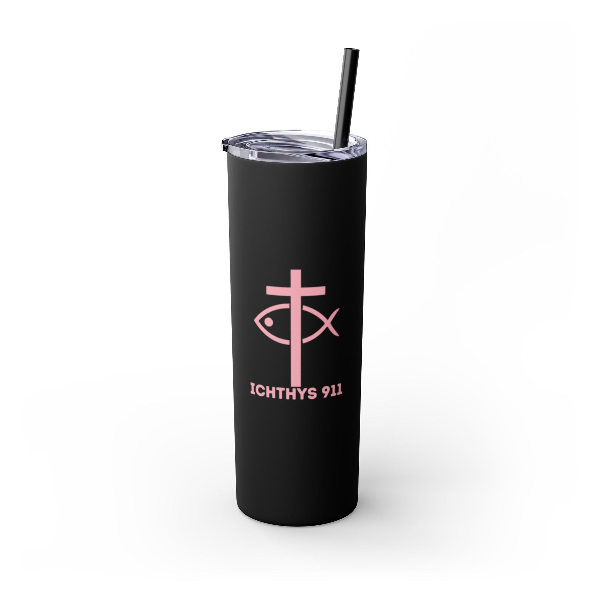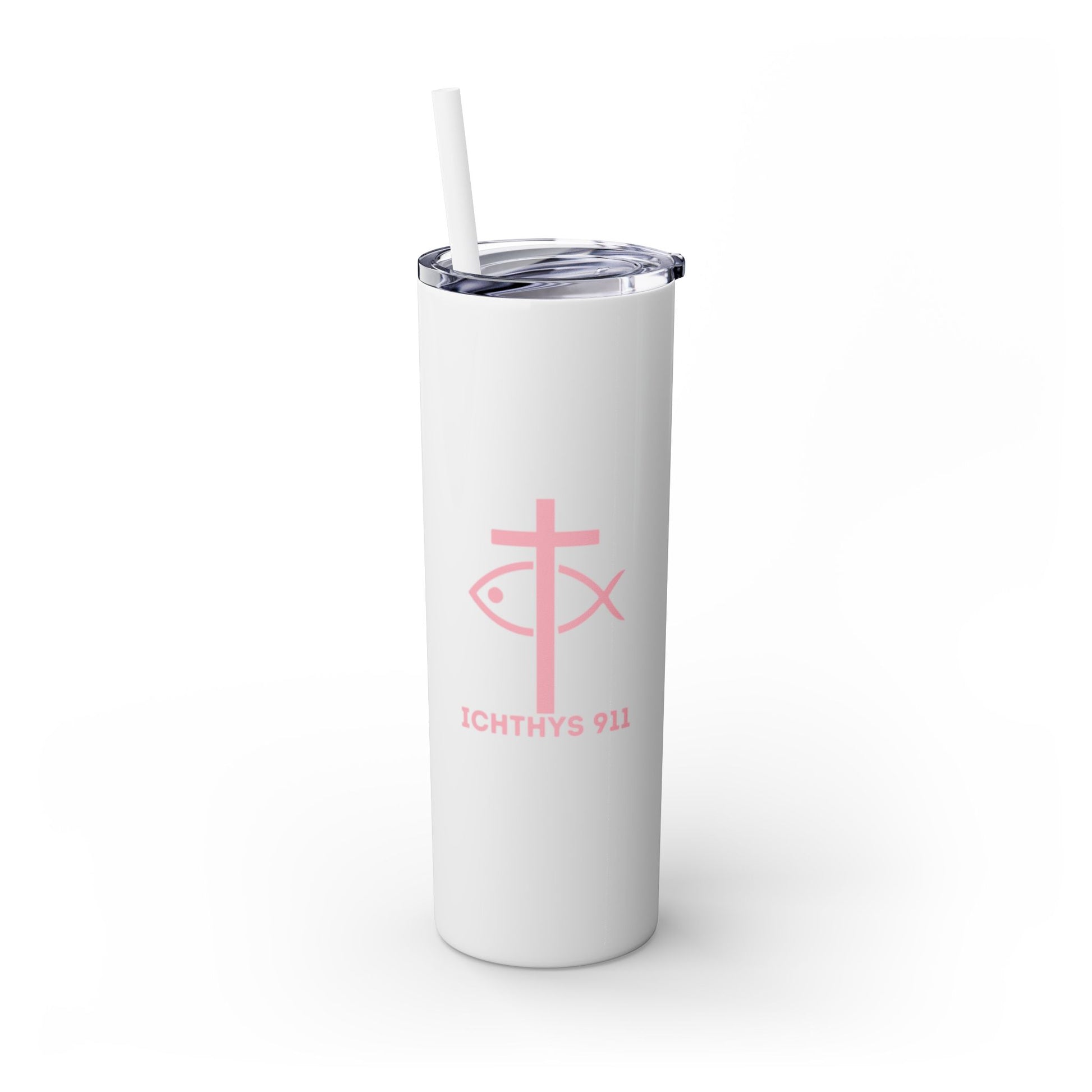 ICHTHYS 911 Pink Font Faith-Inspired Skinny Tumbler with Straw - 20oz