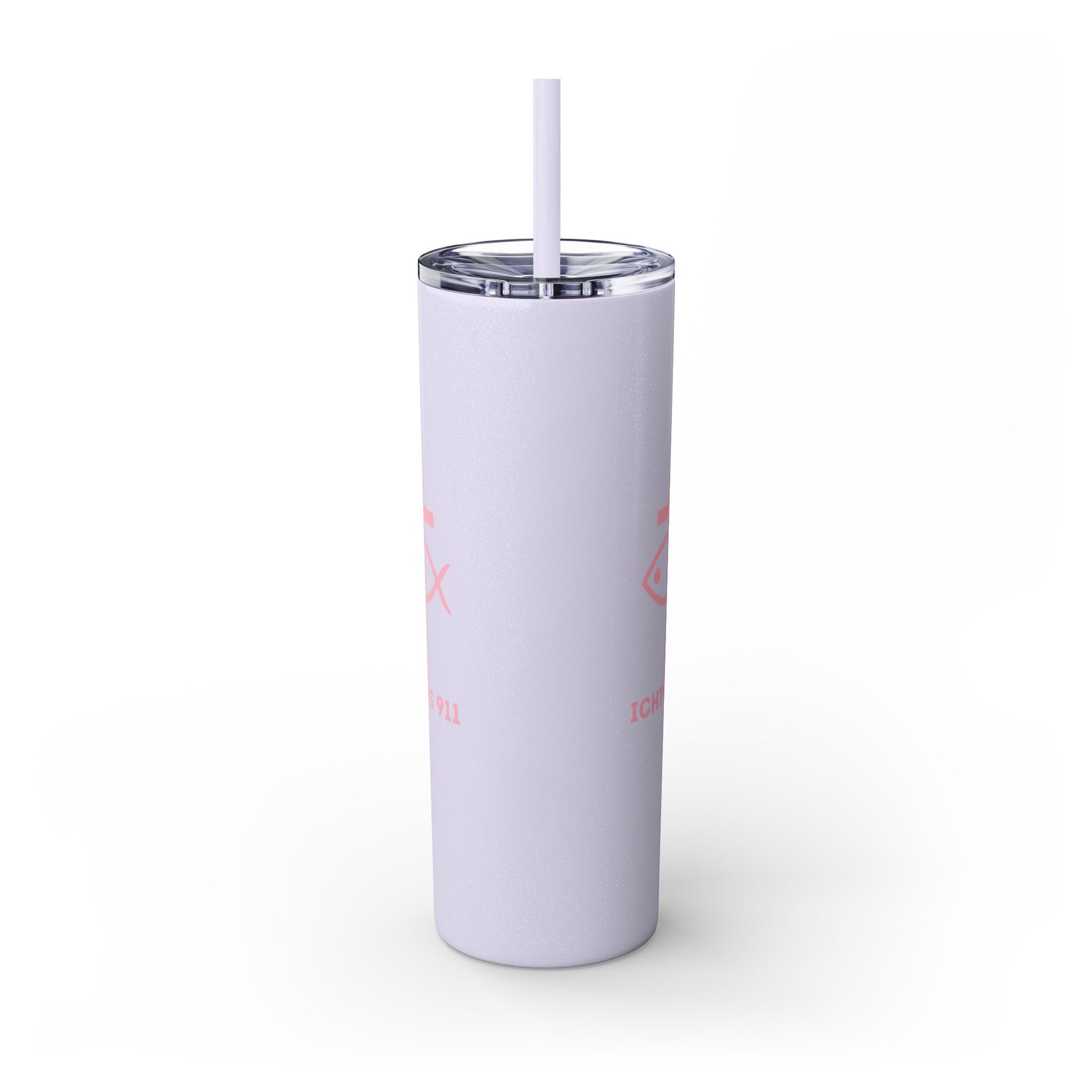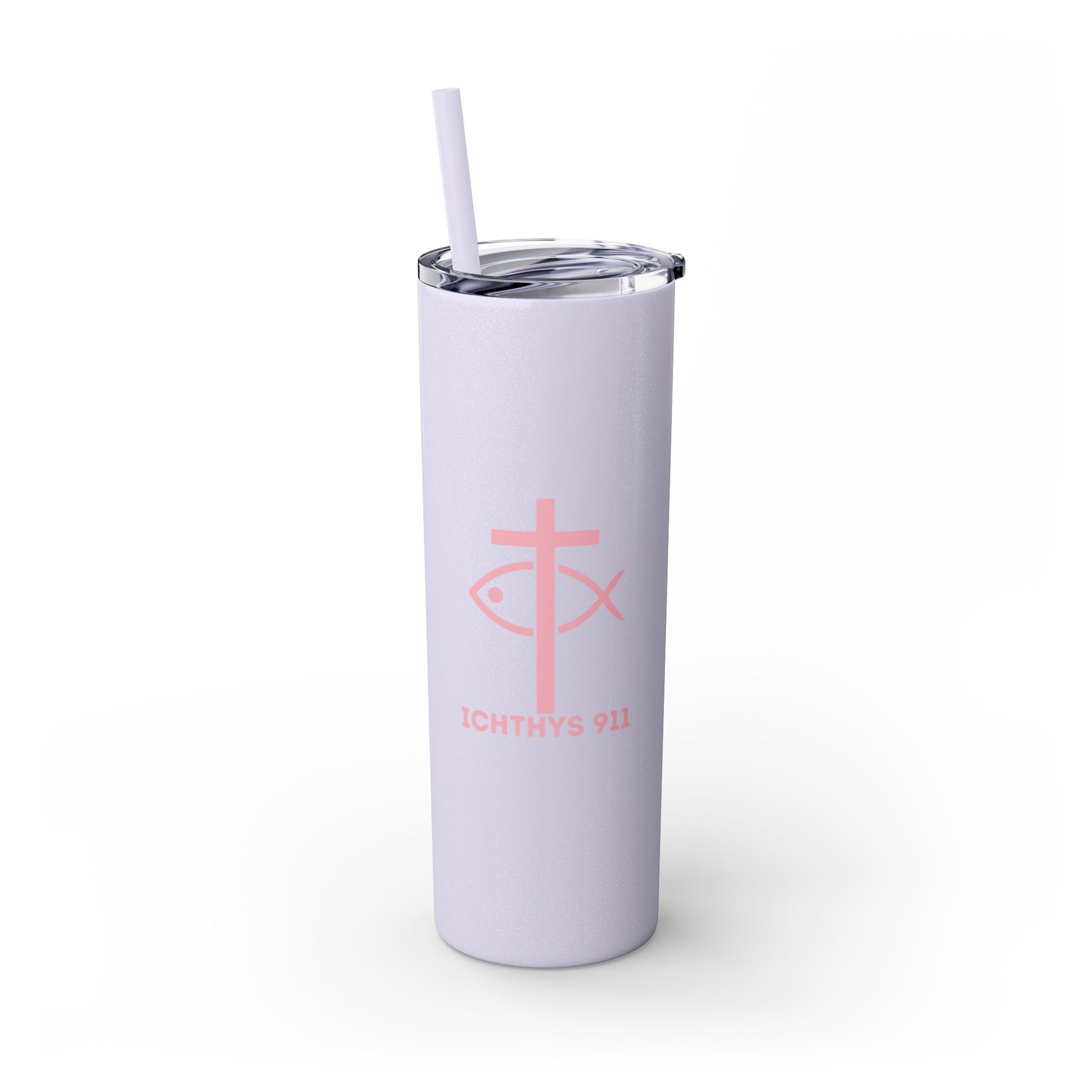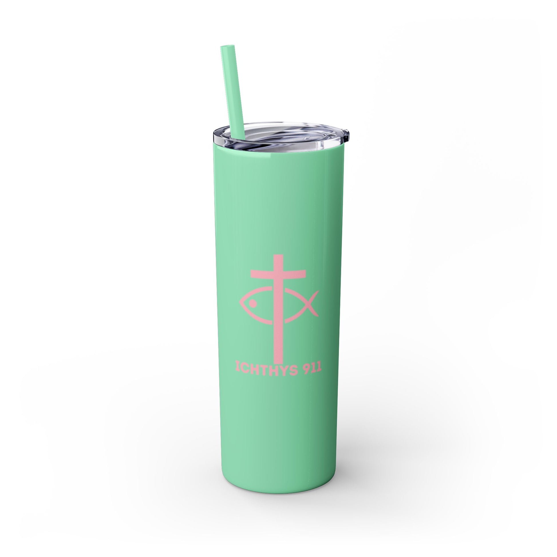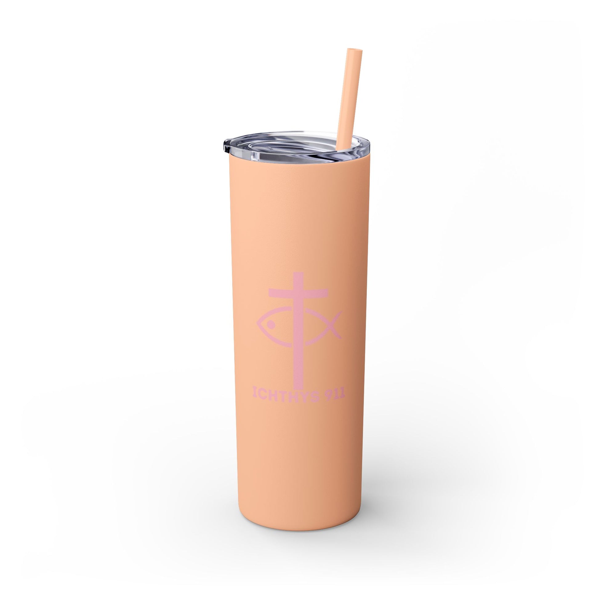ICHTHYS 911 Pink Font Faith-Inspired Skinny Tumbler with Straw - 20oz