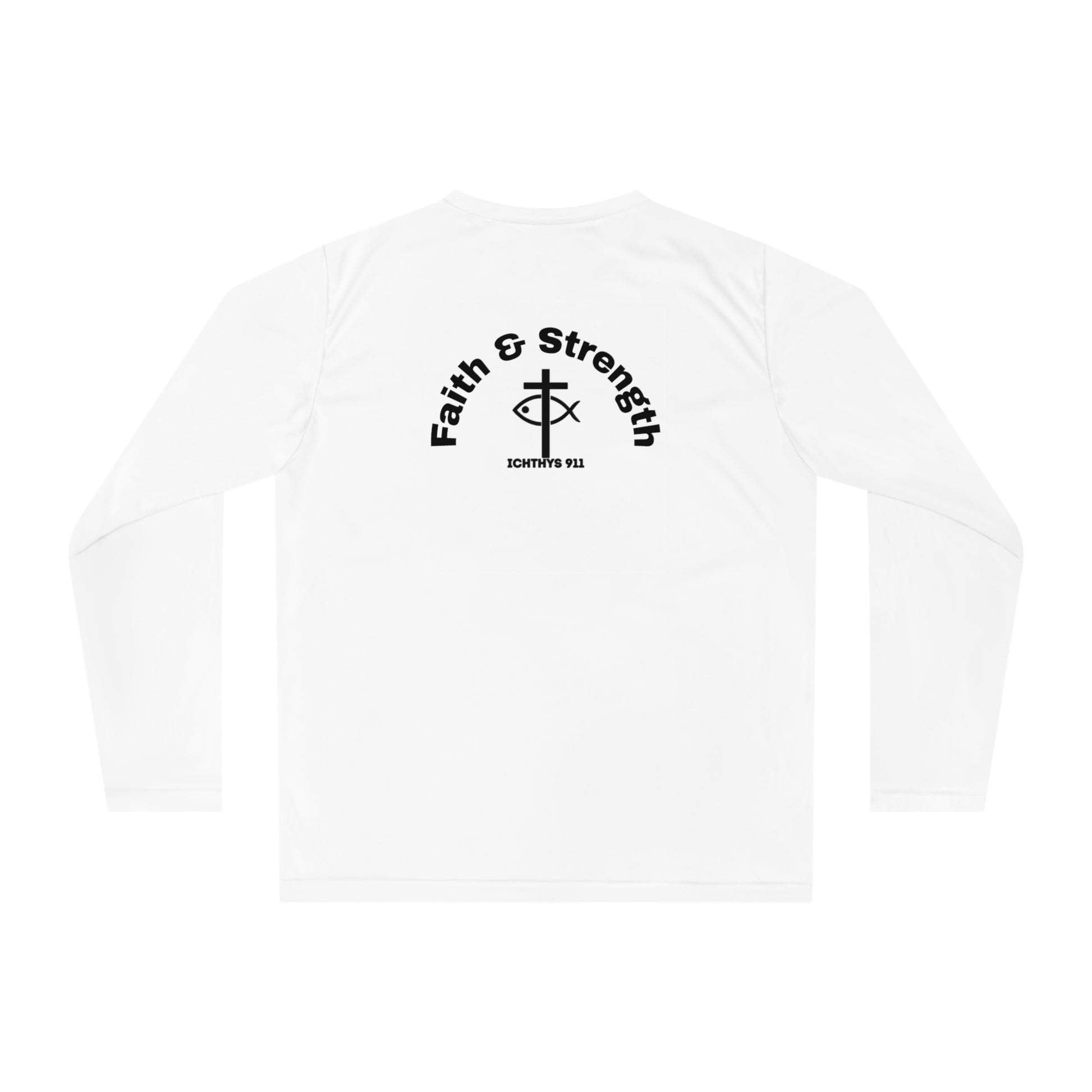 "Faith & Strength" White Font - Unisex Performance Long Sleeve Shirt - Christian Activewear - Men - Women -100% Moisture-Wicking Poly - ICHTHYS 911