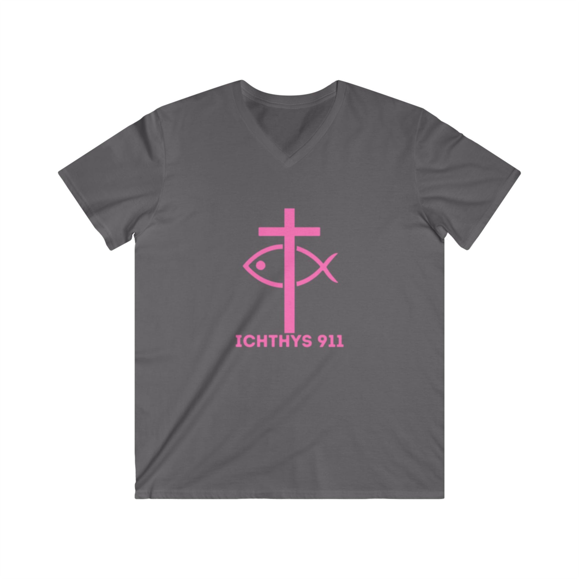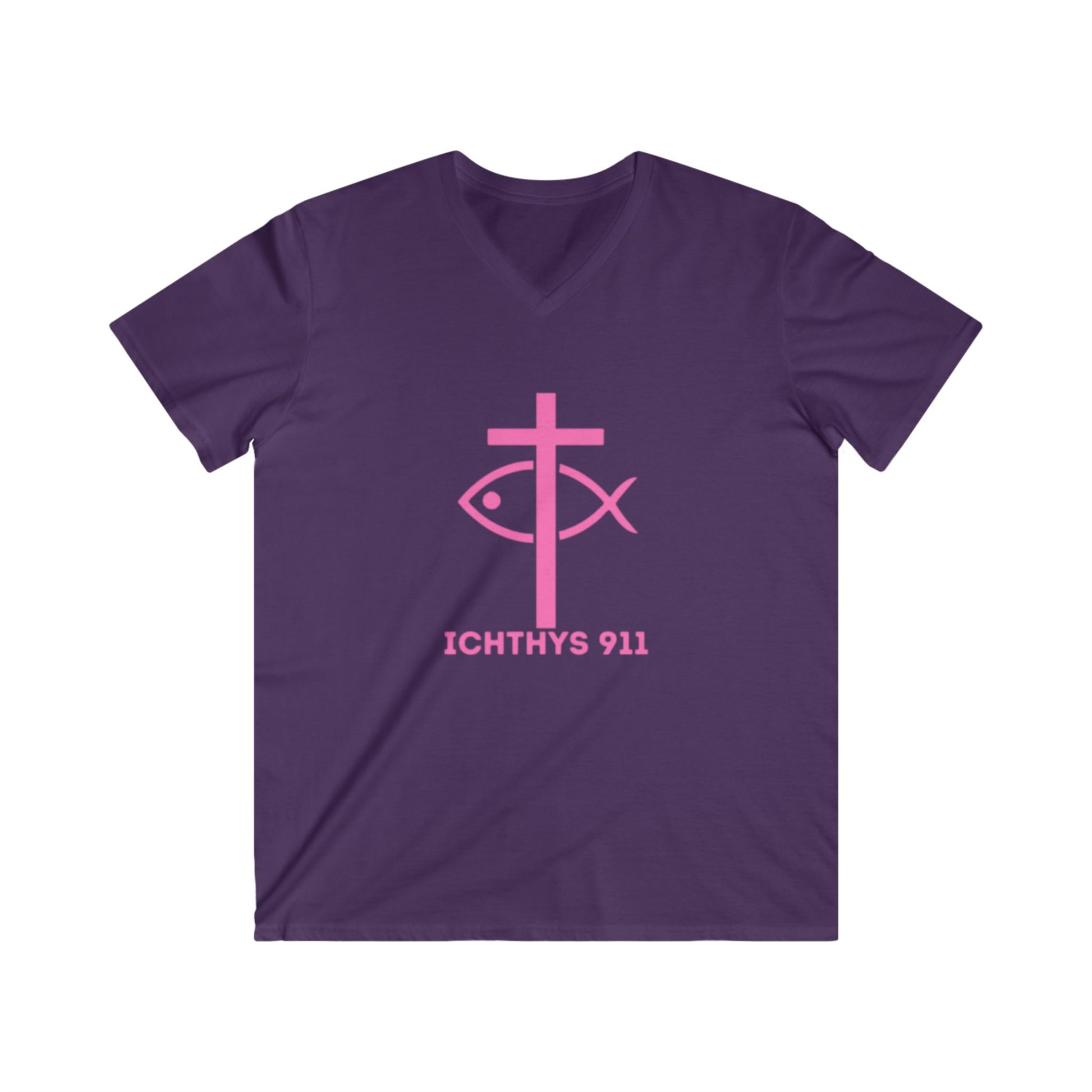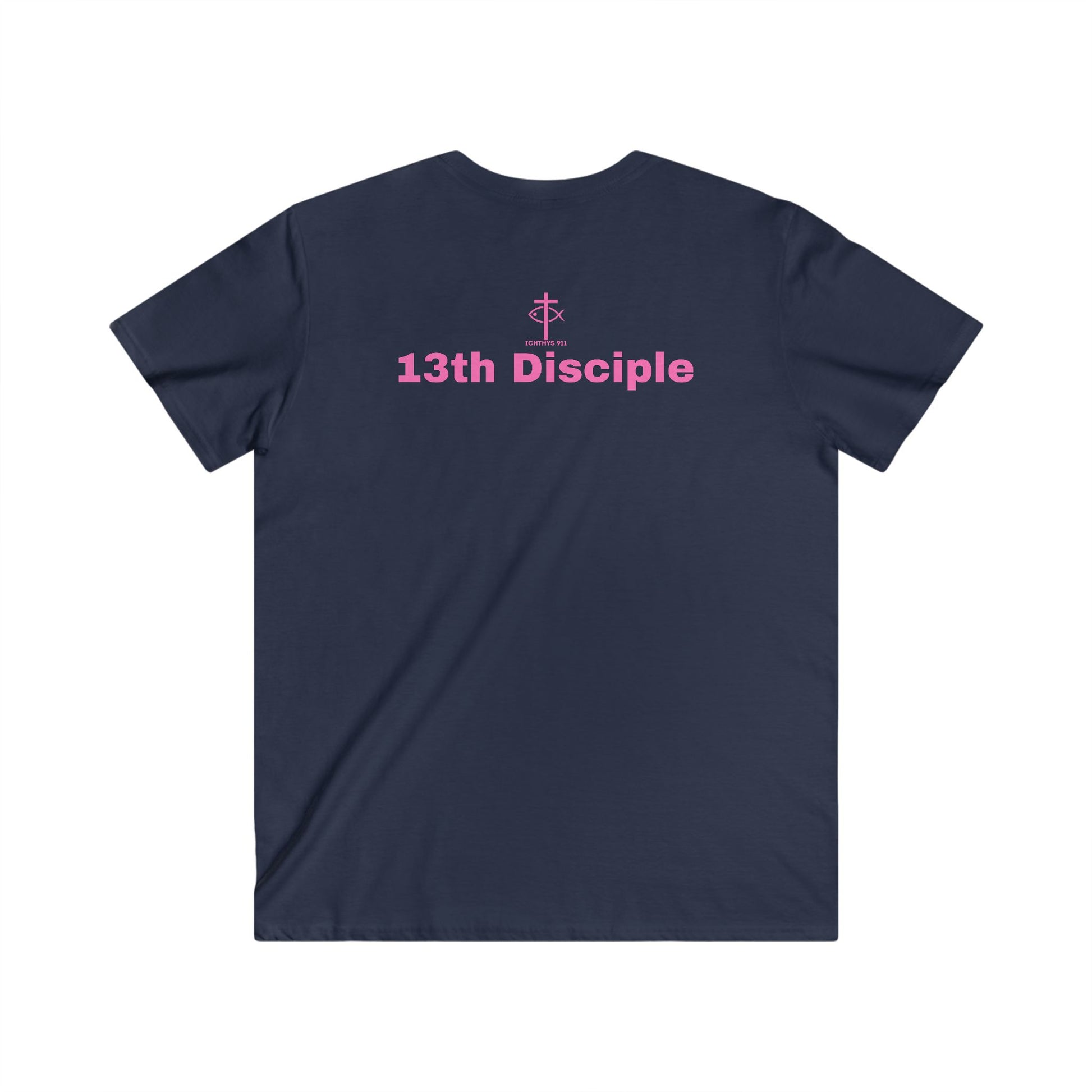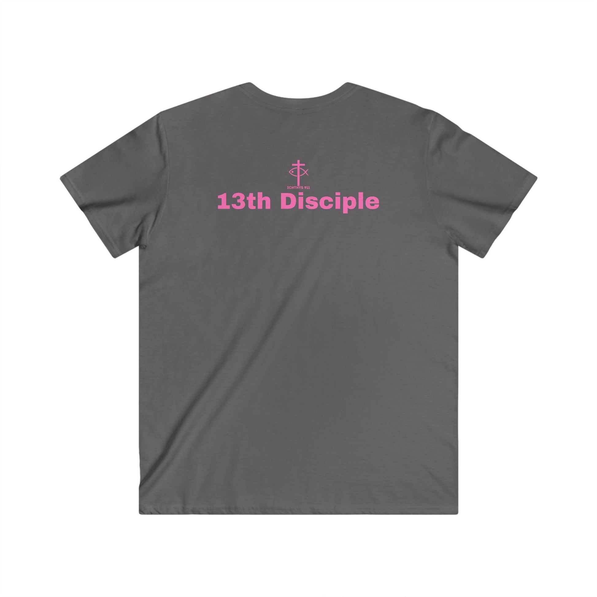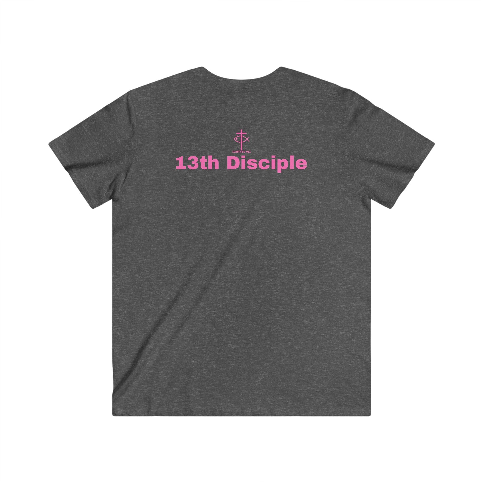 "13th Disciple" Collection - Men's Fitted V-Neck Short Sleeve T - Shirt - W/O IC 911 on Back - Faith-Inspired - Christian Faith - Pink Font - ICHTHYS 911