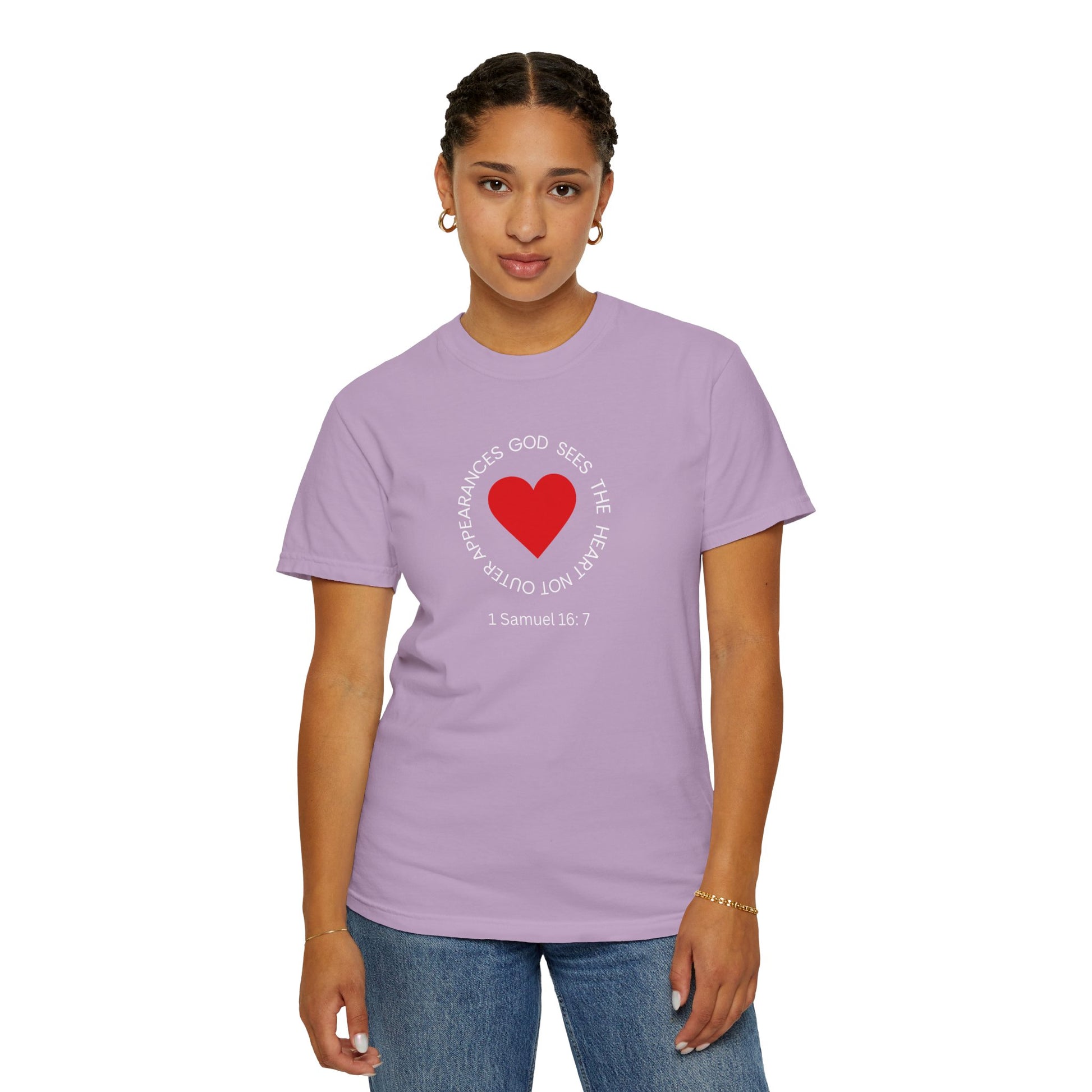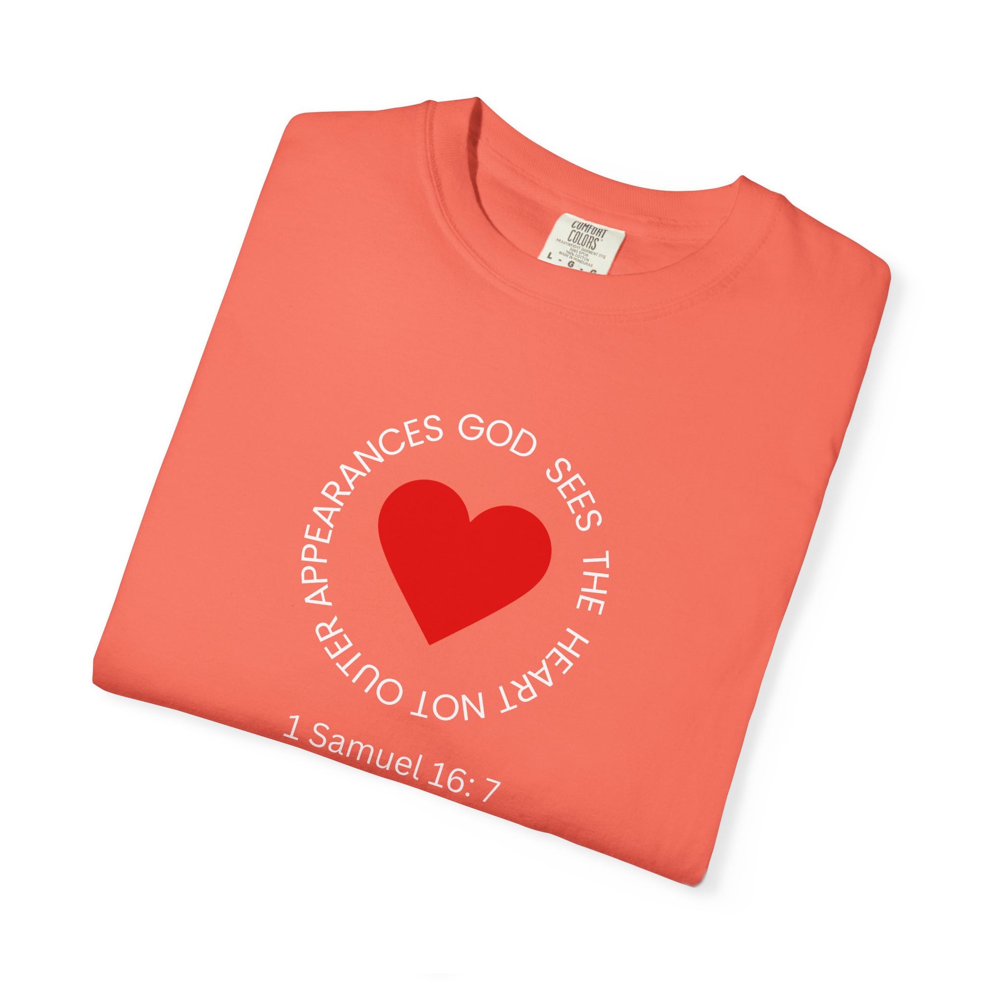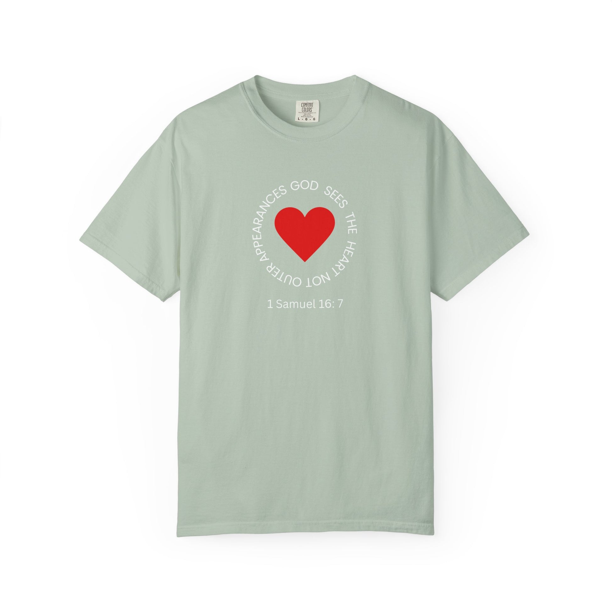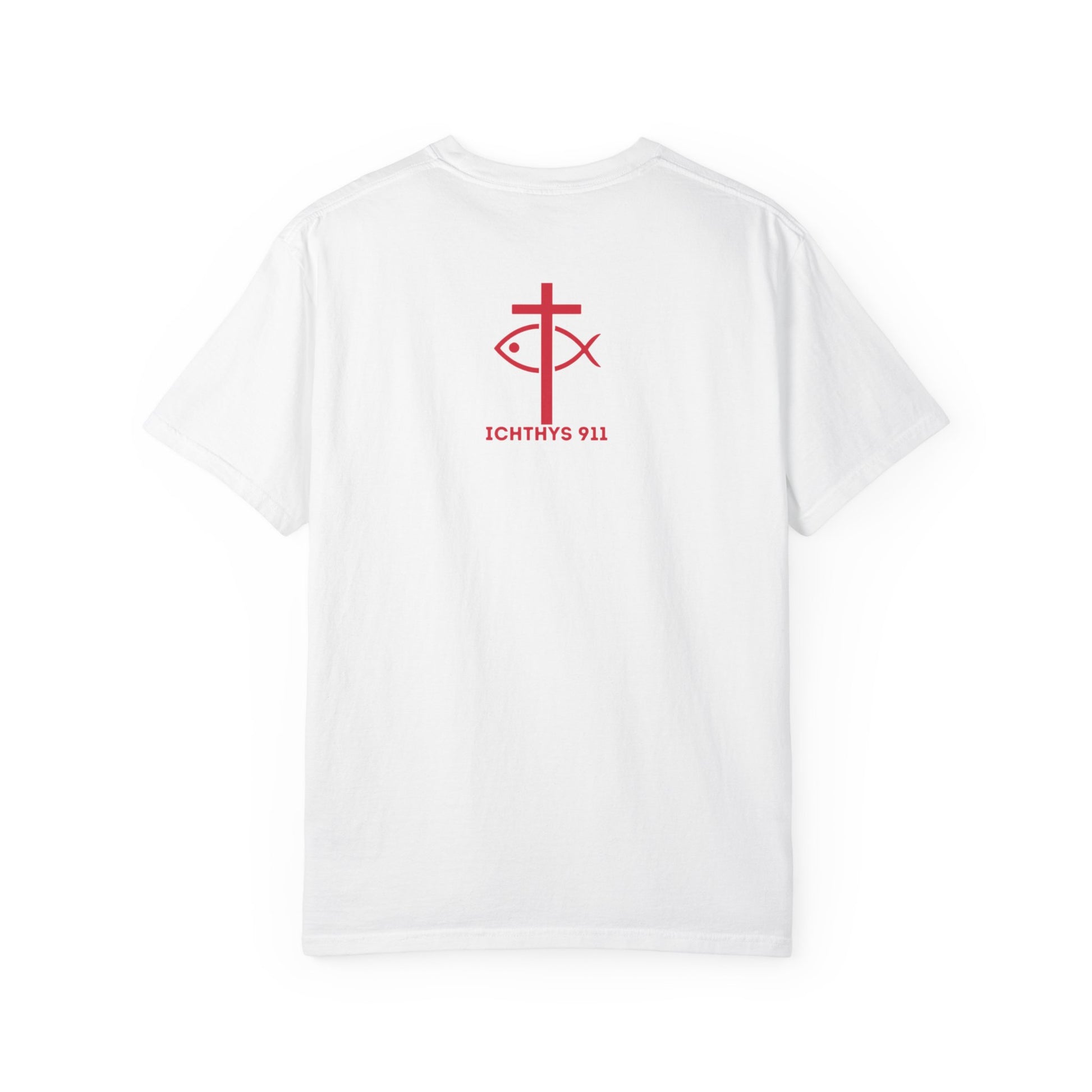 ICHTHYS 911 - "God Sees the Heart" Reverse Design - White Font - Unisex Garment - Dyed T-Shirt - 100% US Cotton - Men T-Shirt - Women T-Shirt - Inspirational Graphic T-Shirt for Everyday Motivation