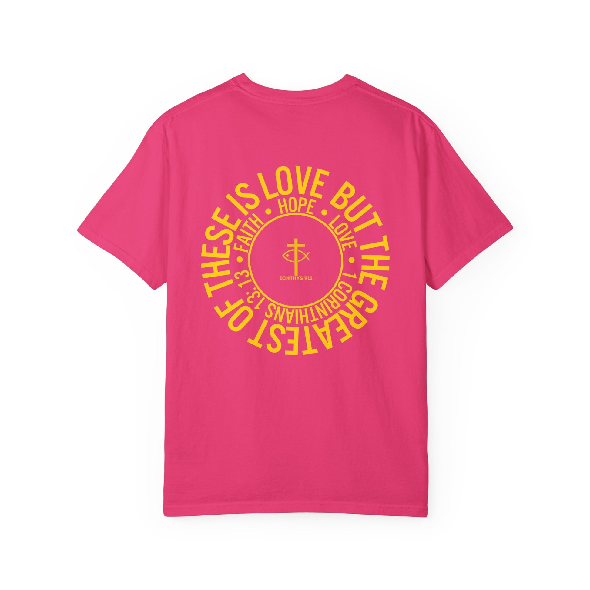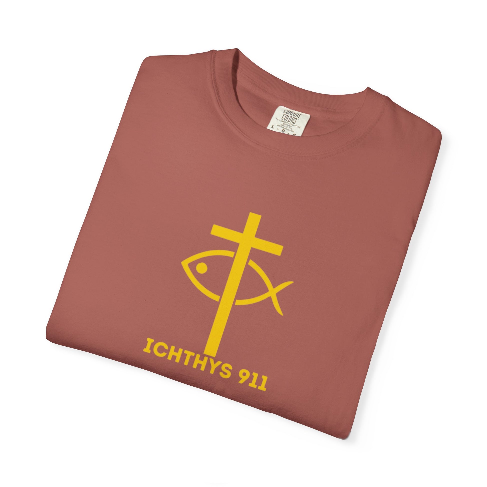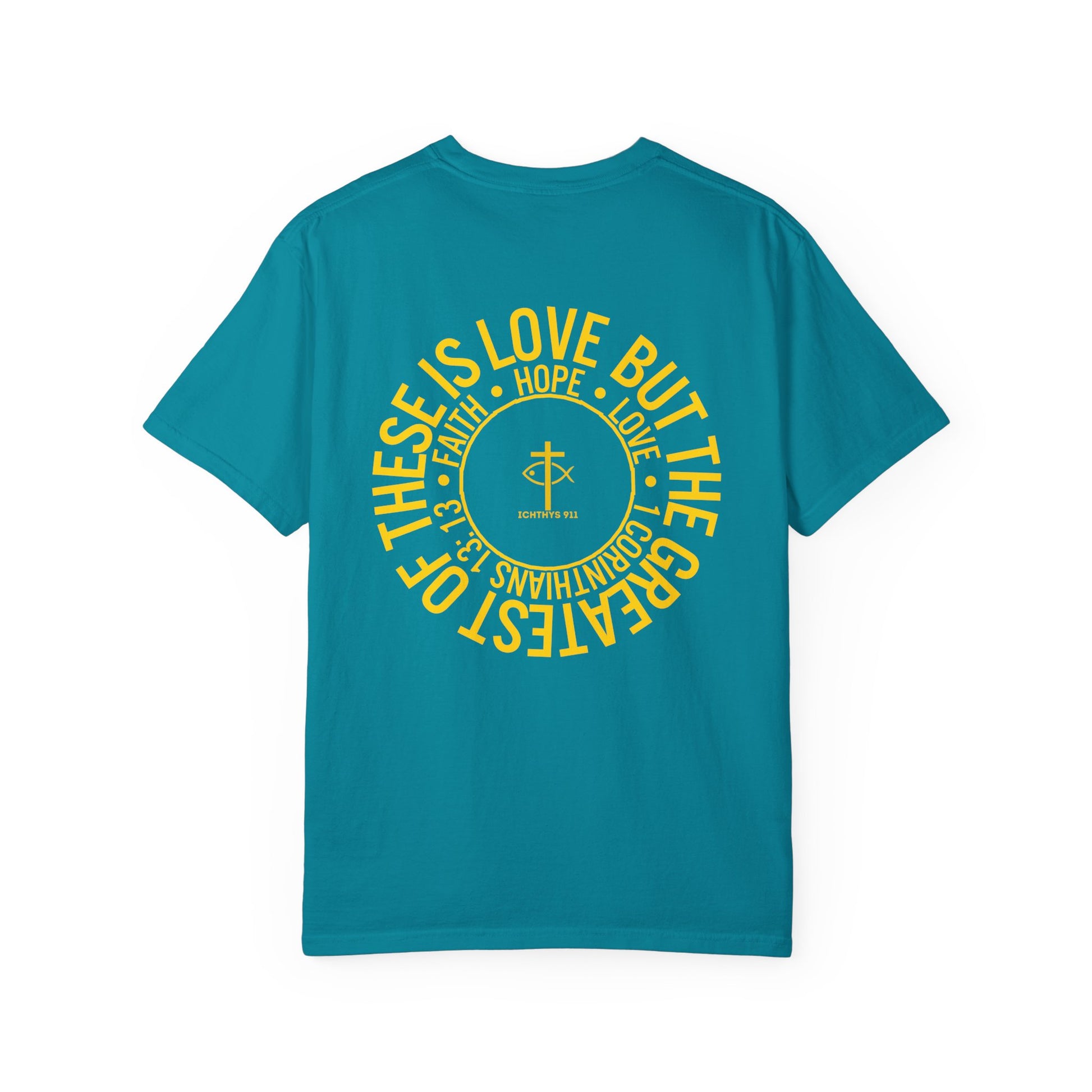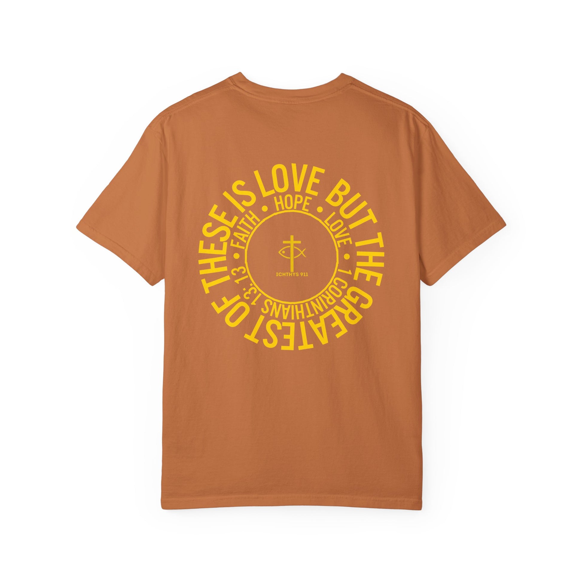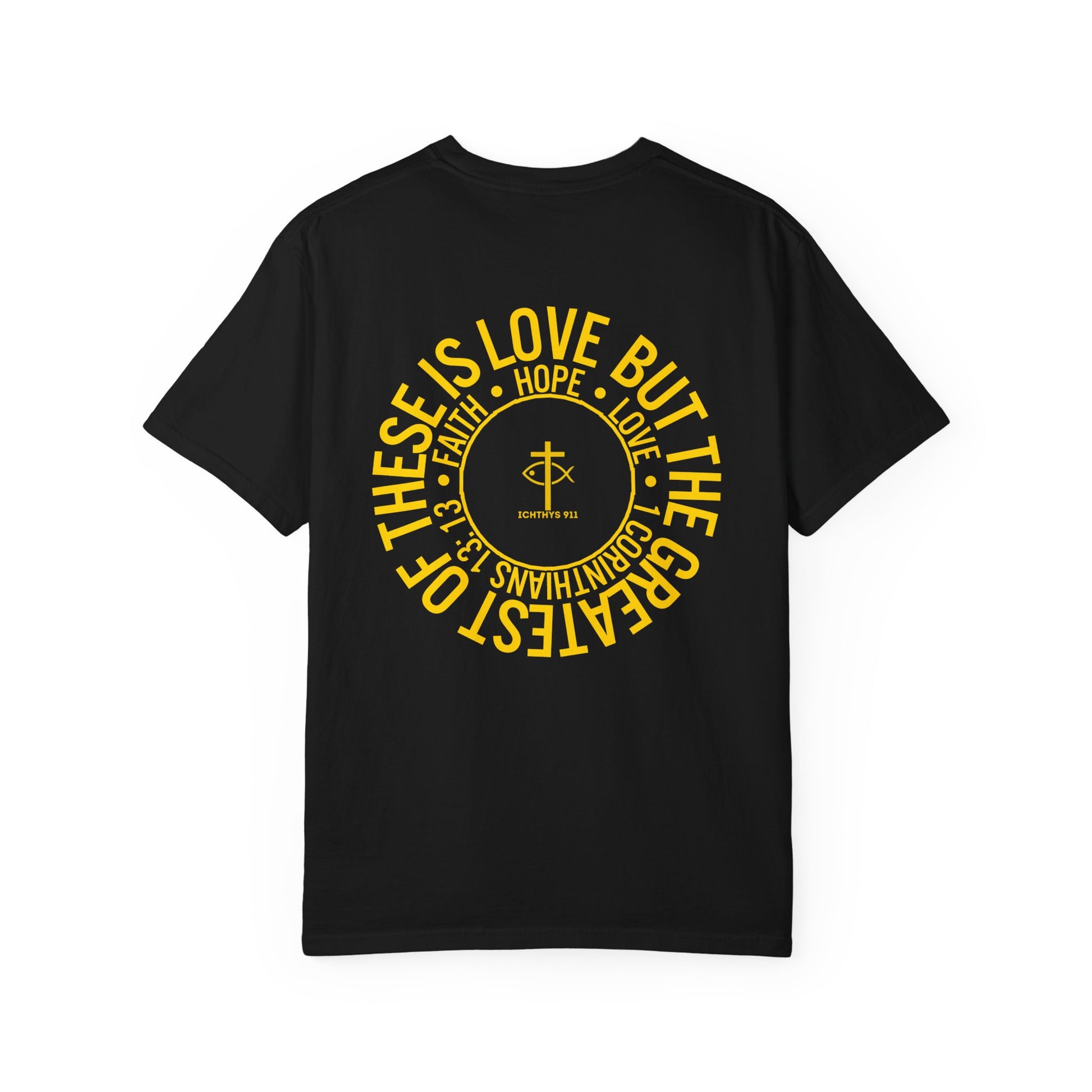ICHTHYS 911 Gold Font "Faith, Hope, & Love" - Unisex Garment Dyed T-Shirt - 100# US Cotton - Men T-Shirt - Women T-Shirt - Christian T- Shirt -Faith-Inspired Shirt - Christian Fashion - Wear Your Faith