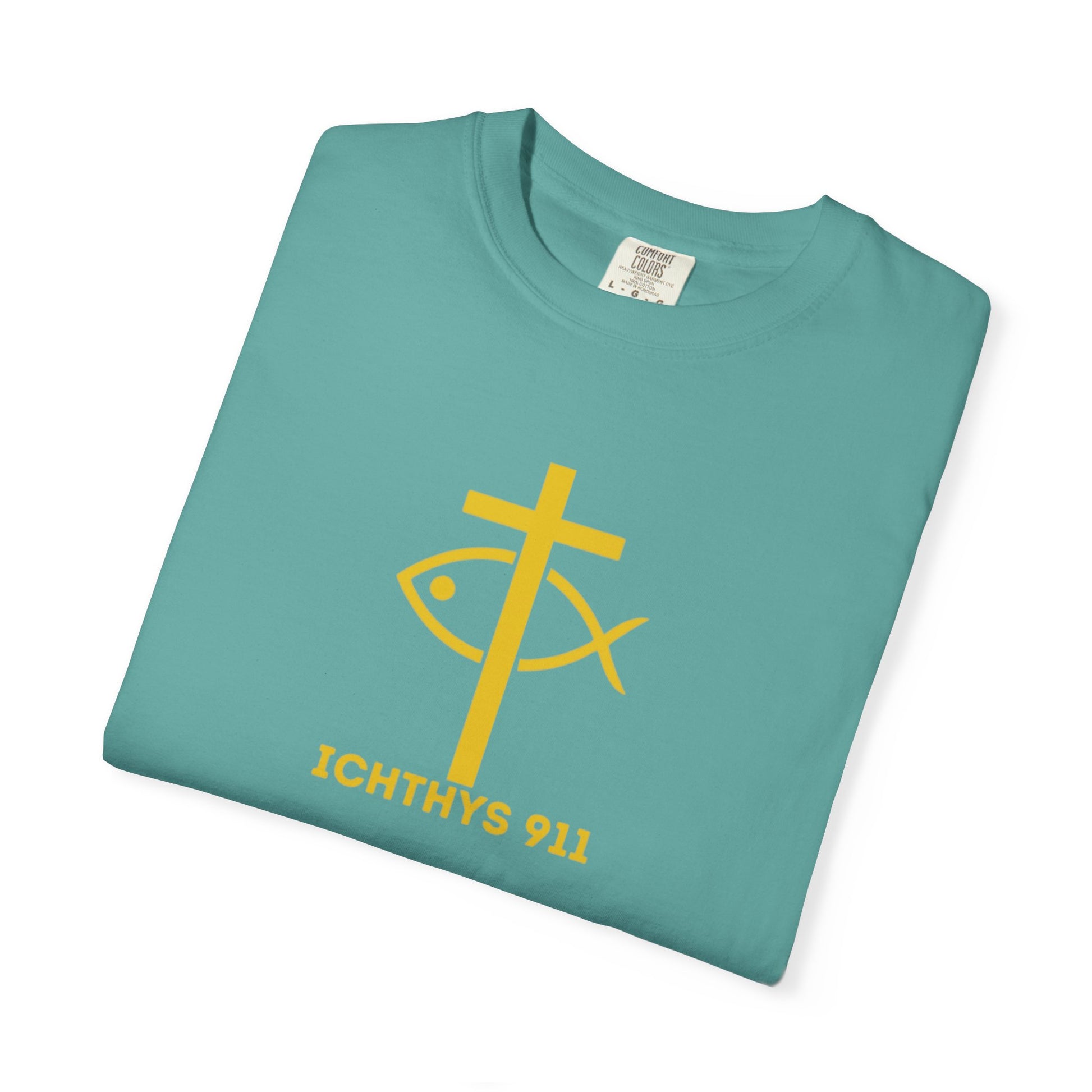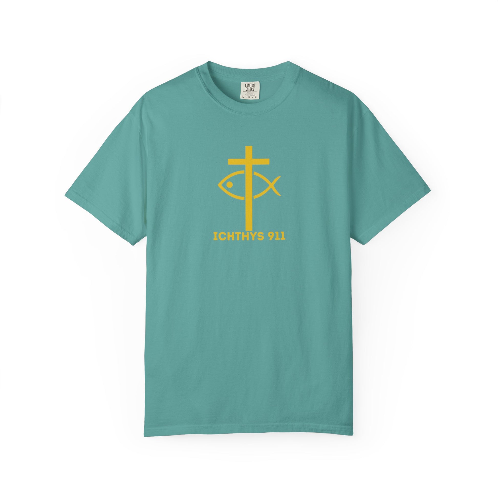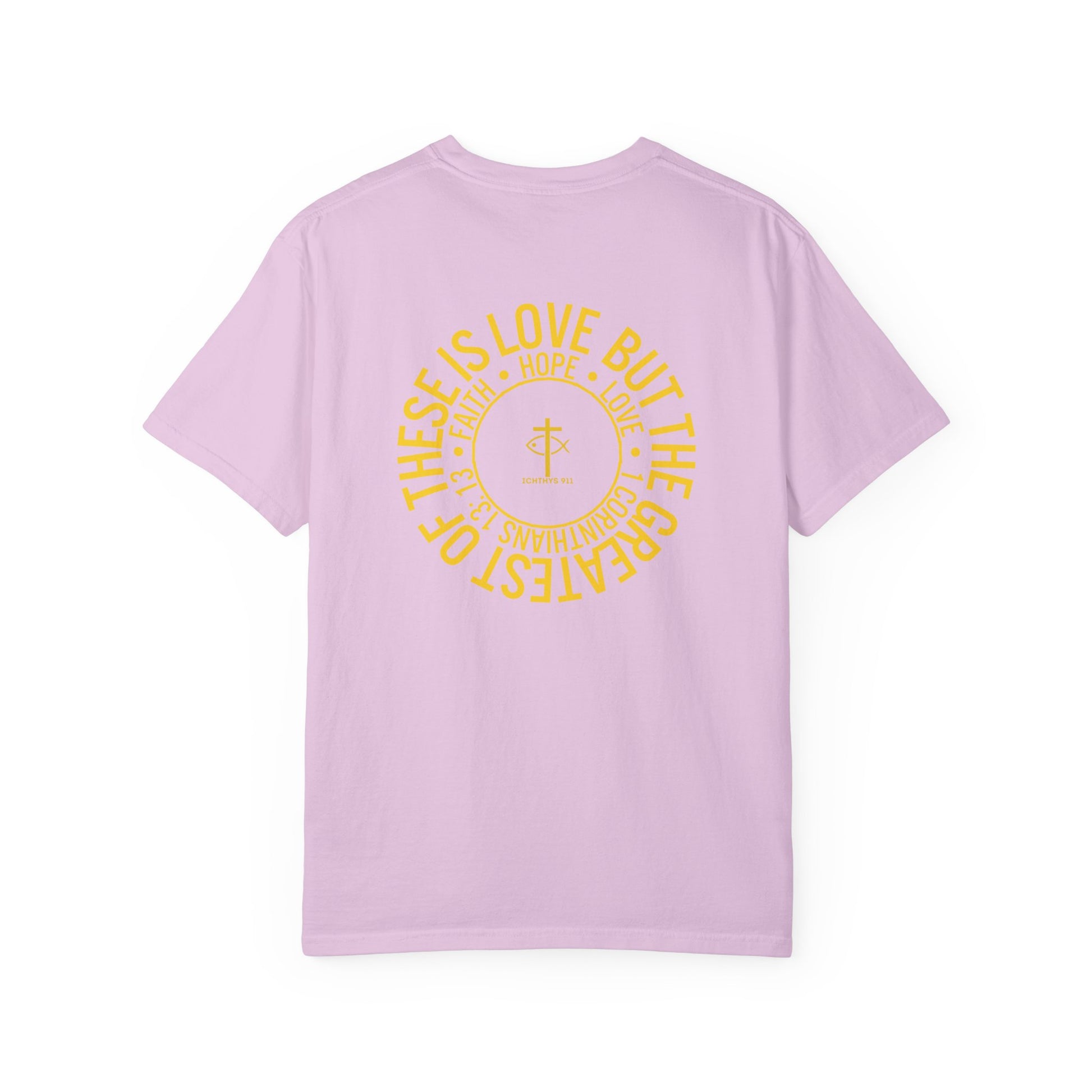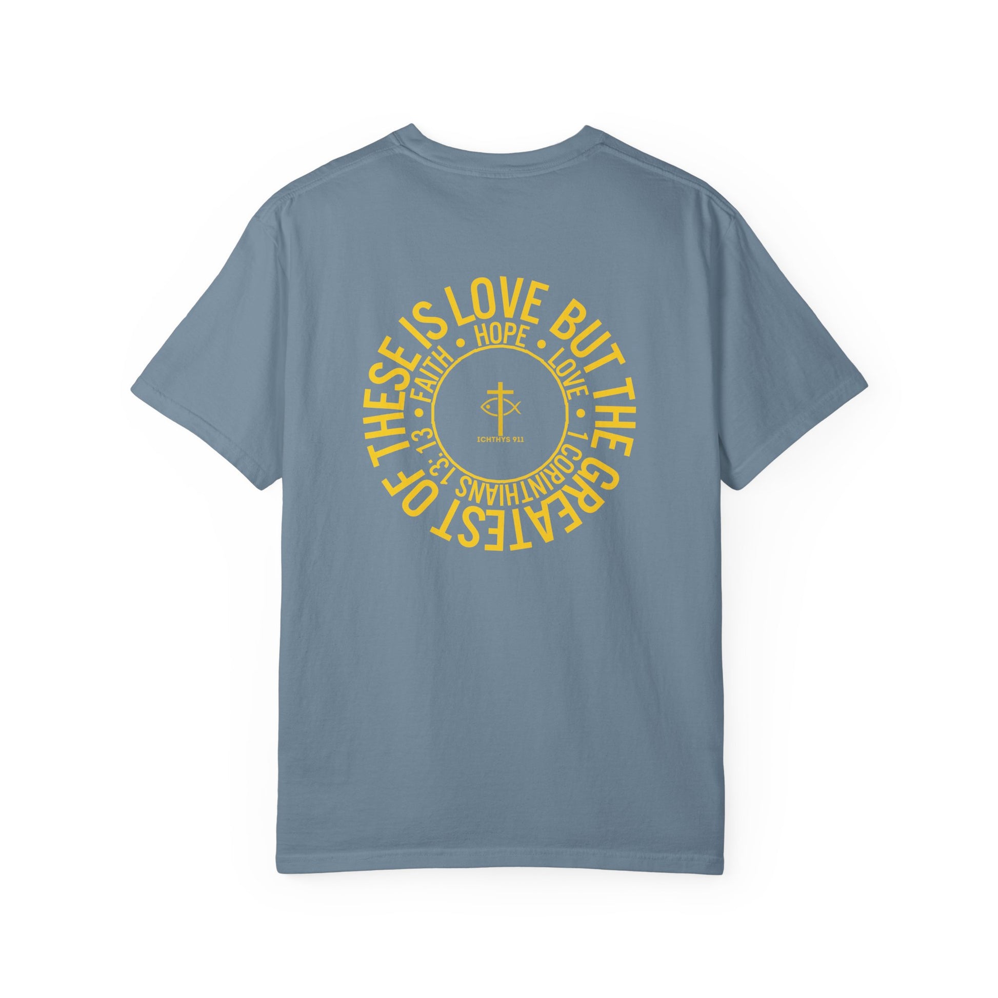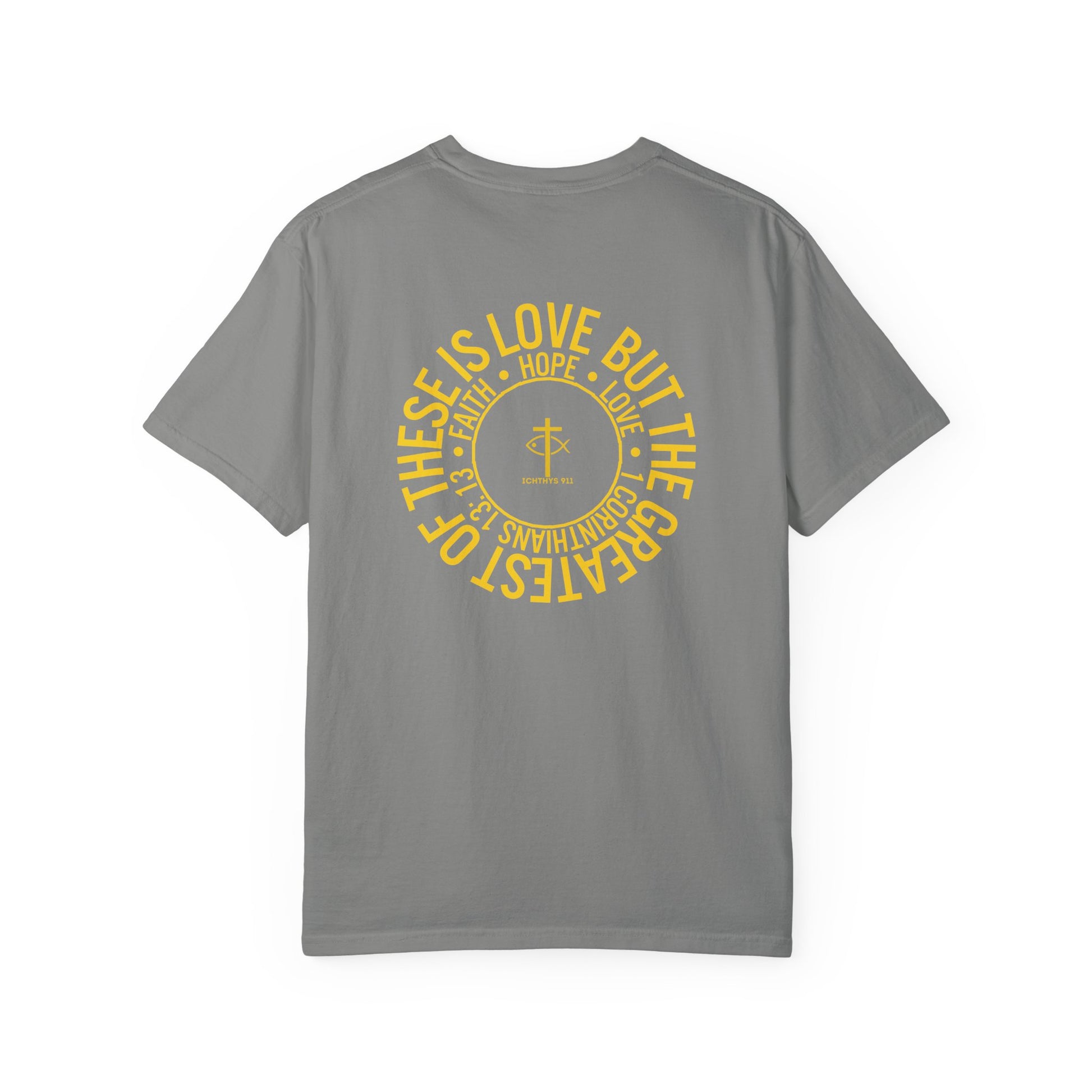 "Faith, Hope, & Love" - Gold Font - Unisex Garment Dyed T-Shirt - 100# US Cotton - Men T-Shirt - Women T-Shirt - Christian T- Shirt -Faith-Inspired Shirt - Christian Fashion - Wear Your Faith - ICHTHYS 911