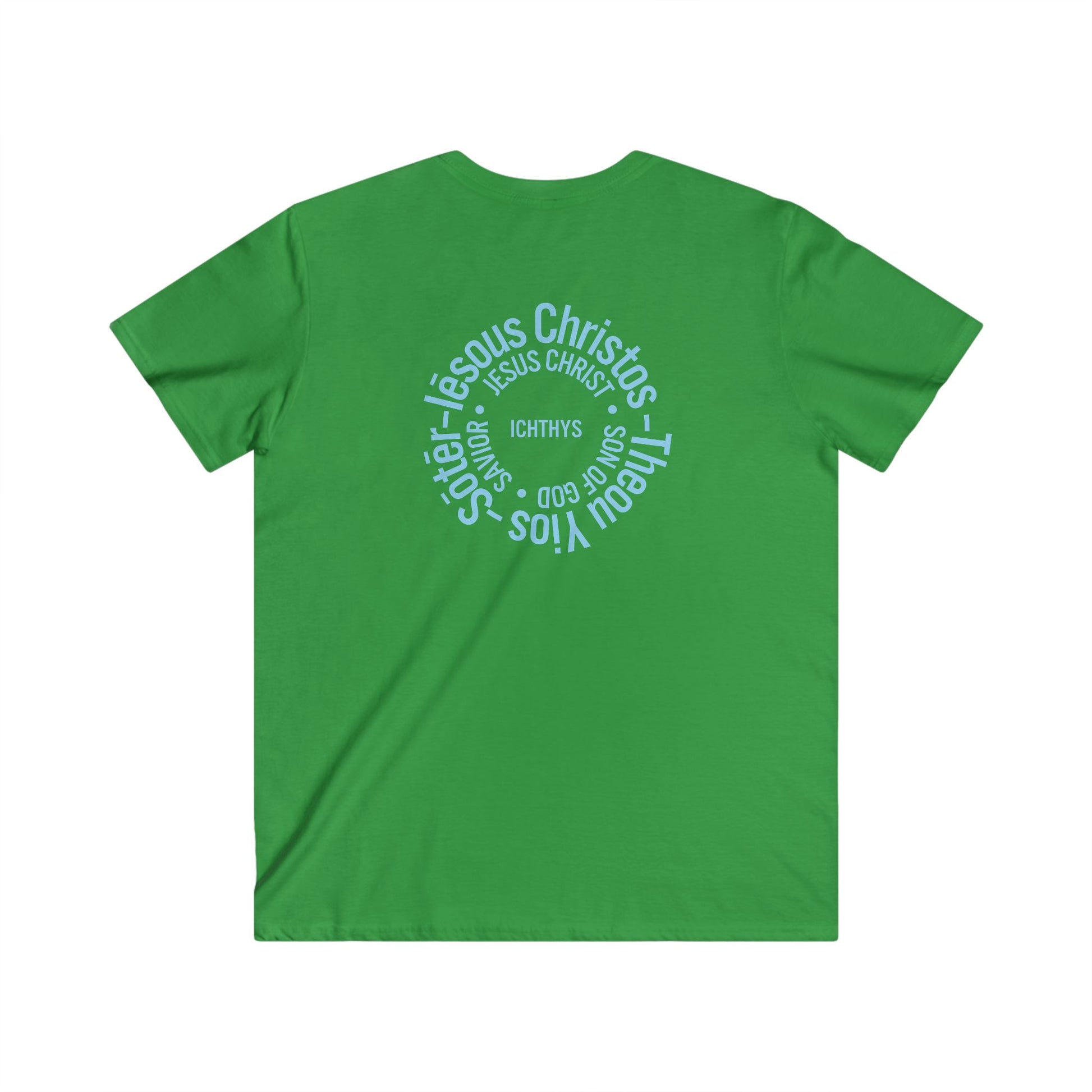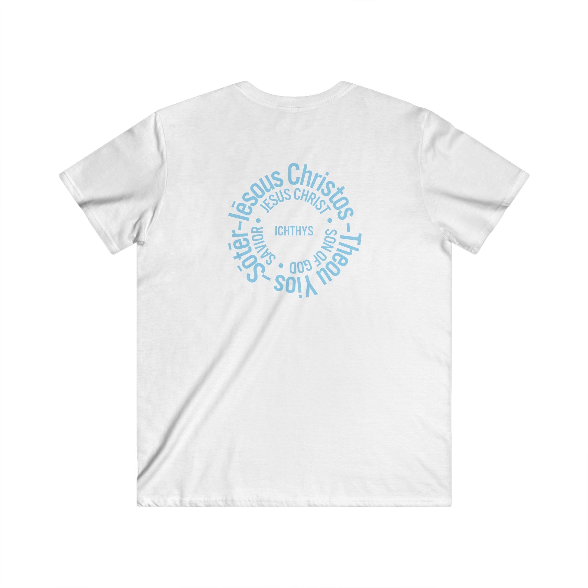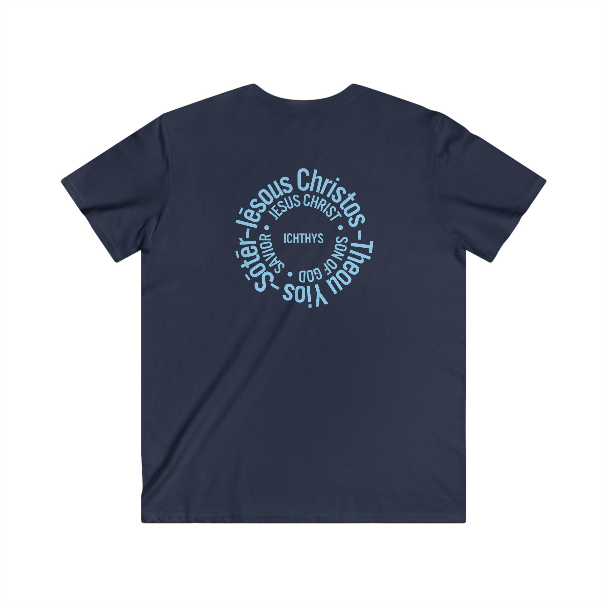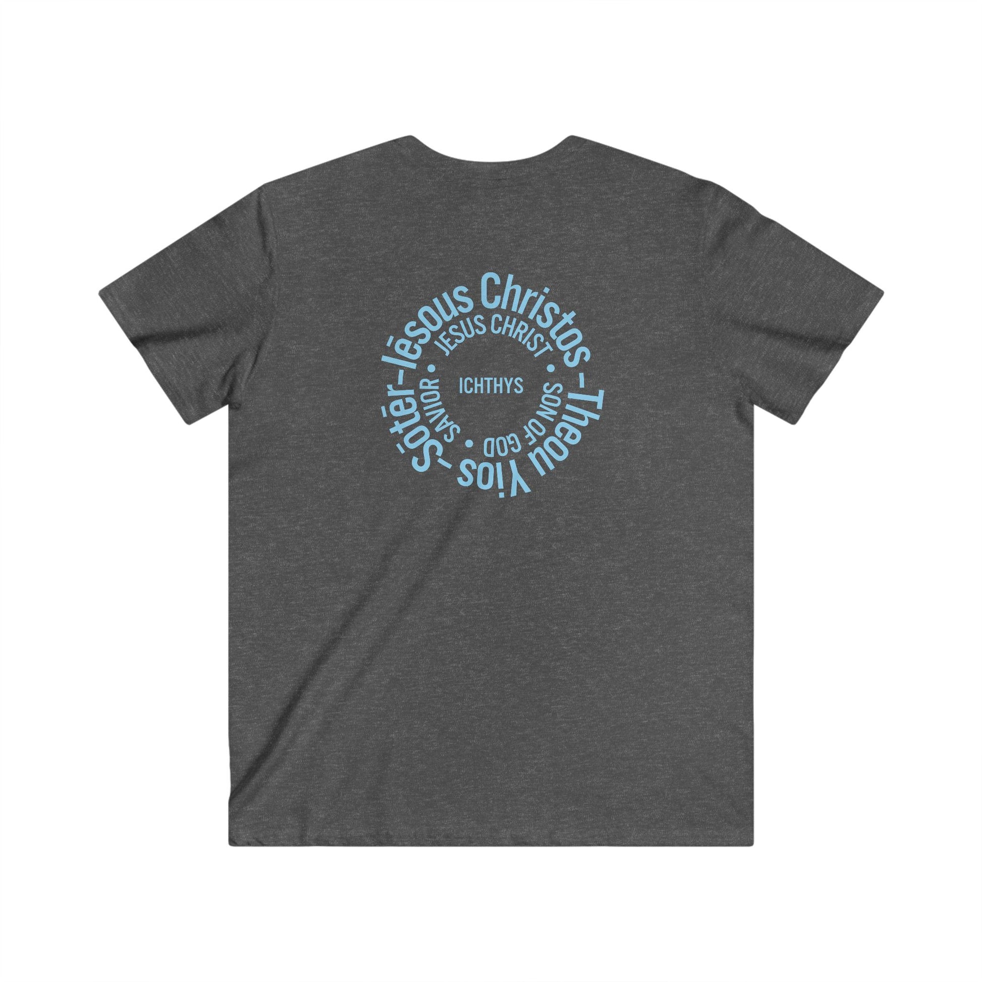 Iēsous Christos, Theou Yios, Sōtēr - Blue Font - Men's Fitted V-Neck Tee with Inspirational Design - Perfect for Faith and Casual Wear, ICHTHYS 911, Faith T-Shirt