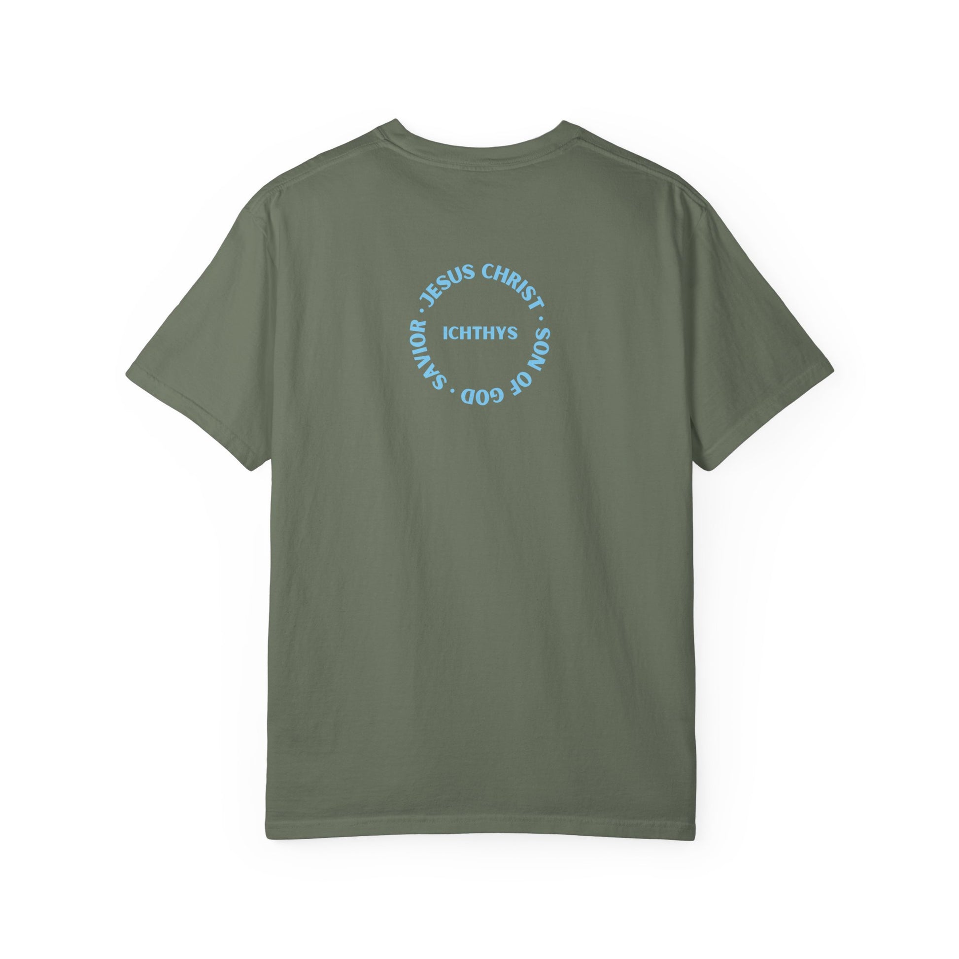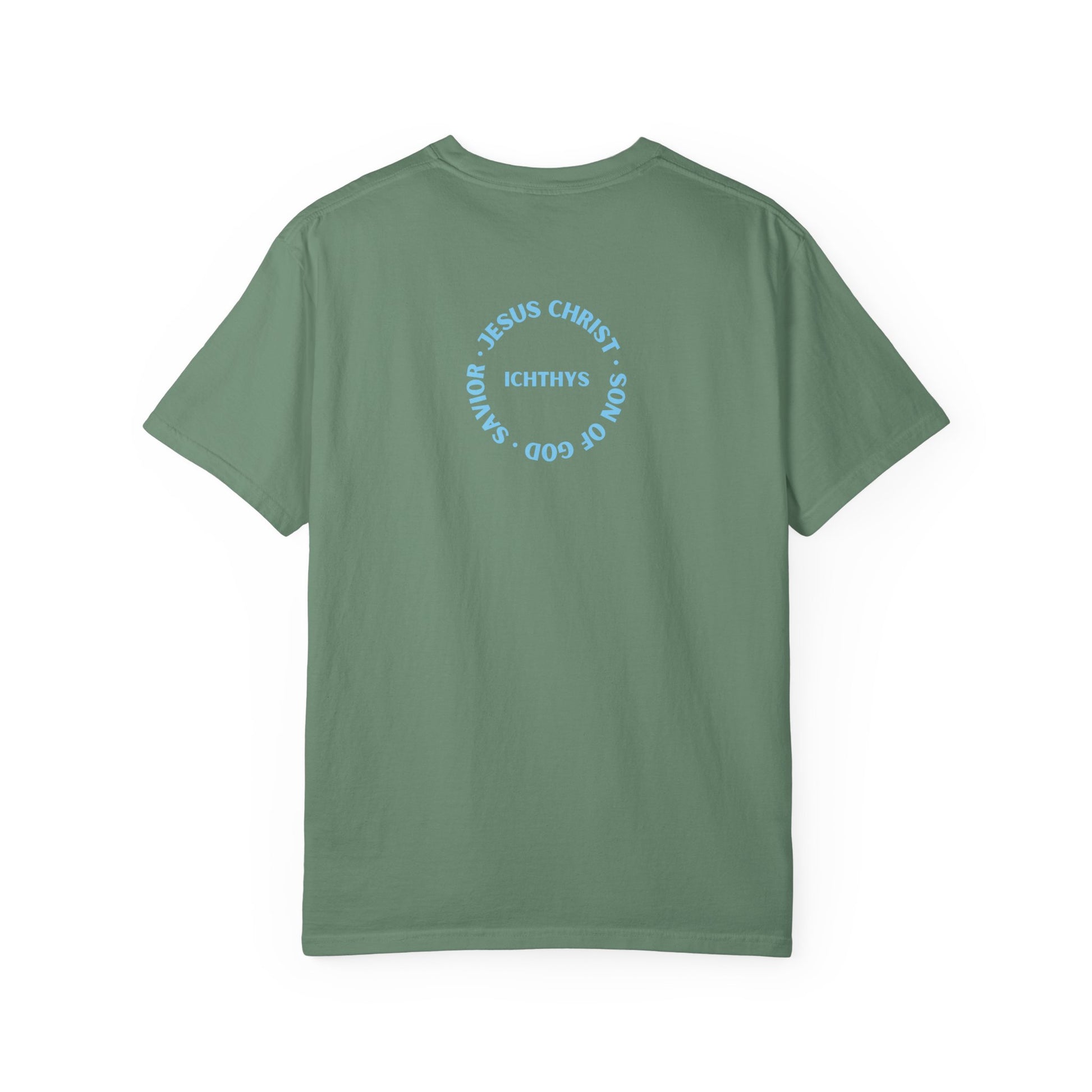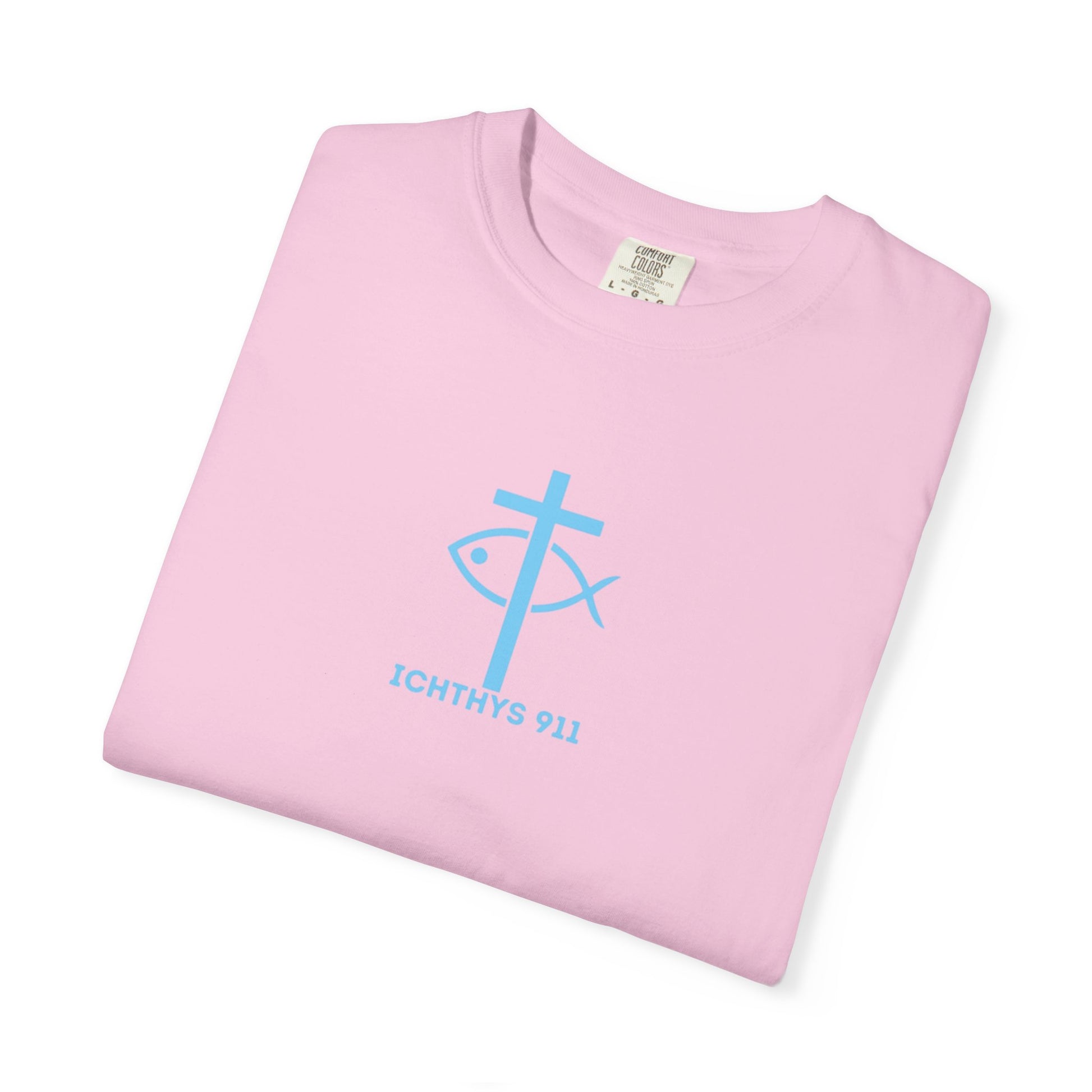 ICHTHYS 911 - "Jesus Christ Son of God Savior" Blue Font - Christian Streetwear T-Shirt – Jesus Gym & Faith Fashion, Unisex Garment-Dyed T-Shirt Blue Font
