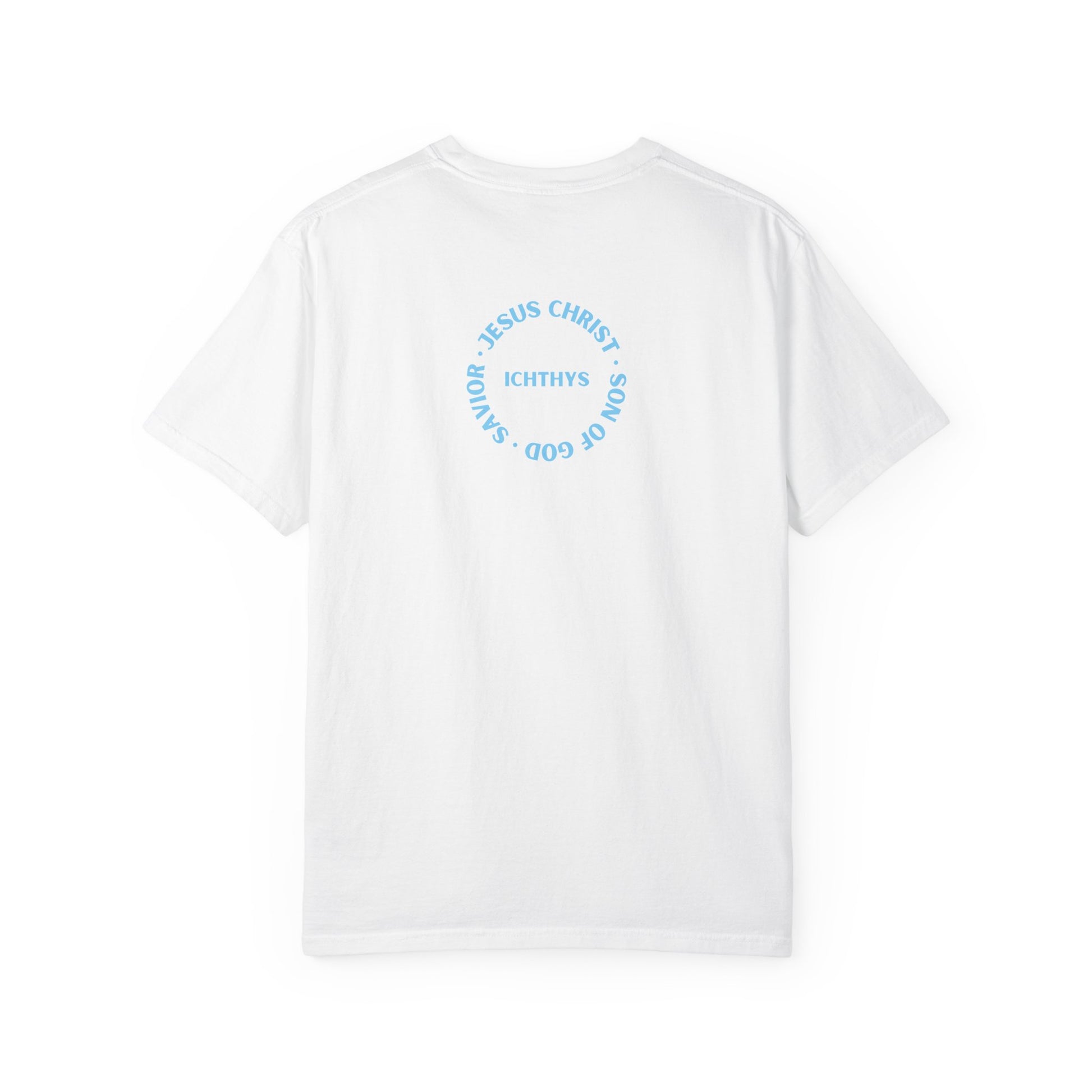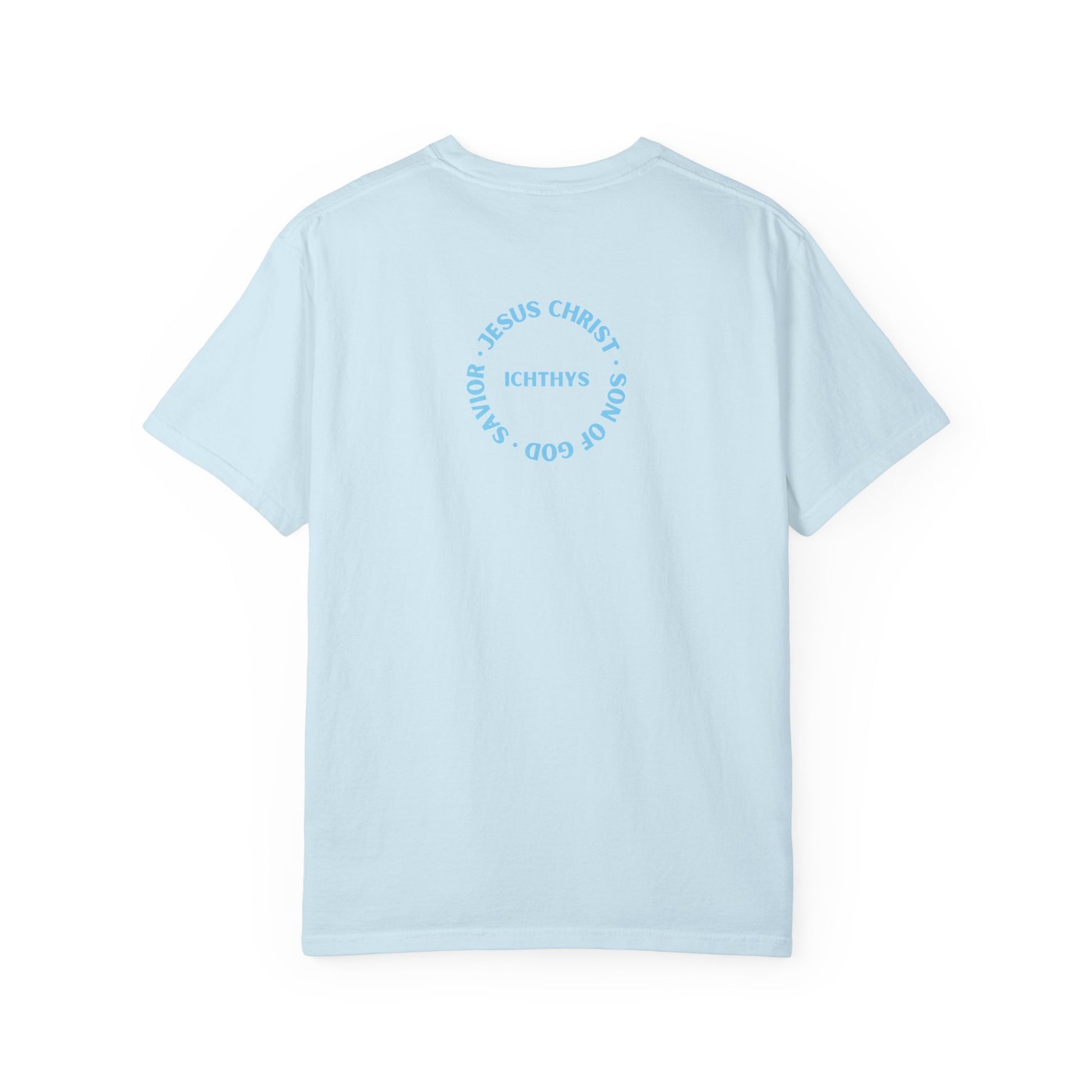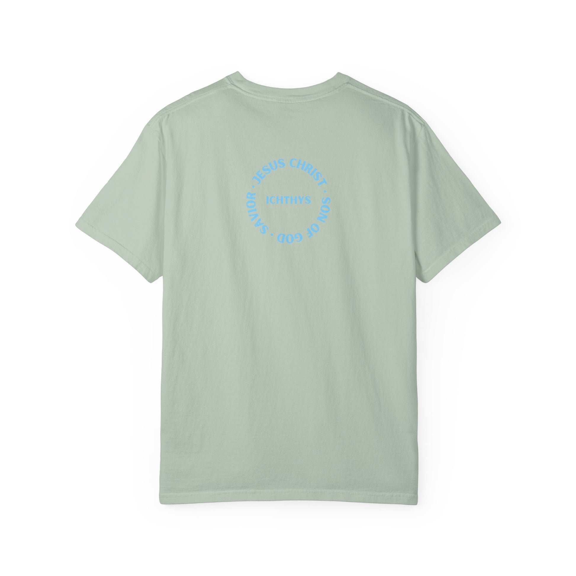 ICHTHYS 911 - "Jesus Christ Son of God Savior" Blue Font - Christian Streetwear T-Shirt – Jesus Gym & Faith Fashion, Unisex Garment-Dyed T-Shirt Blue Font