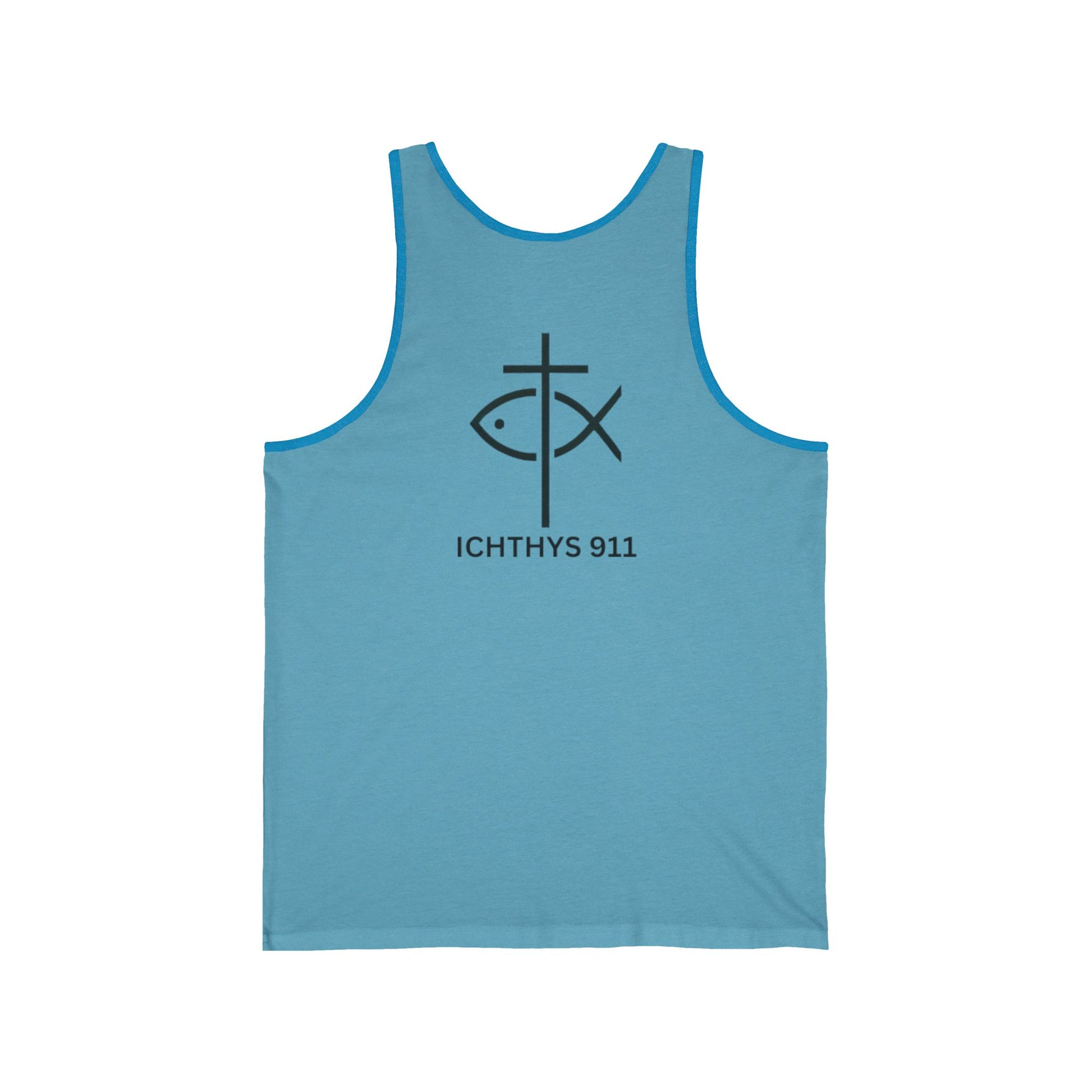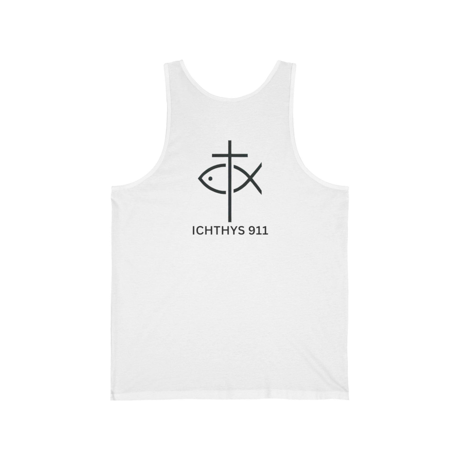 ICHTHYS 911 - Jersey Tank Badge Logo - Casual Christian Symbol Graphic Tee - Unisex