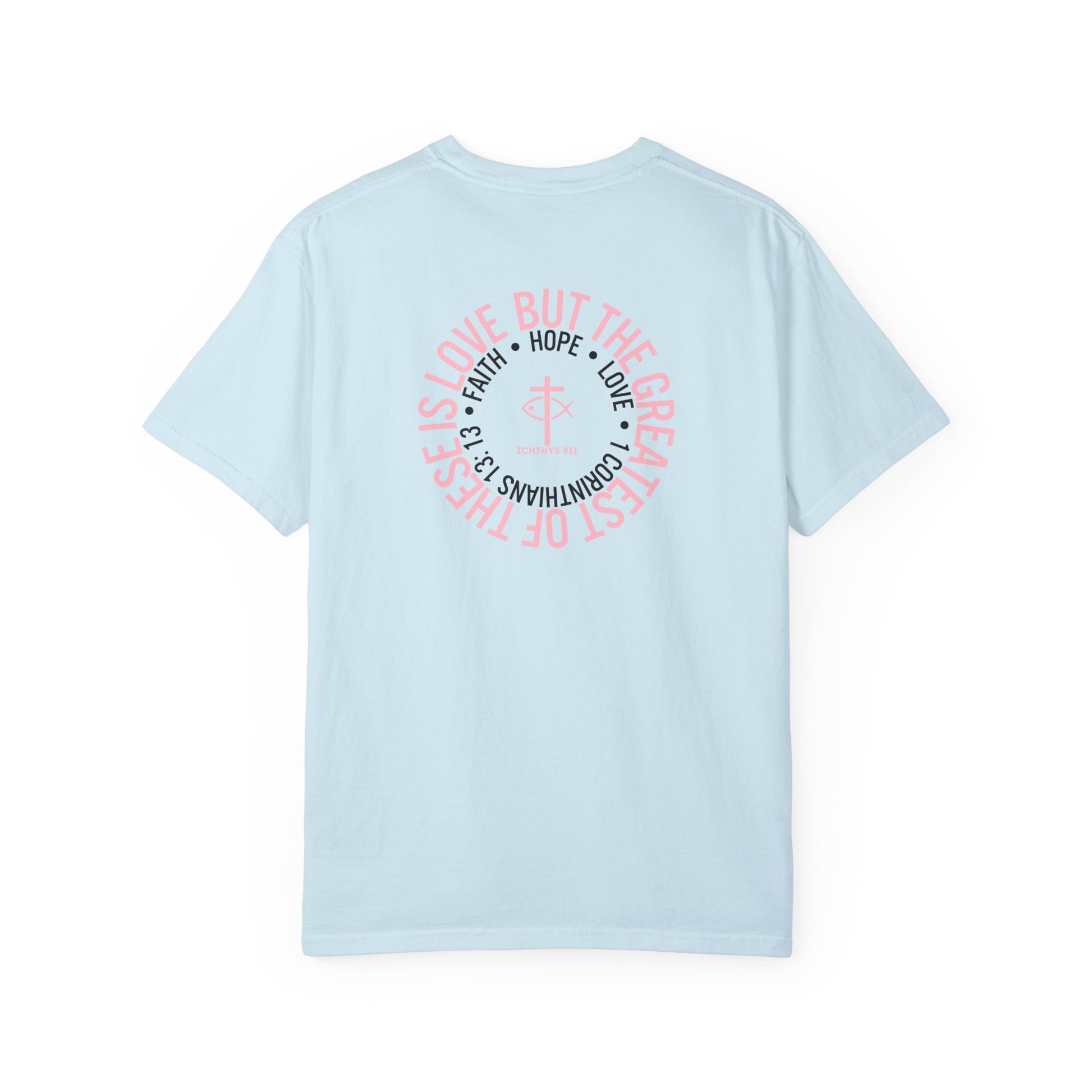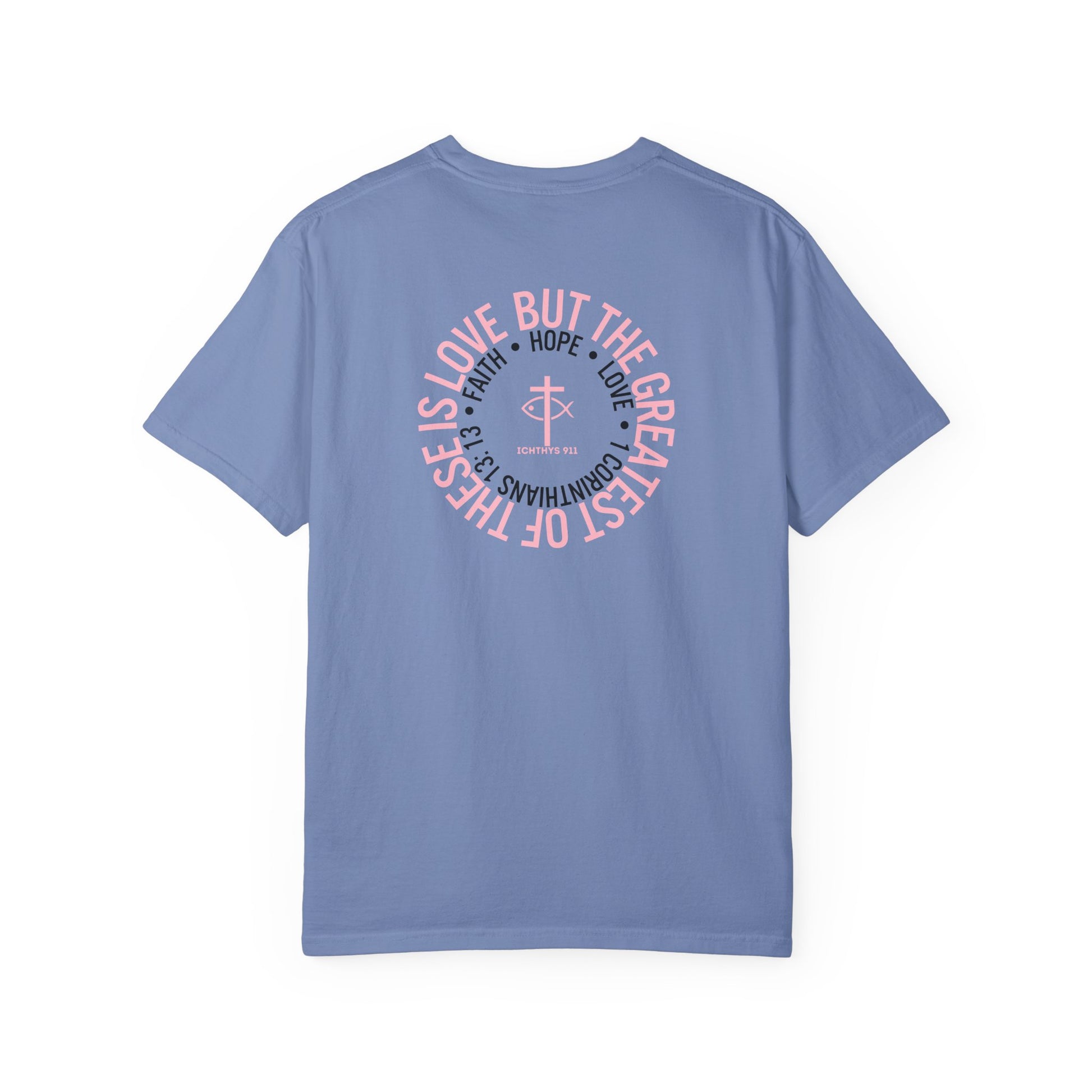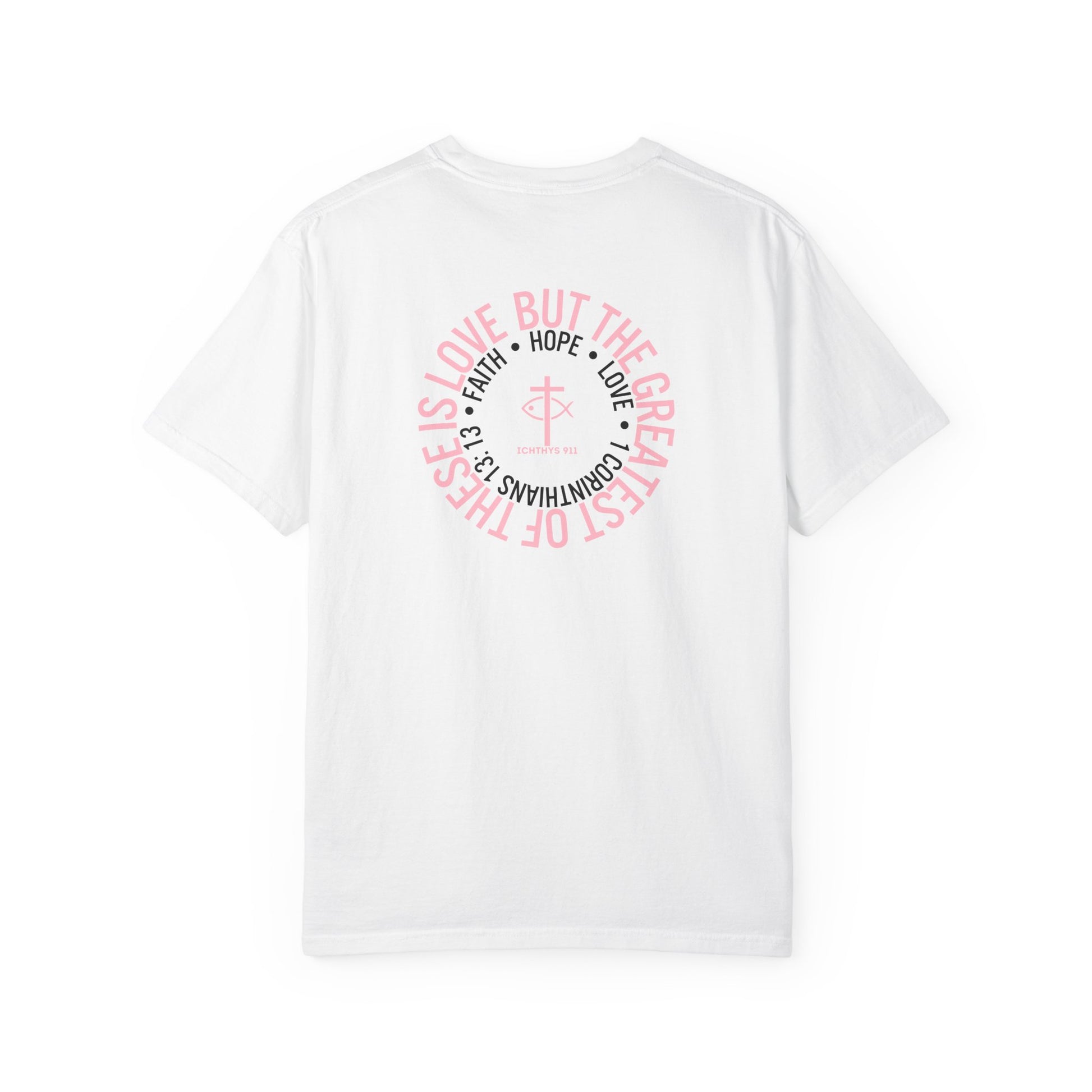 ICHTHYS 911 Pink Font "Faith, Hope, & Love" - Unisex Garment Dyed T-Shirt - 100% US Cotton - Men T-Shirt - Christian Women Tee - Faith-Inspired Shirt - Christian Fashion - Wear Your Faith - Additional Colors Added