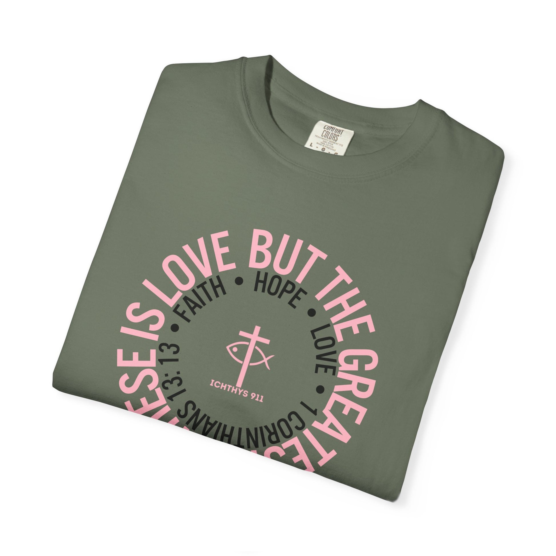 "Faith, Hope, & Love Reverse" - Pink Font - Unisex Garment Dyed T-Shirt - 100% US Cotton - Men T-Shirt - Christian Women Tee - Faith-Inspired Shirt - Christian Fashion - Wear Your Faith -ICHTHYS 911