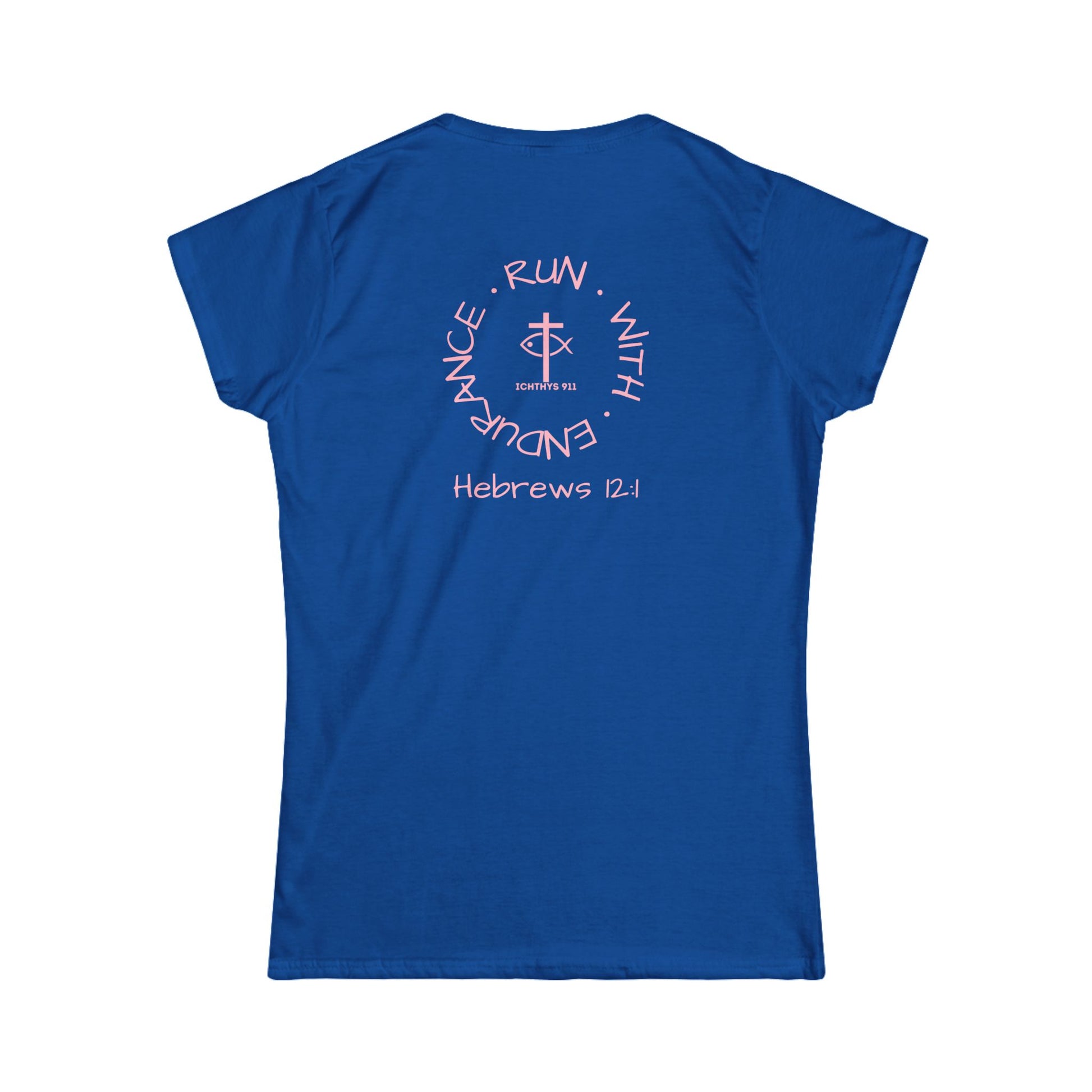 ICHTHYS 911 Pink Font "Run With Endurance" - Inspirational Faith Tee for Women - Wear Your Faith - Hebrews 12:1 - Semi-Fitted
