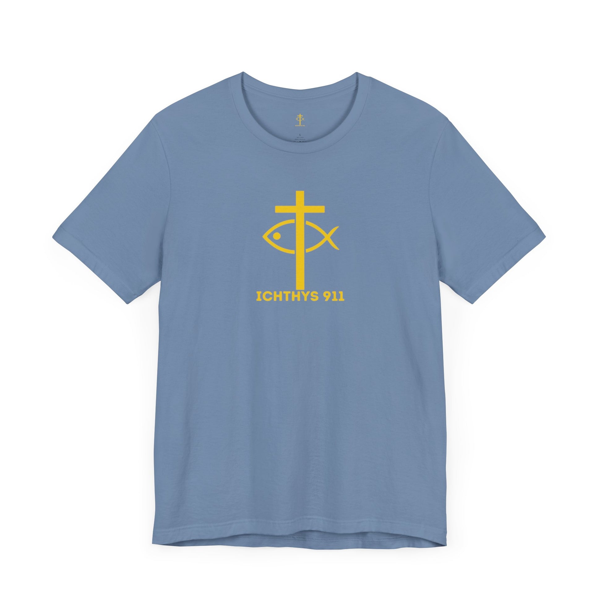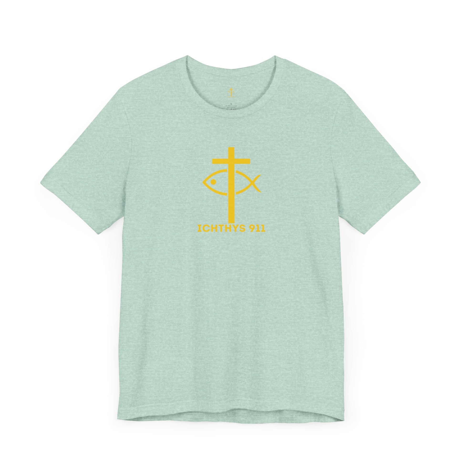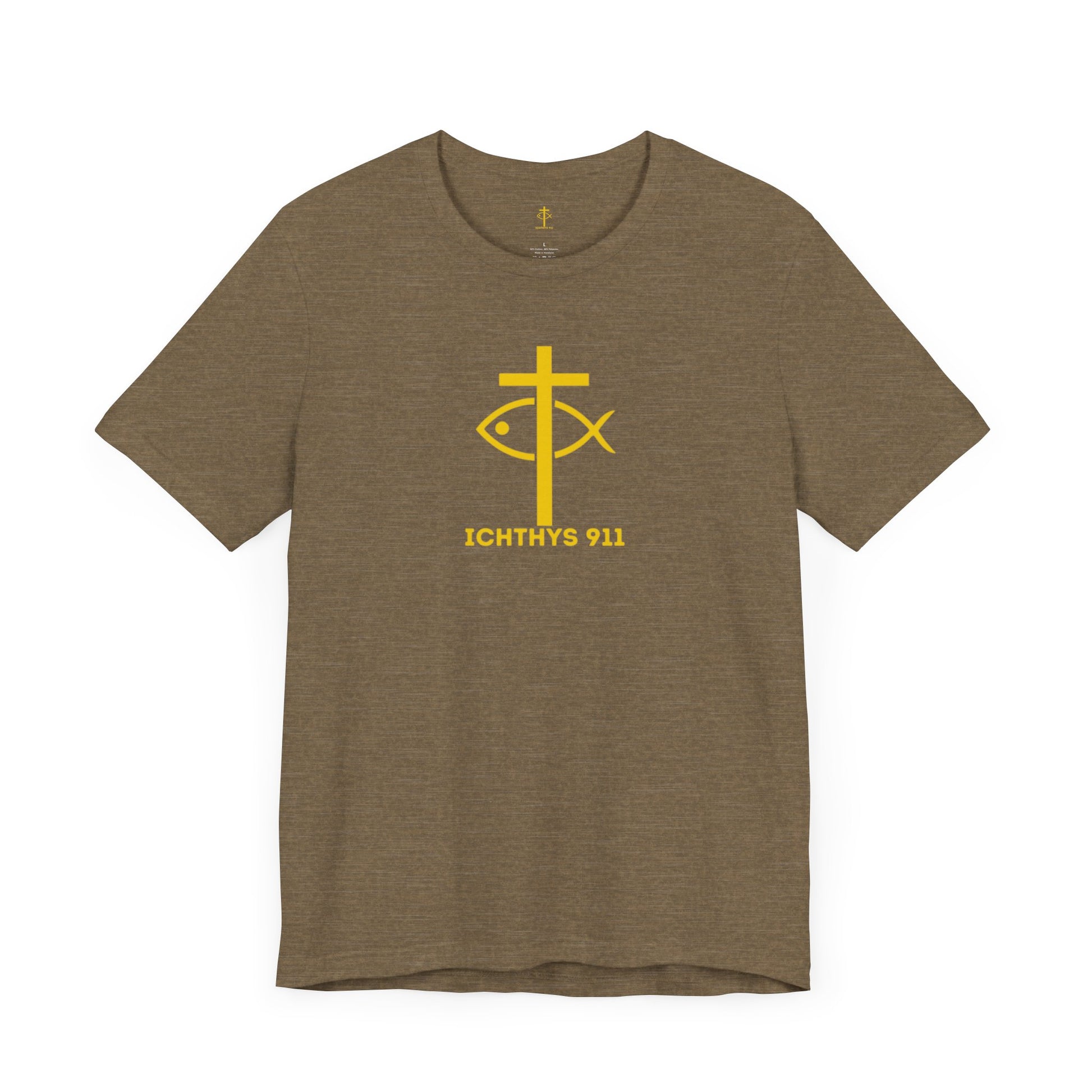 This ICHTHYS 911 Unisex T-Shirt is a faith-inspired Christian apparel that offers a unique and meaningful design. It provides a sense of inspiration and faith, making it a perfect addition to any believer's wardrobe. This tee is relevant for religious holidays, church events, and everyday wear for those looking to express their faith.