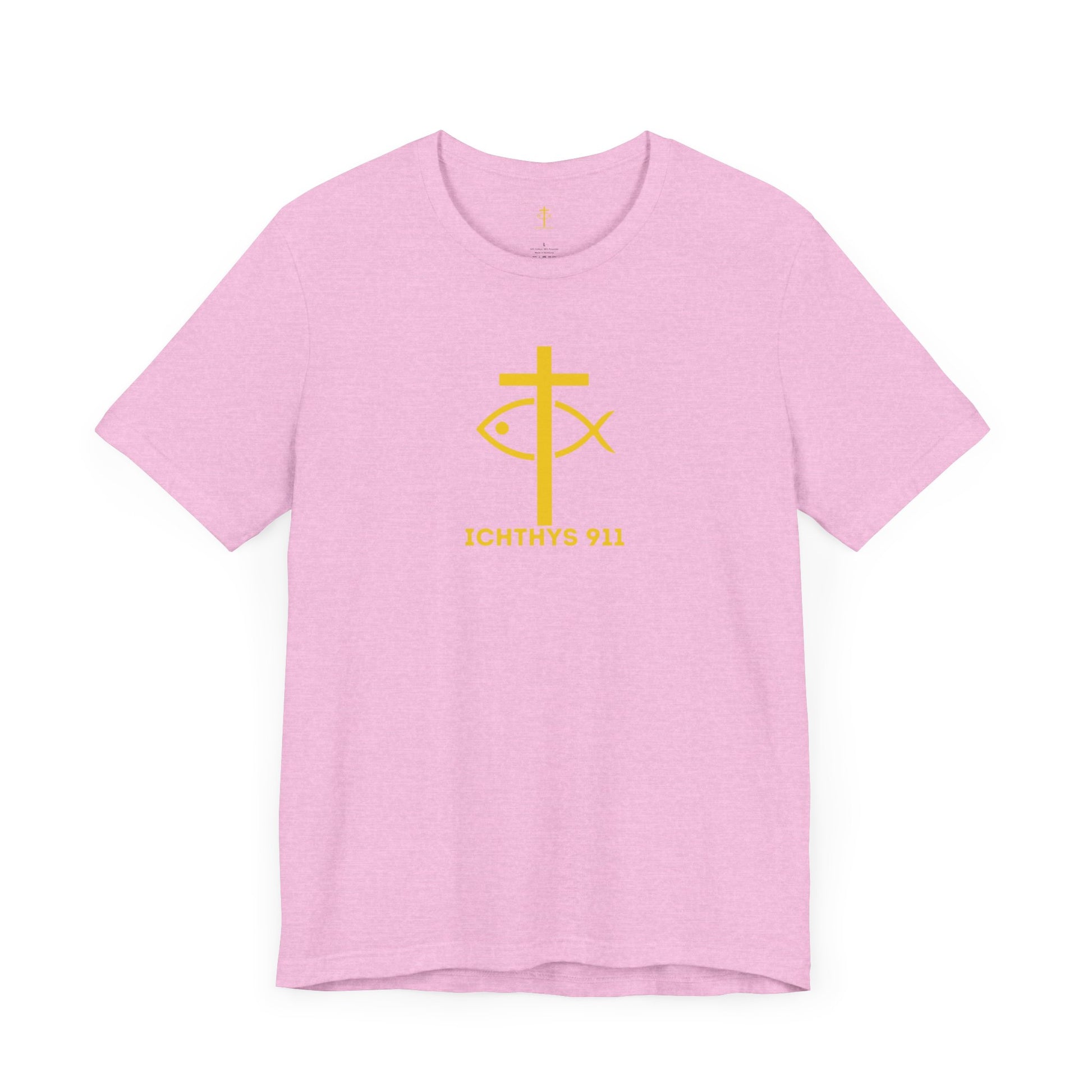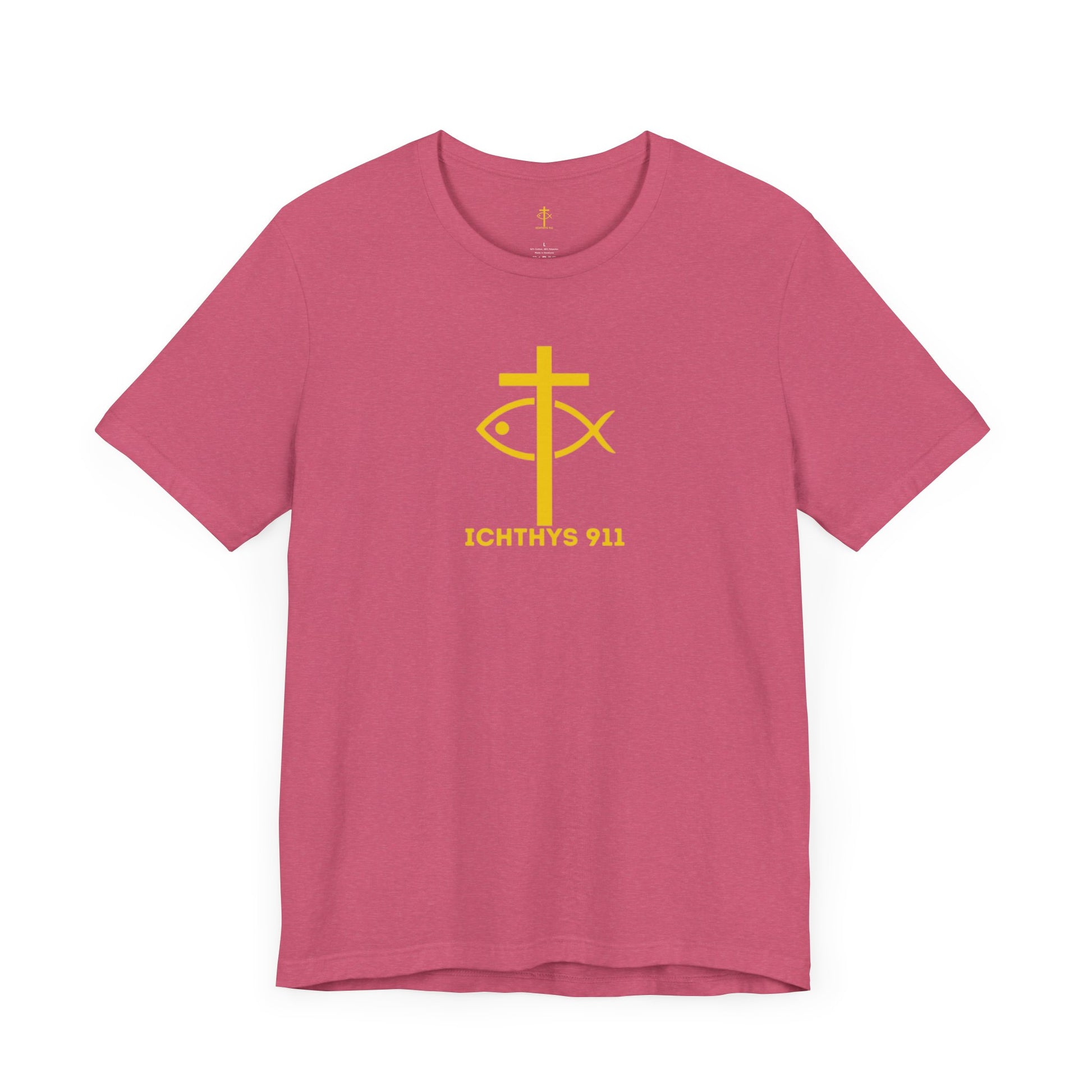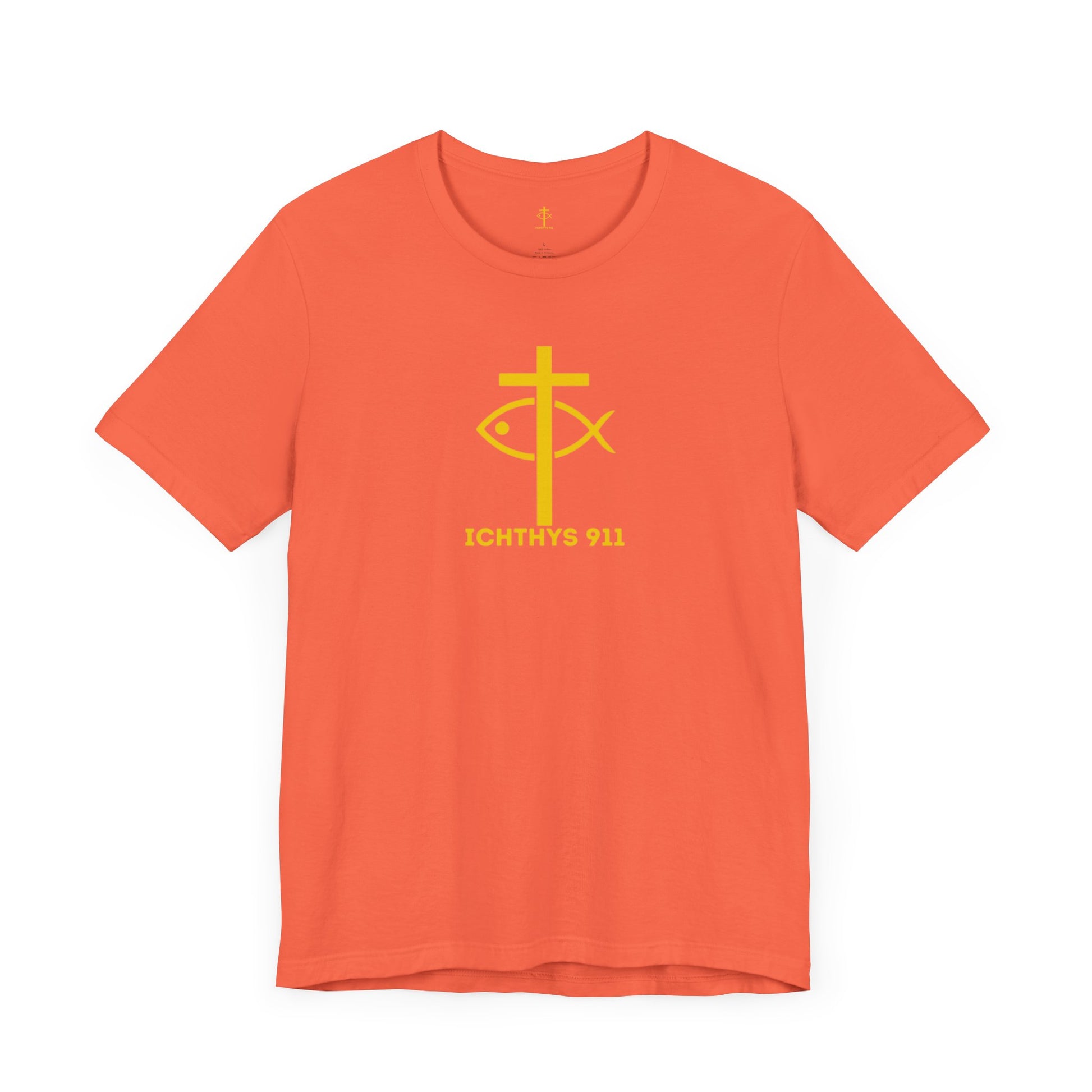 This ICHTHYS 911 Unisex T-Shirt is a faith-inspired Christian apparel that offers a unique and meaningful design. It provides a sense of inspiration and faith, making it a perfect addition to any believer's wardrobe. This tee is relevant for religious holidays, church events, and everyday wear for those looking to express their faith.