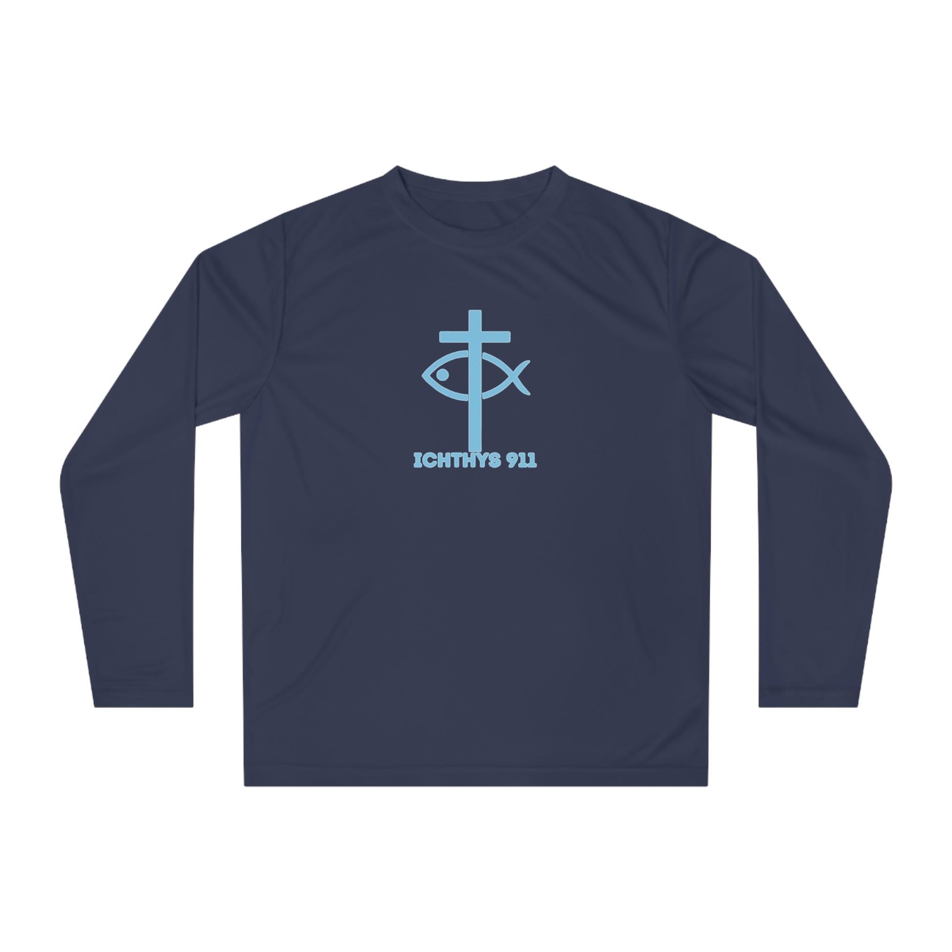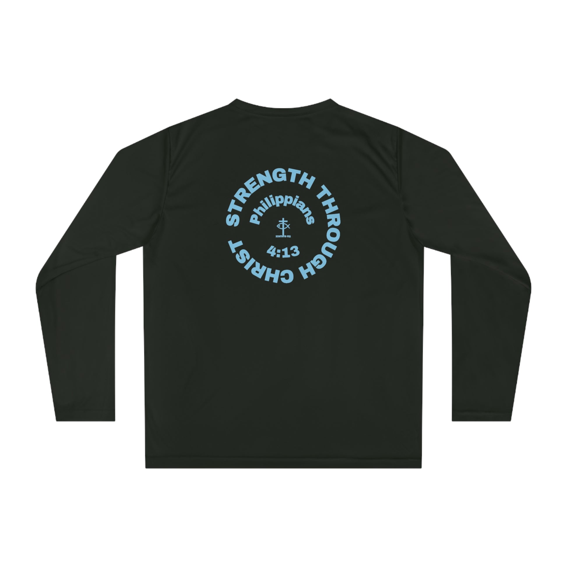 ICHTHYS 911 "Strength Through Christ Philippians 4:13" - Blue Font - Unisex Performance Long Sleeve Shirt - Men - Women - 100% Moisture-Wicking Poly - Christian Activewear