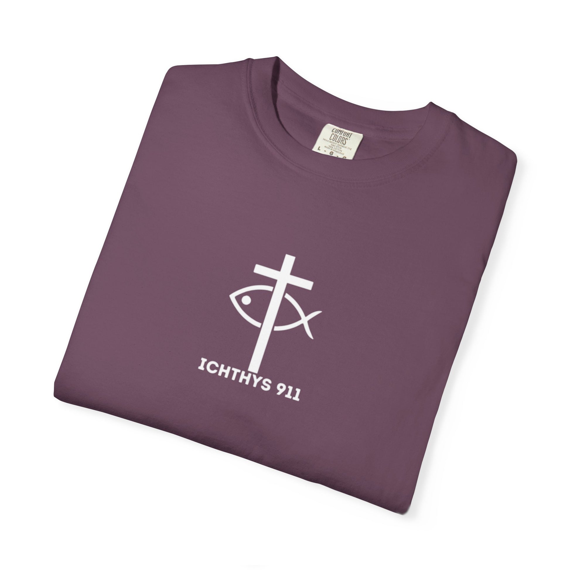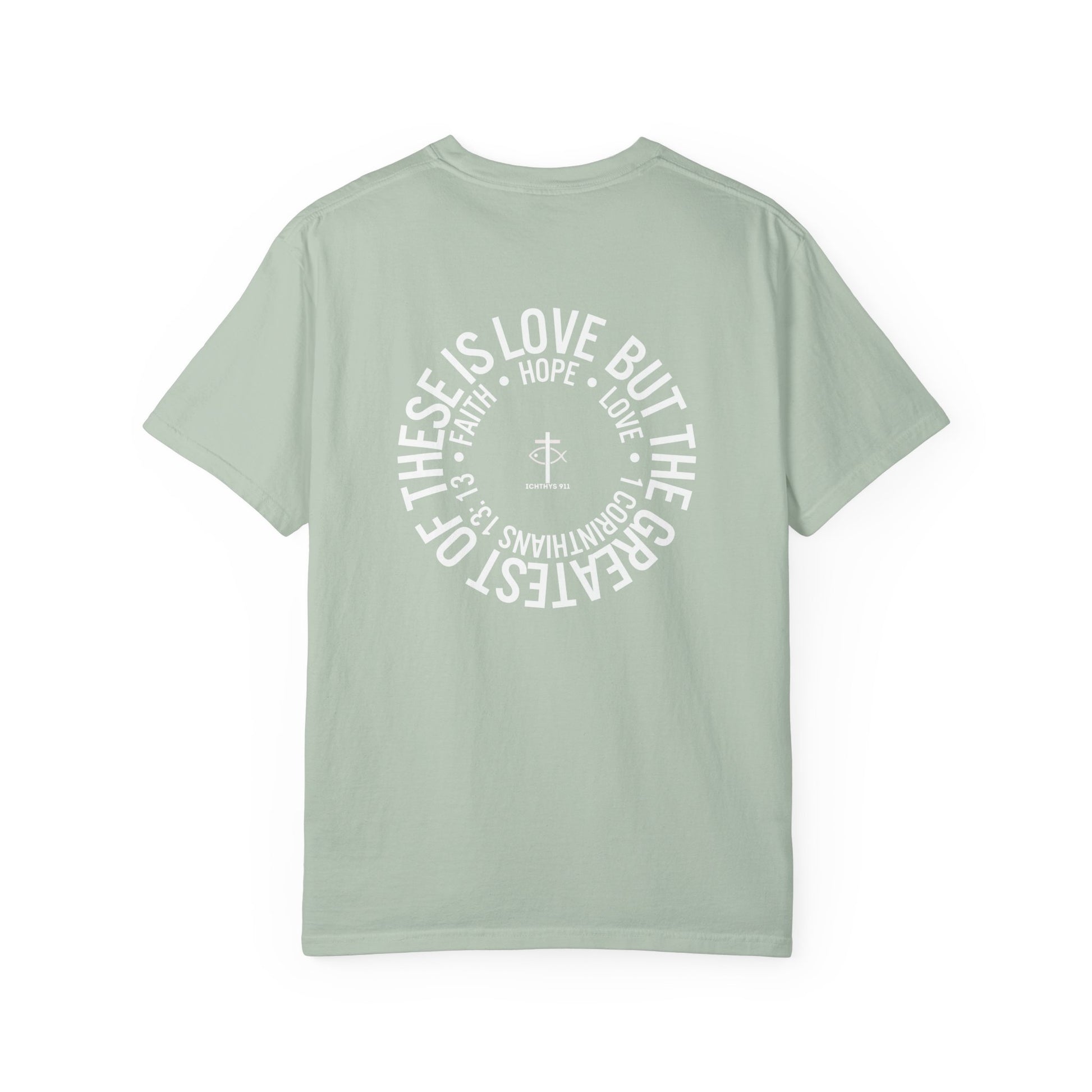 ICHTHYS 911 - White Font "Faith, Hope, & Love" - Garment Dyed - 100% US Cotton - Unisex T-Shirt - Men T-Shirt - Christian Women Tee - Faith-Inspired Shirt - Christian Fashion - Wear Your Faith - Additional Colors